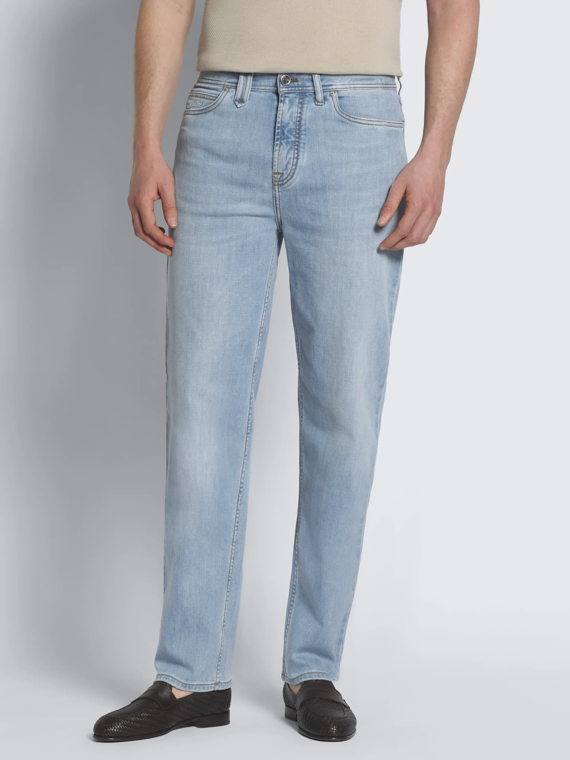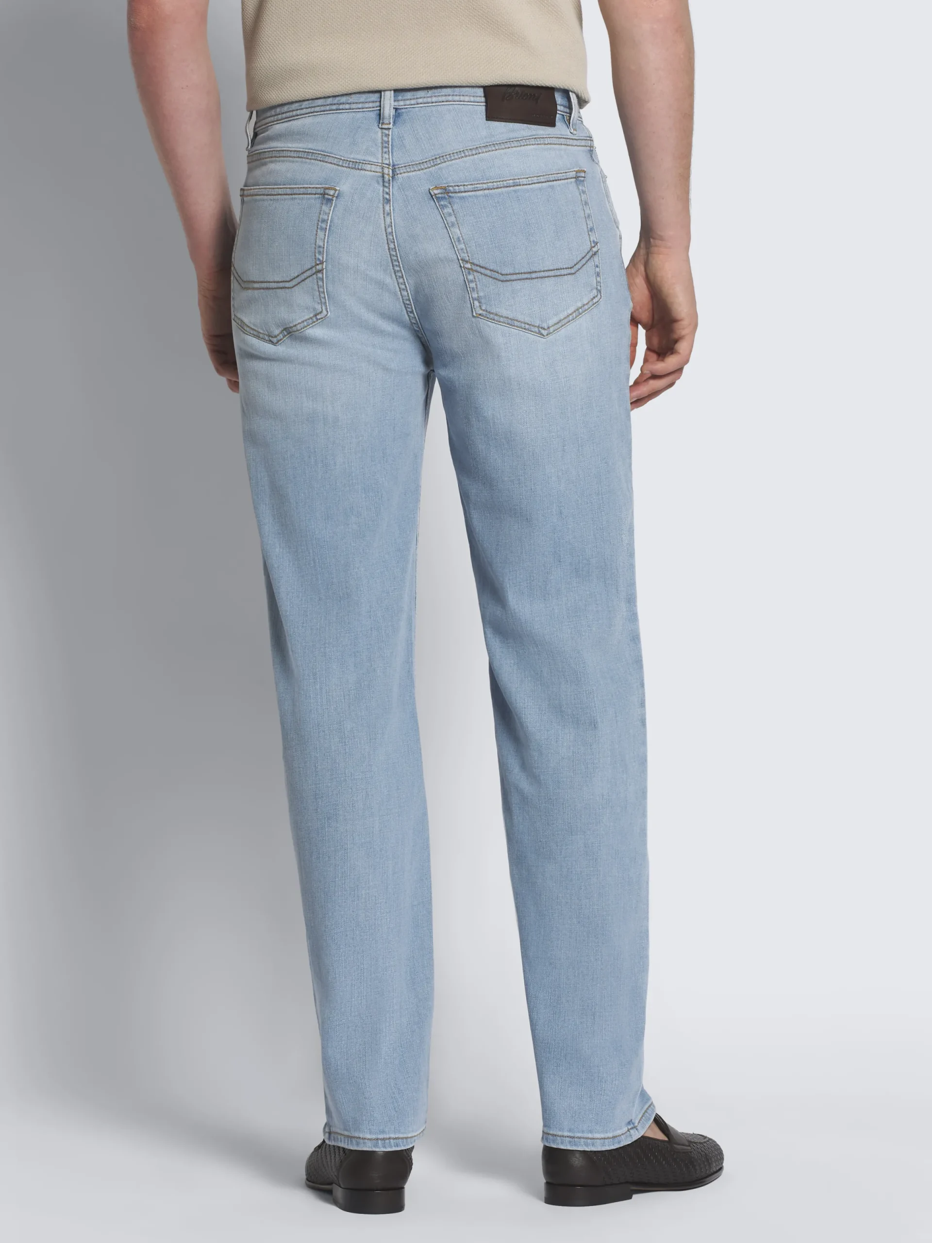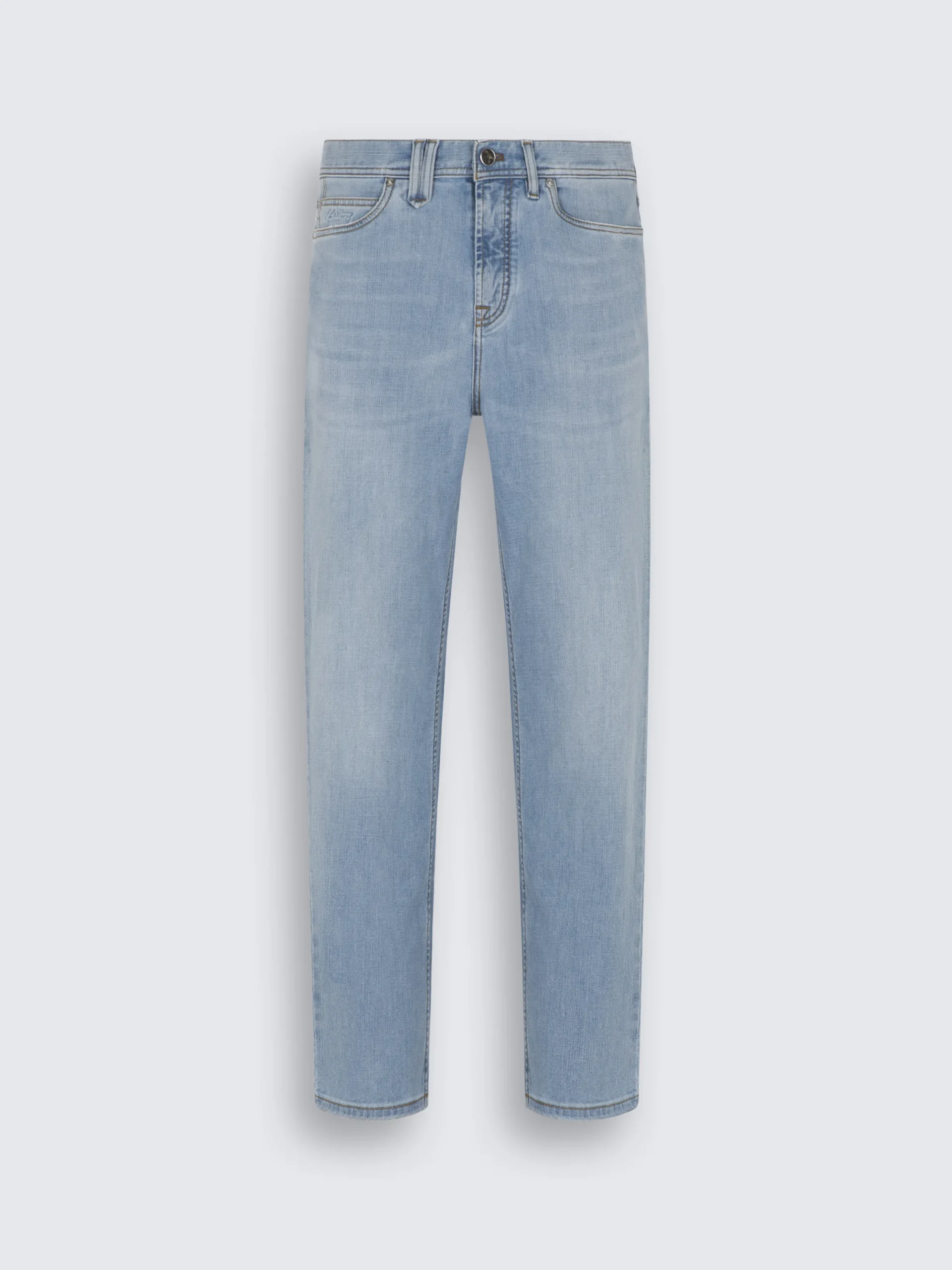 Light blue stretch cotton Merano jeans. Featuring five pockets with a logo on one, steel rivets, leather branded detail on the back and a metal « B » logo on one back pocket. Two screwable and interchangeable buttons are provided for the front closure, one in horn and one in silver. The straight leg provides it a more contemporary fit, perfect to create everyday leisure attires.nThis garment contains GOTS certified cotton. The Global Organic Textile Standard (GOTS) is a voluntary standard obtained by verification through independent third-parties. Practices include requirements on environmental management and wastewater; protection of health, safety and rights of employees; avoidance of hazardous substances .