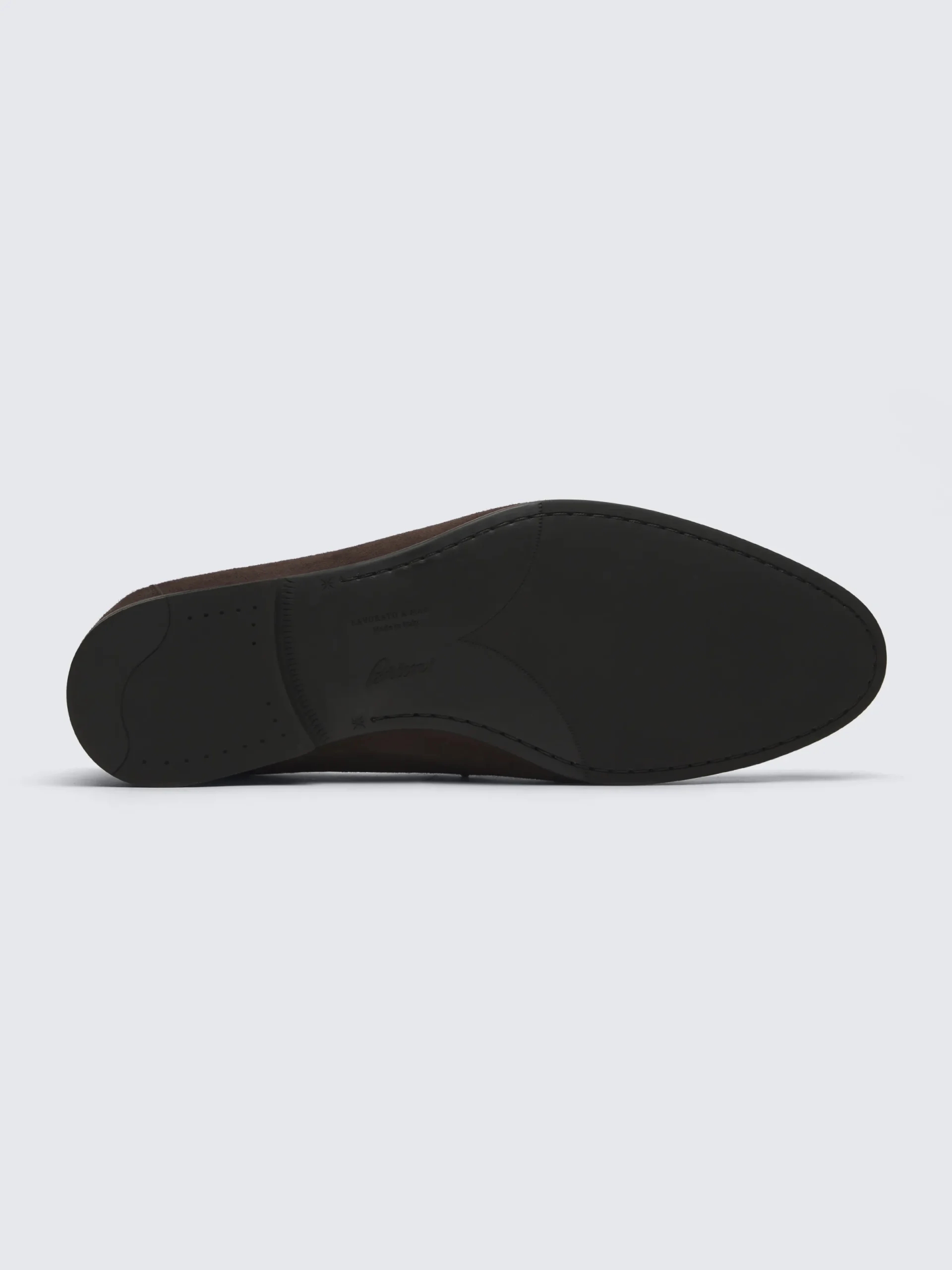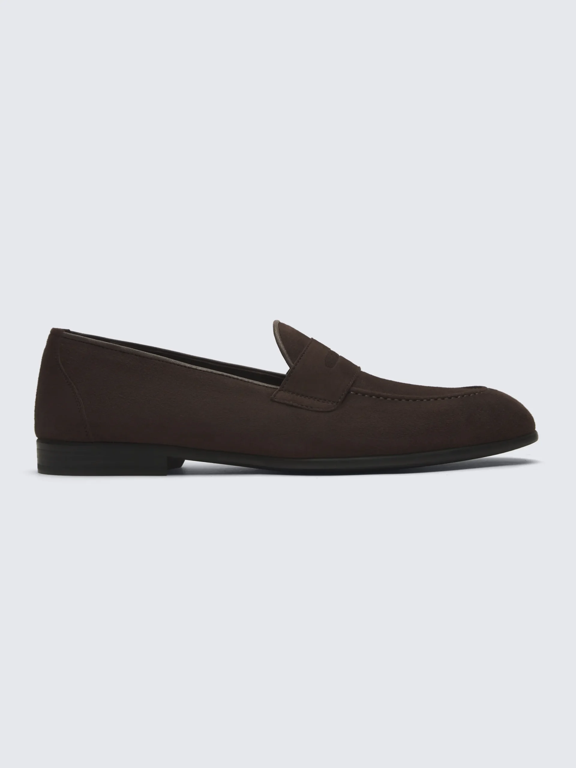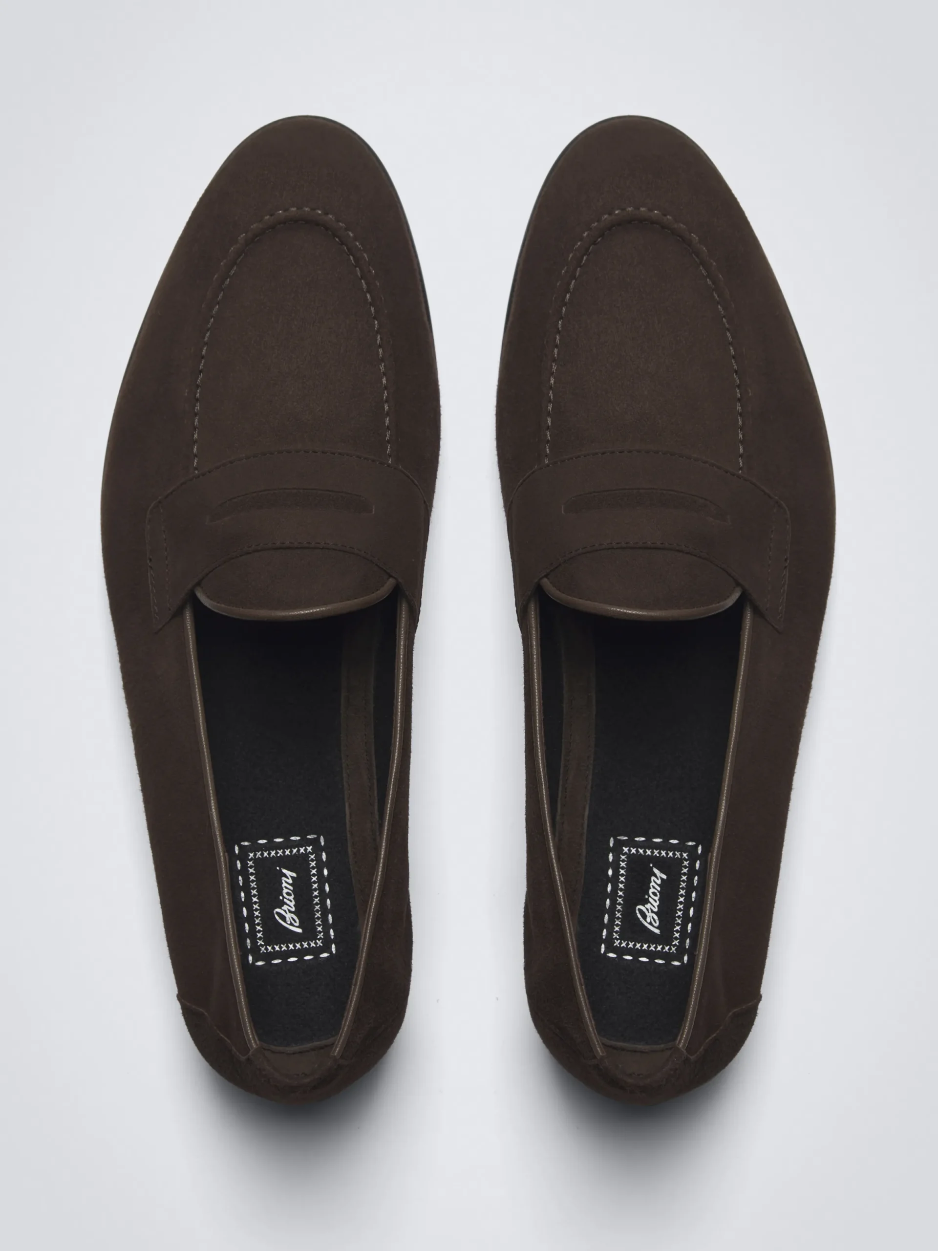Dark brown suede Appia penny loafers, an epitome of elegance. Realized in a classic almond shape with extra flexibility in the rubber sole, resulting in a refined look with unparalleled comfort. Named after the extensive Roman road, the shoe was born as a challenge for the classic moccasin to suit long walks. A timeless rounded shape complements the natural movement of the foot. An elegant icon that fits like a glove.