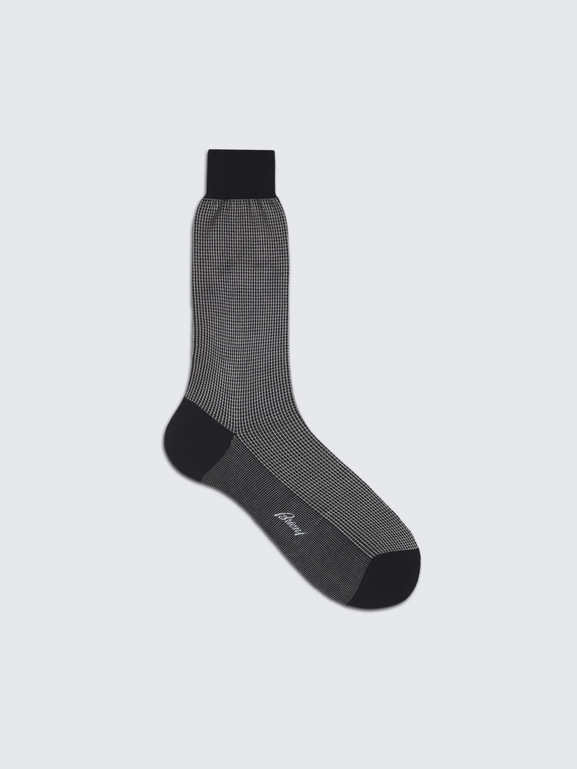 Navy blue and beige micro motif cotton and silk socks. Featuring a Brioni logo on the bottom, these mid-calf socks are both soft and breathable: an essential piece in every gentleman wardrobe. The perfect final touch for a polished and sophisticated outfit.