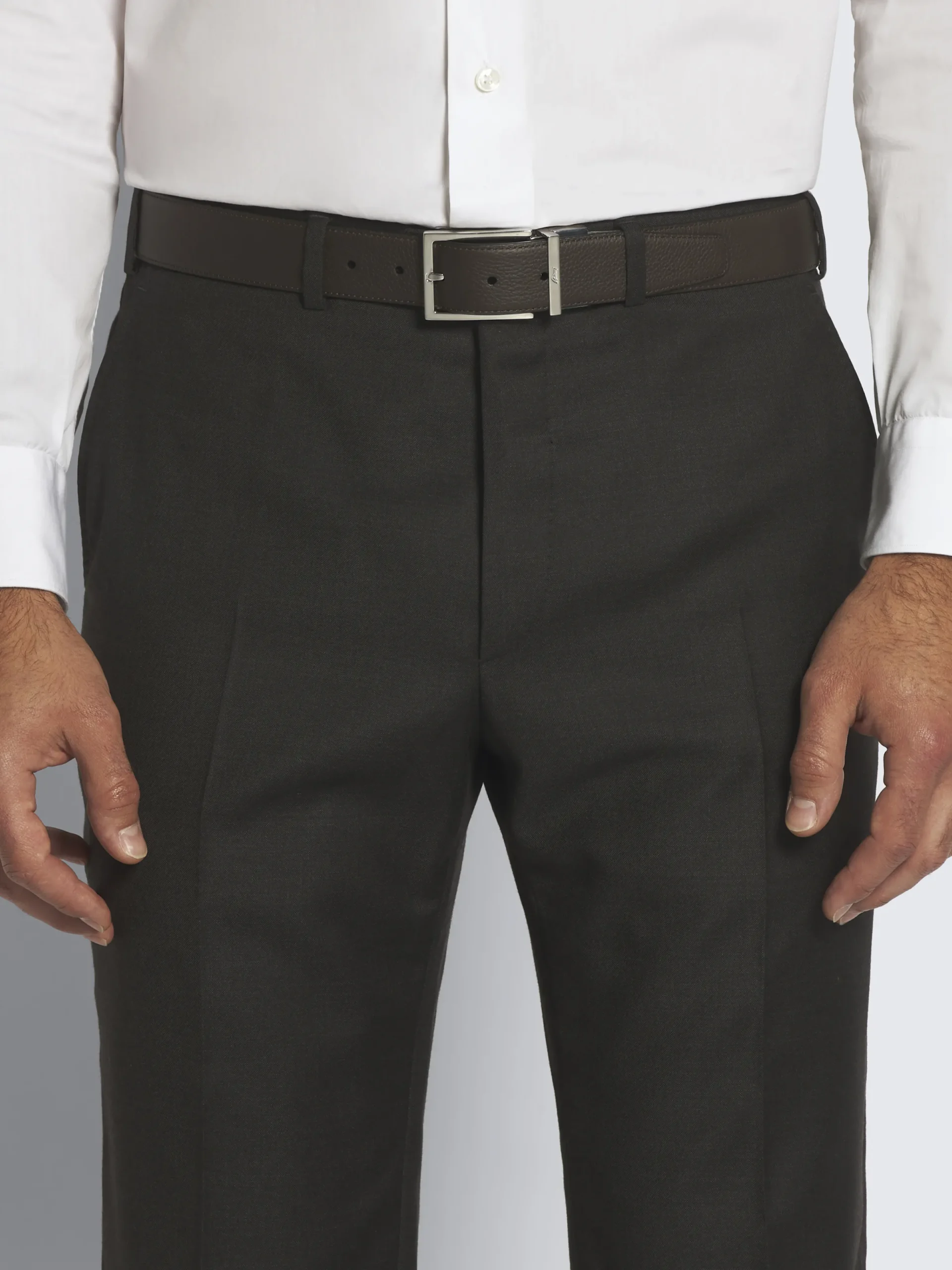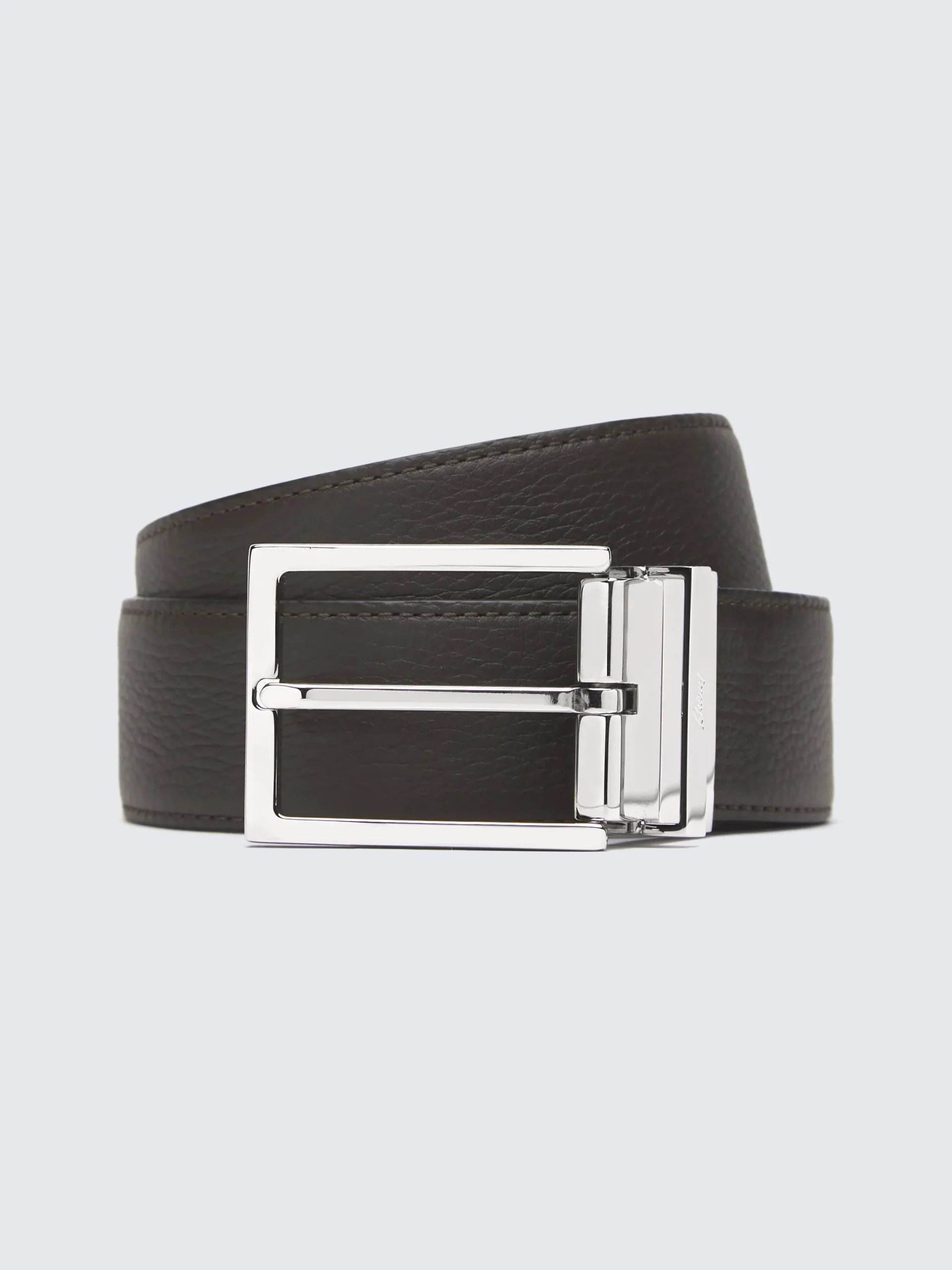 Dark brown and black grained and nappa calfskin reversible belt. Featuring a palladium finished brass buckle and hand tinted sides, classic yet iconic, this piece will accompany you for years to come.
