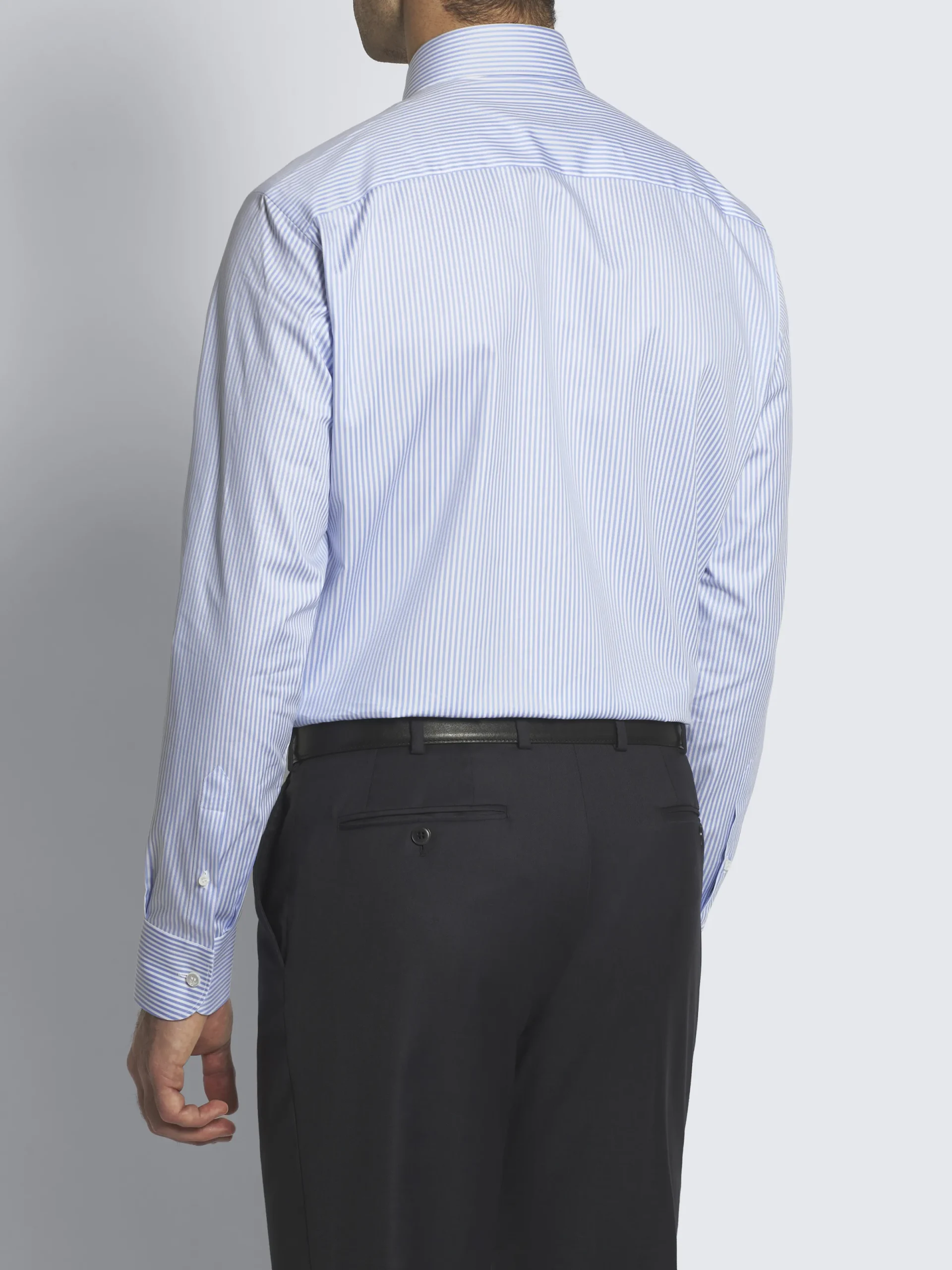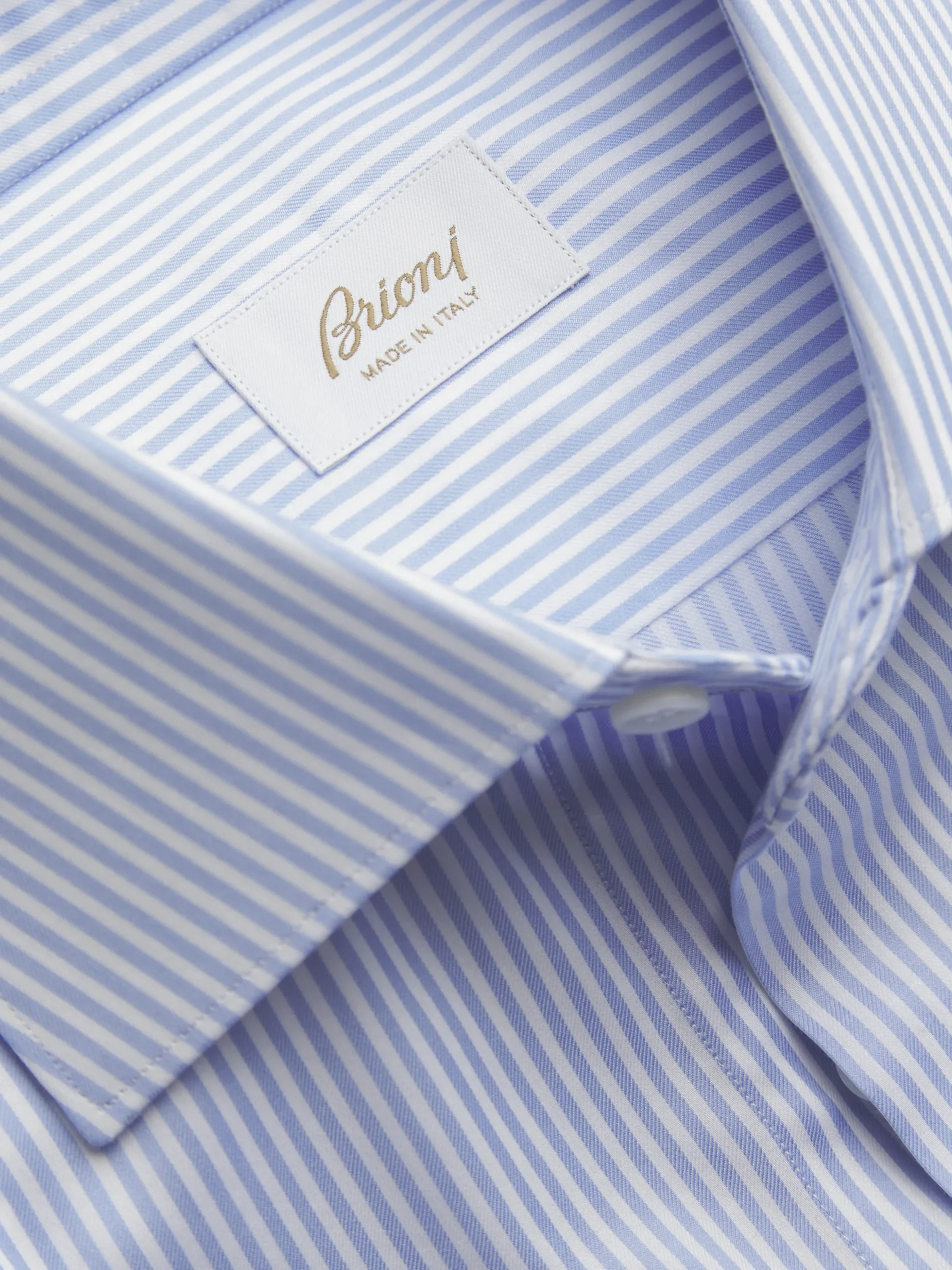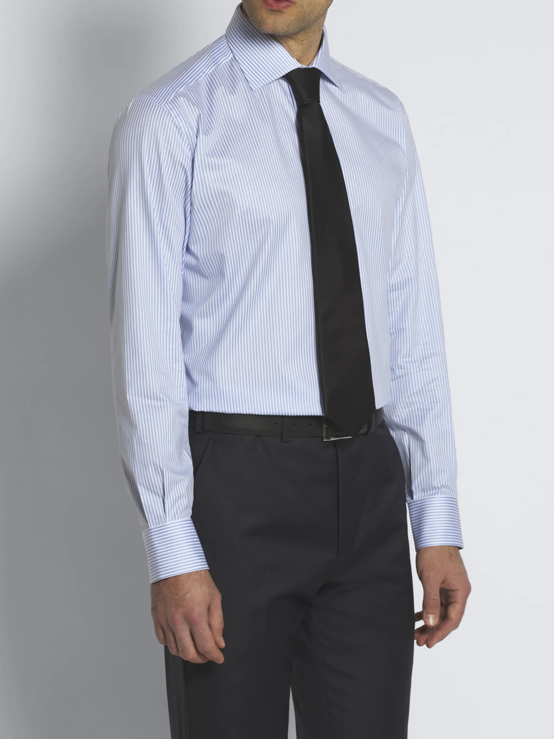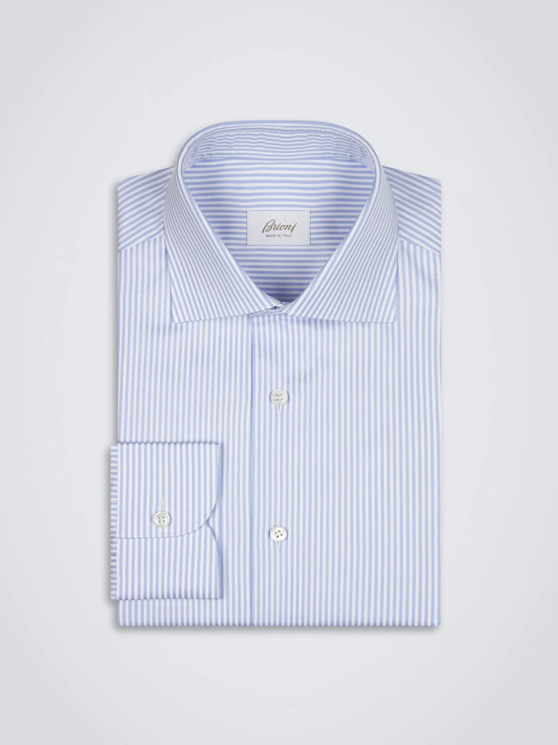 White and sky blue striped organic cotton formal shirt. Featuring a regular fit, rounded cuffs, mother of pearl buttons and without front placket. Sleek and sophisticated, it is perfect to be worn with a tie. A true wardrobe staple.nThis garment contains GOTS certified cotton. The Global Organic Textile Standard (GOTS) is a voluntary standard obtained by verification through independent third-parties. Practices include requirements on environmental management and wastewater; protection of health, safety and rights of employees; avoidance of hazardous substances.