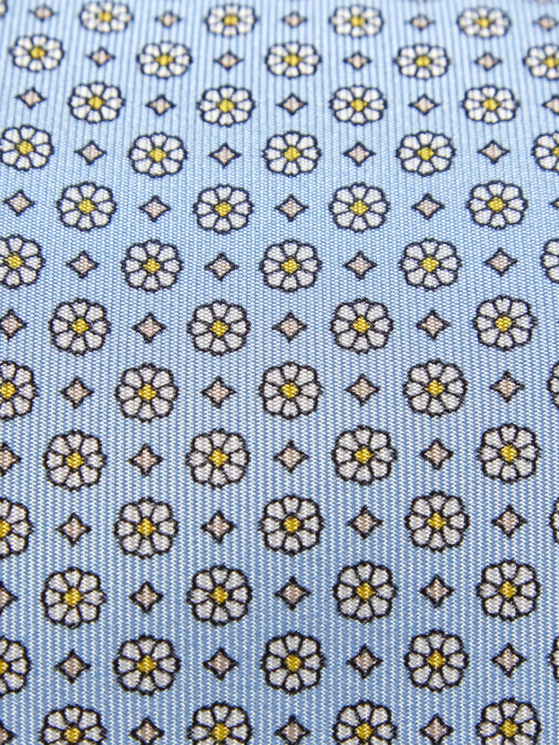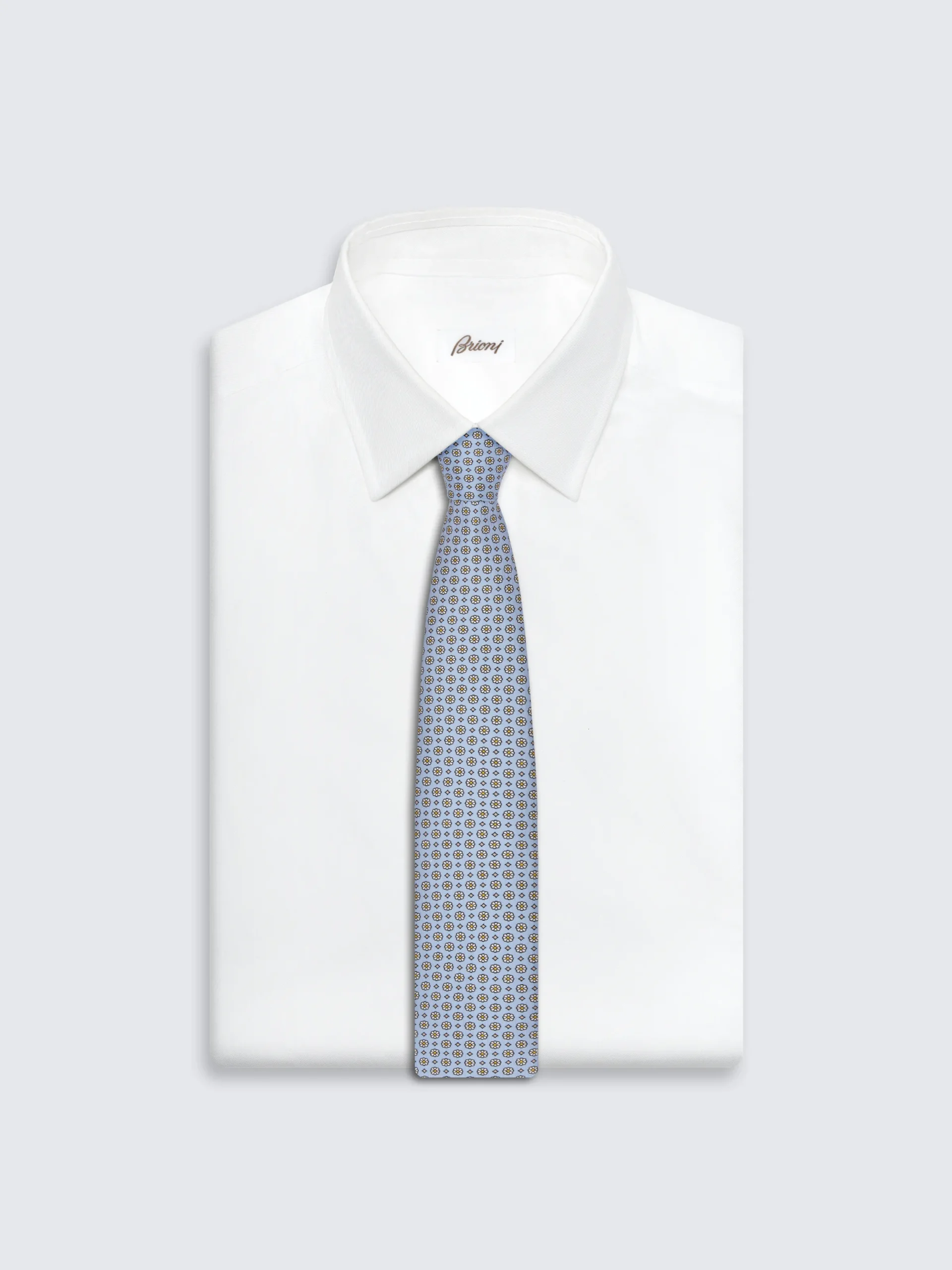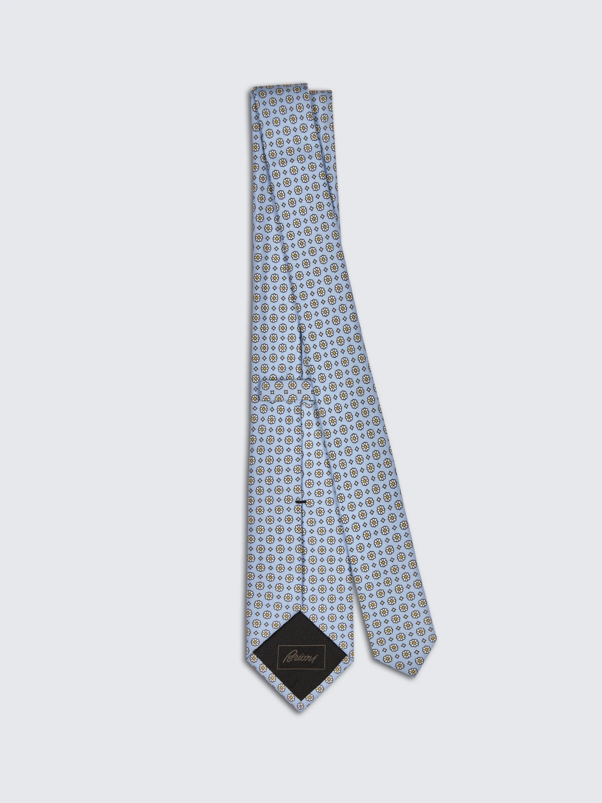 Light blue and yellow micro motif silk tie. Brioni ties are the epitome of elegance, handmade from the finest materials. Featuring an internal wool canvas that keeps it structured over time, single internal thread running along the entire length, and silk jacquard lining with Brioni logo. Perfect to be paired with a white shirt and a formal jacket for a chic and modern look.