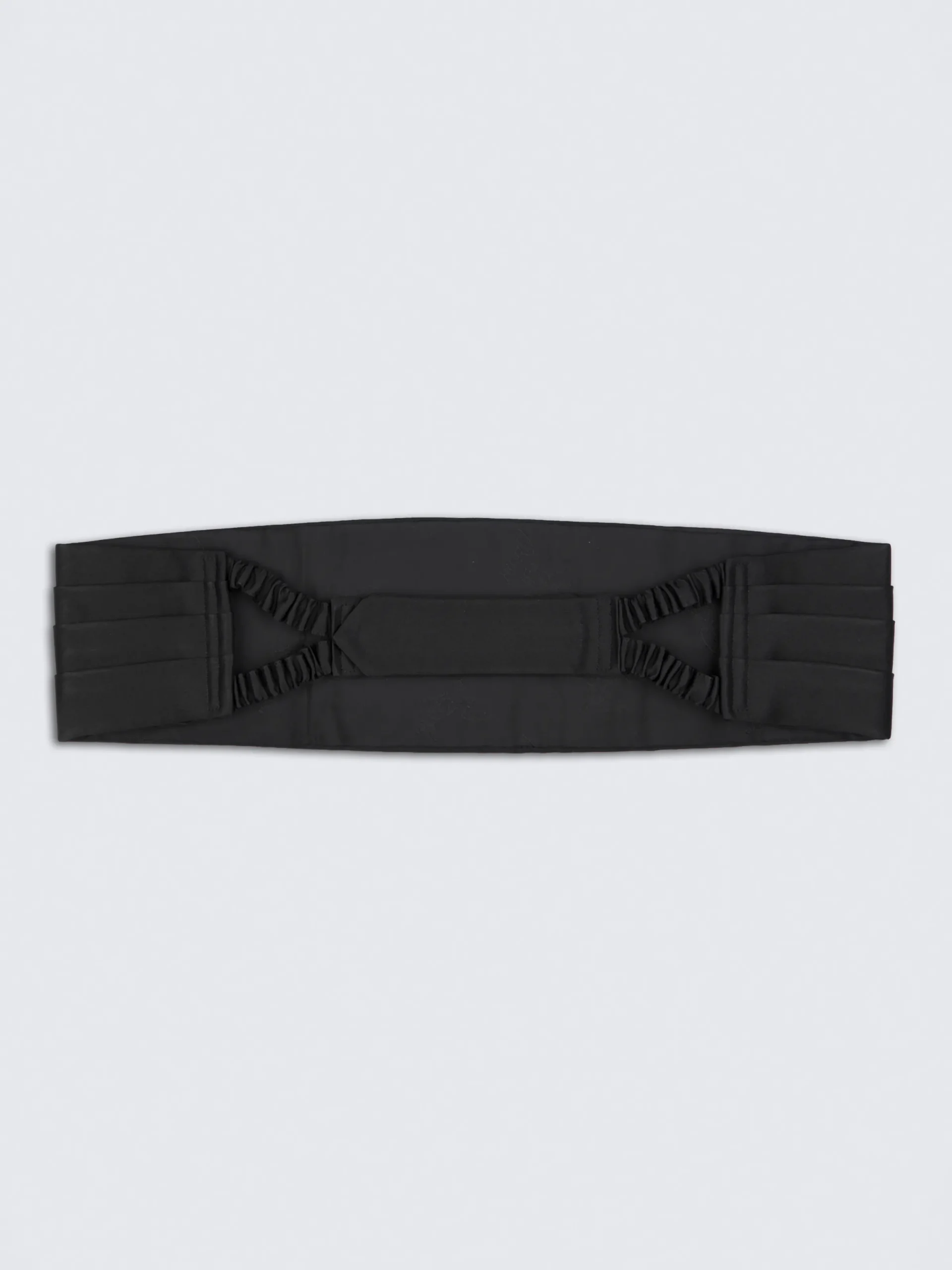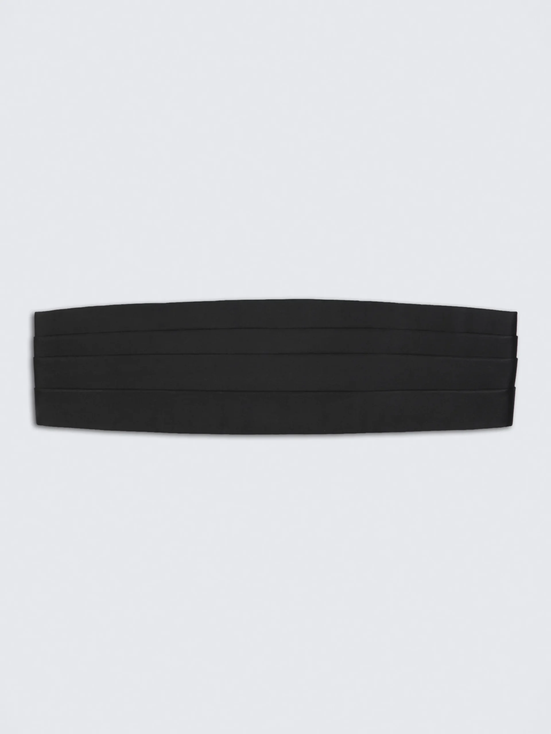 Essential black four pleats cummerbund in satin silk. This elegant accessory is the perfect finishing touch to a classic tuxedo.