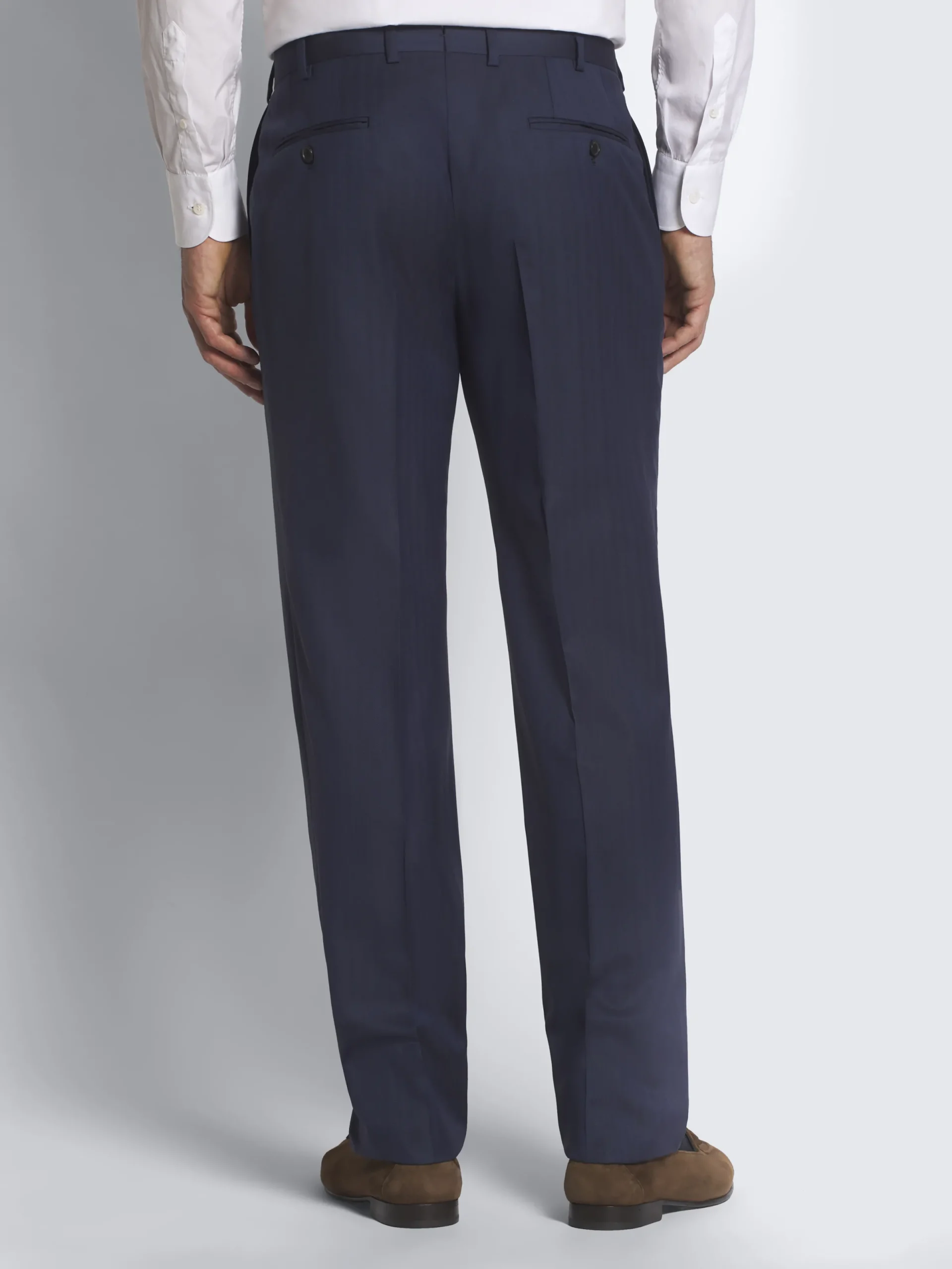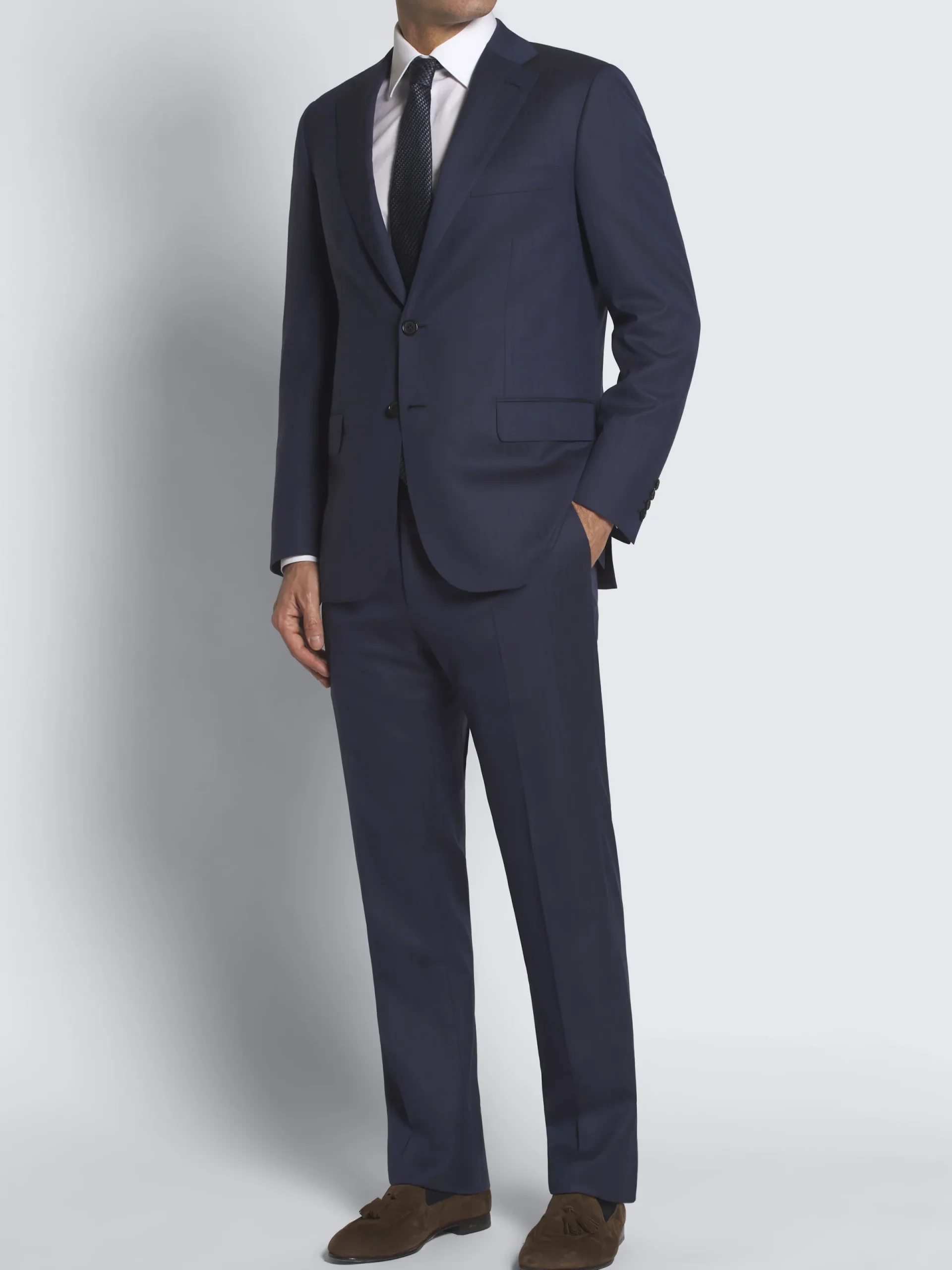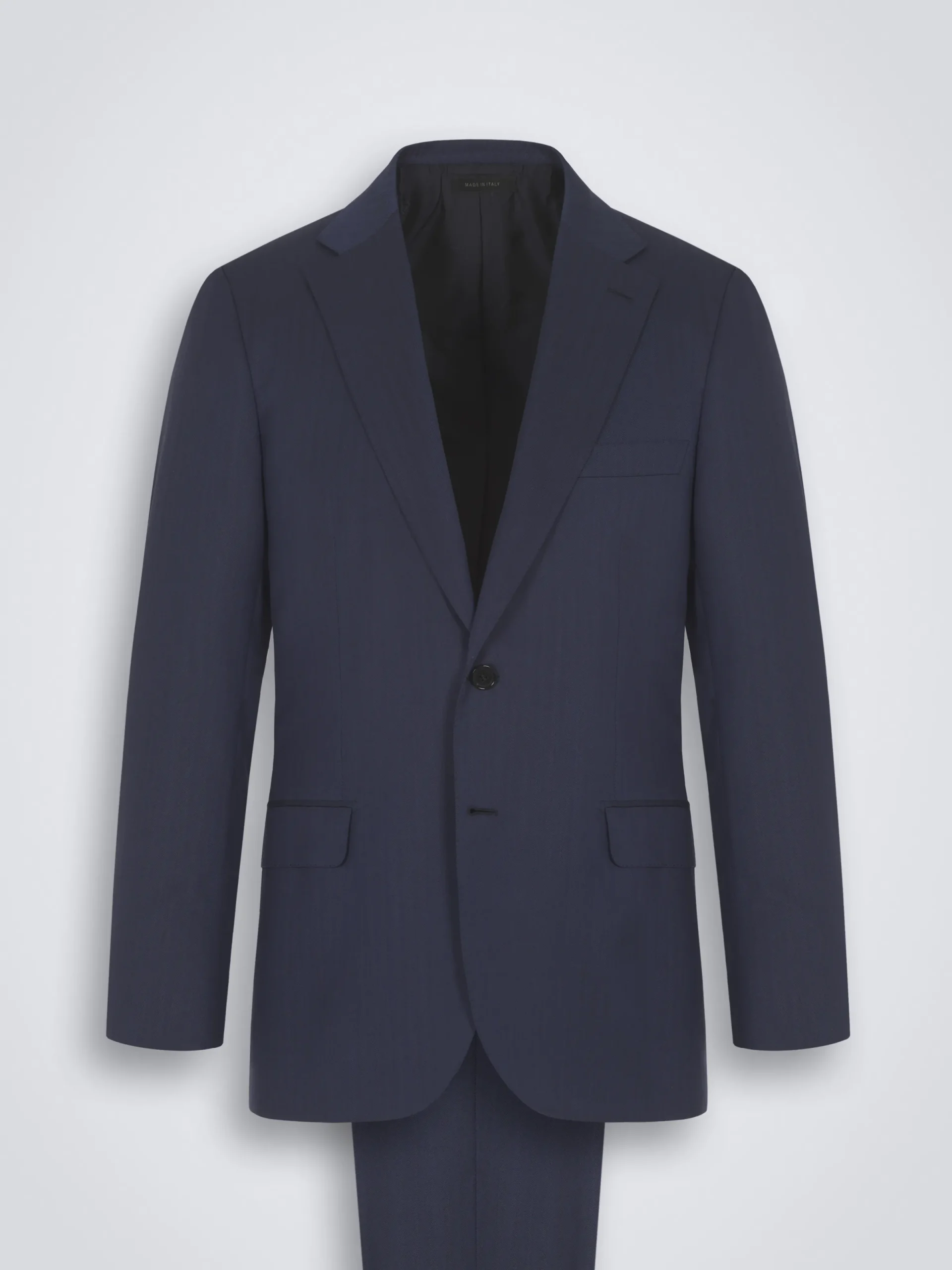 Navy blue herringbone Super 150’s responsible wool Brunico suit, featuring notch lapels, two buttons, flap pockets and two back vents. Since its launch in 2010, the Brunico suit has become a staple. With its classic fit and construction entirely by hand, it’s the expression of Brioni tailoring excellence.nnThis garment contains RWS wool. The Responsible Wool Standard (RWS) is a voluntary standard obtained by verification through independent third-parties. RWS farmers and ranchers are evaluated against animal welfare, land management, and social requirements set in the standard.