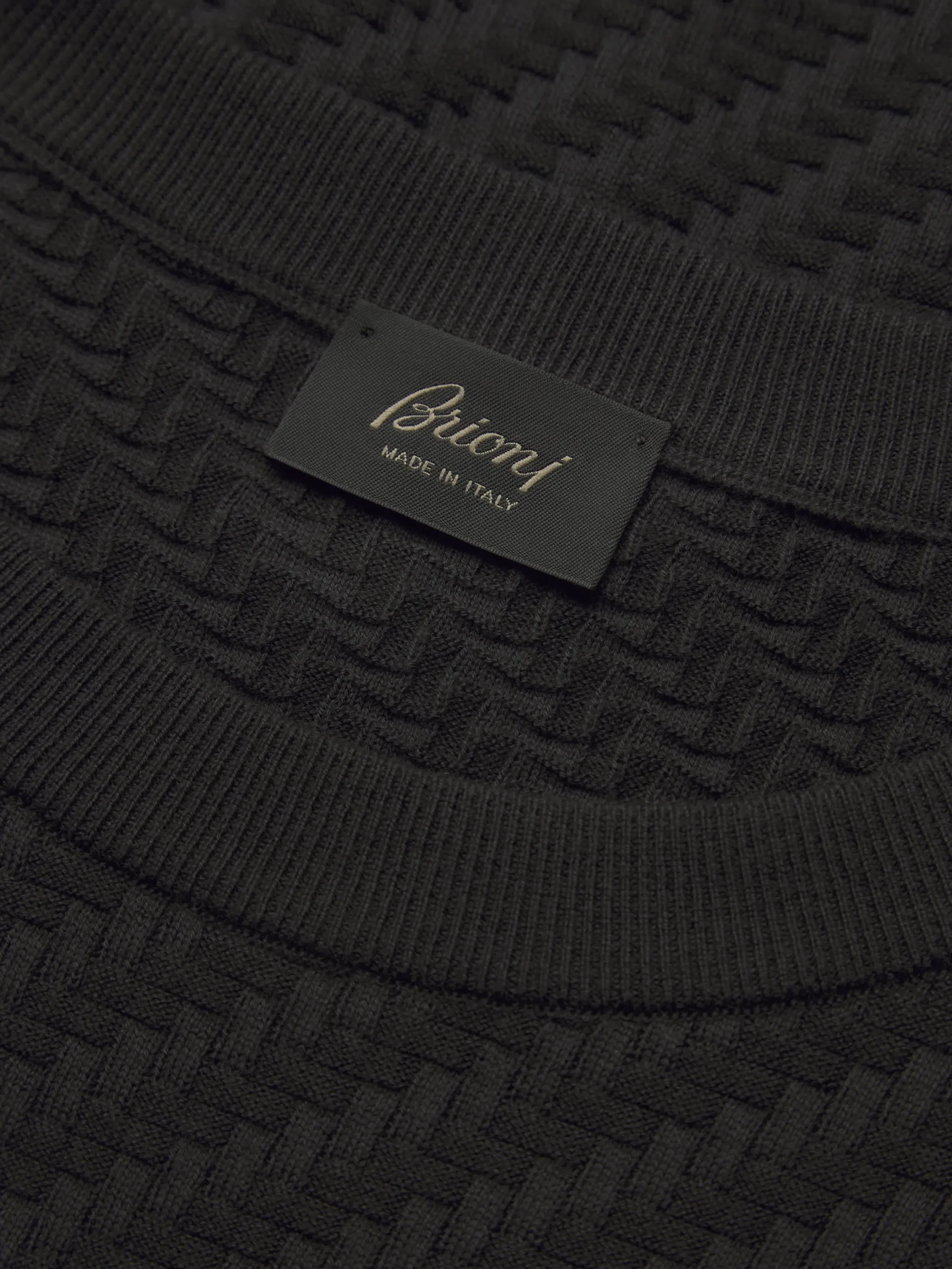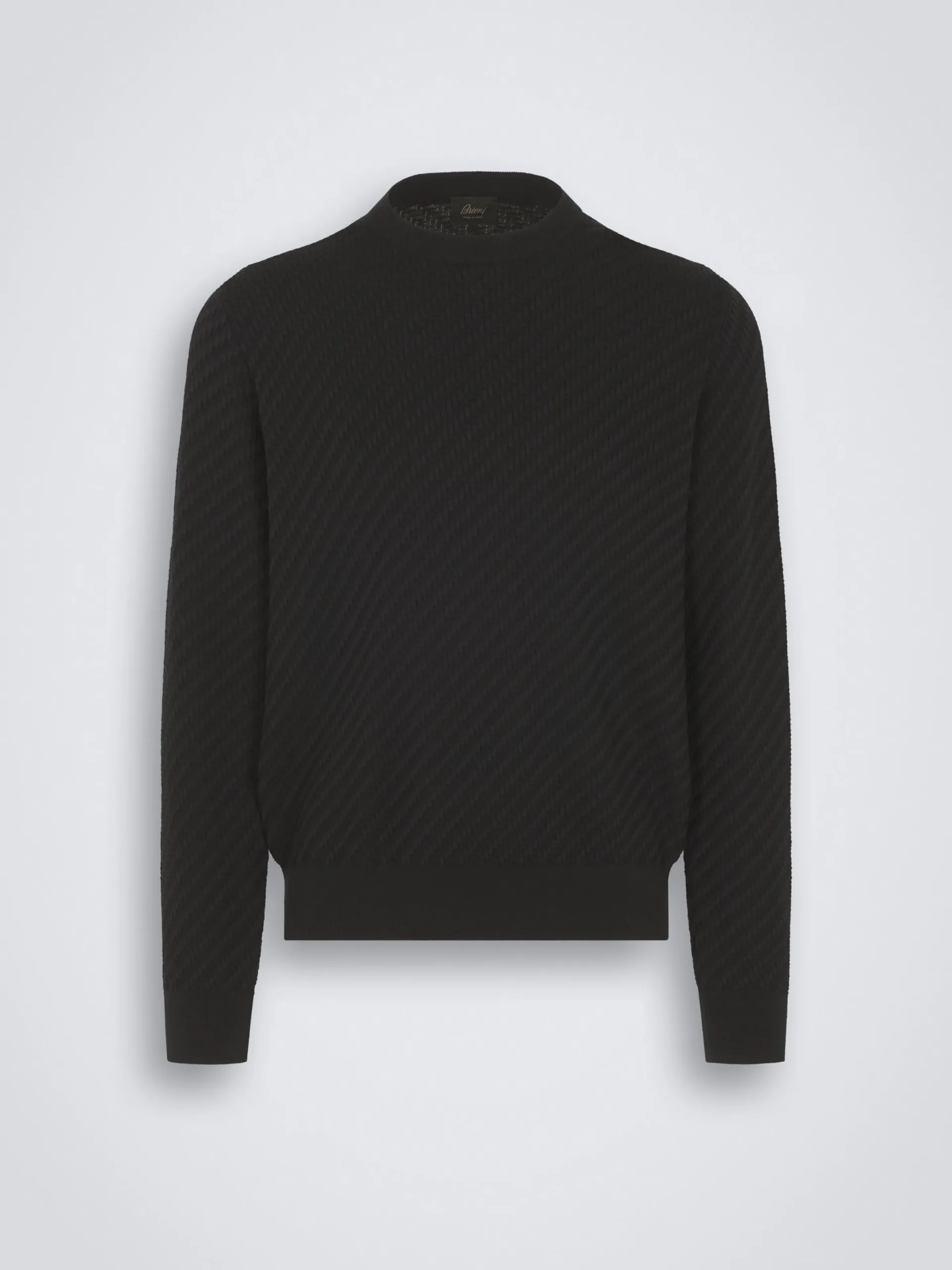Black crewneck sweater with long sleeves in organic cotton, silk and cashmere. Its soft hand feel and comfortable fit make it perfect to be worn year-round and it matches perfectly with formal and semi-formal attire.nThe Trama weave features tone-on-tone ribs for a uniquely subtle, tactile feeling. This pattern mimics the San Pietrini, the cobbled stones characterizing the streets of Rome. An iconic motif drawn from the eternal city itself. This garment contains GOTS certified cotton. The Global Organic Textile Standard (GOTS) is a voluntary standard obtained by verification through independent third-parties. Practices include requirements on environmental management and wastewater; protection of health, safety and rights of employees; avoidance of hazardous substances.