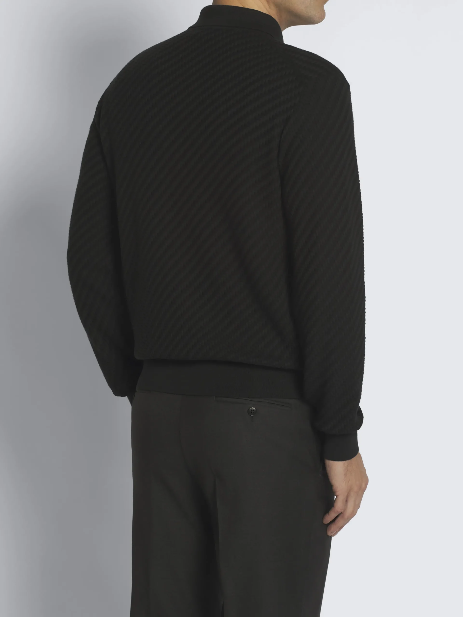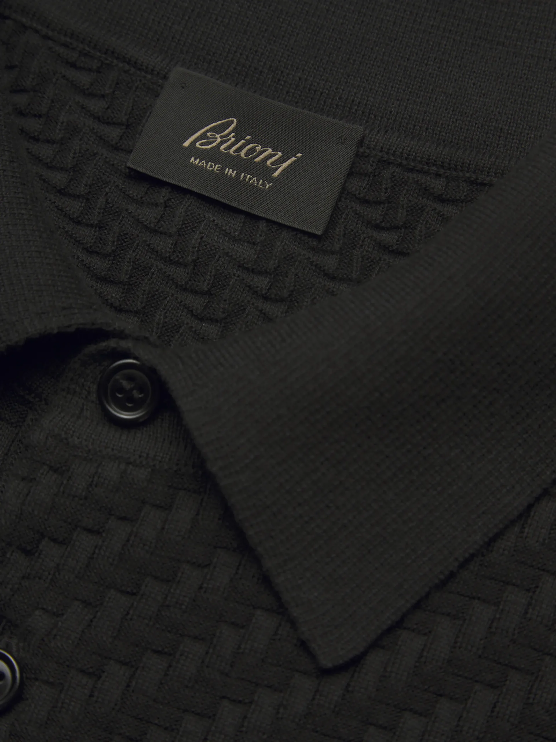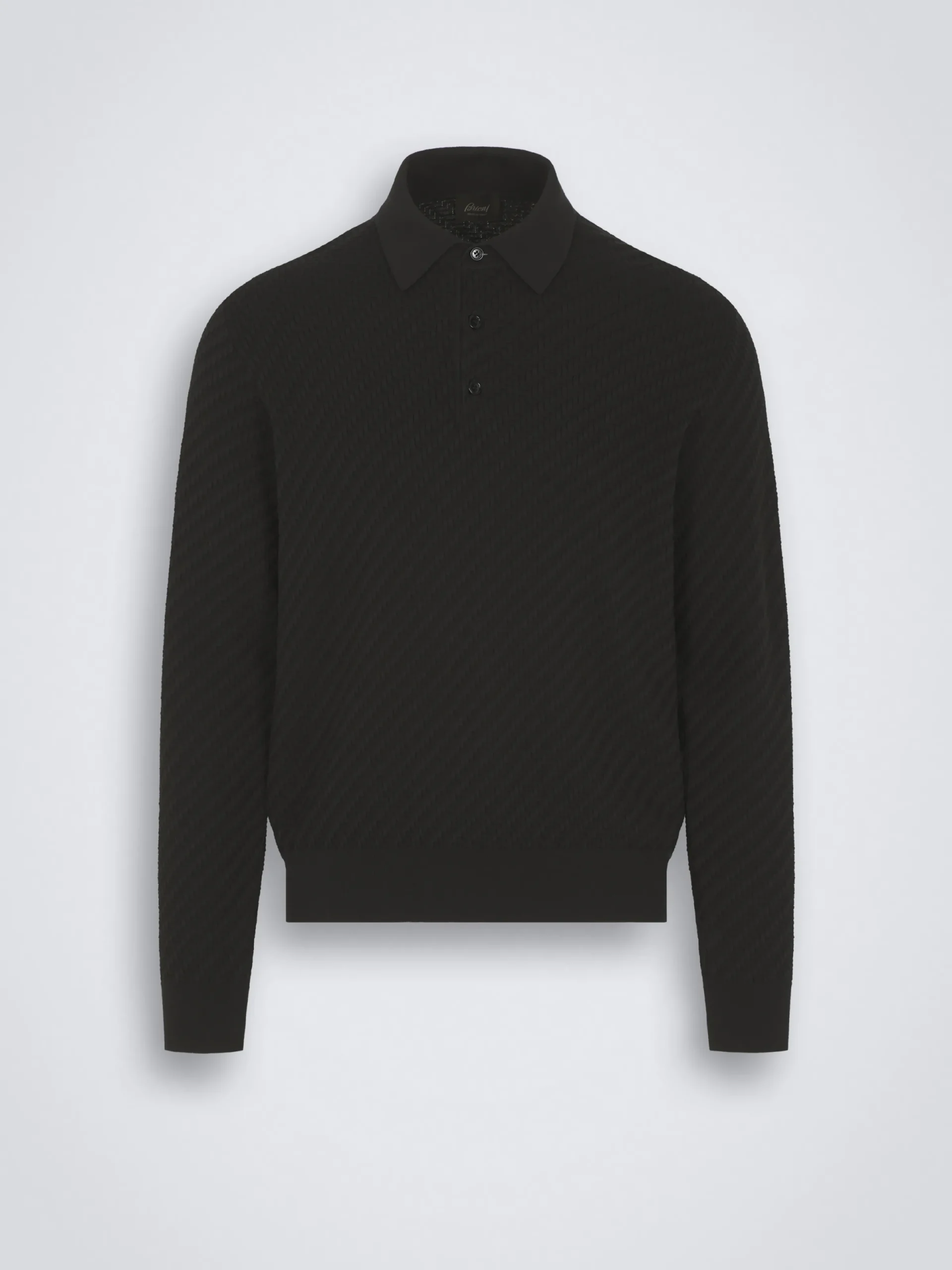 Black long-sleeved polo sweater in organic cotton, silk and cashmere with three mother of pearl buttons. Its comfortable fit and soft knit make it perfect for year-round use. It matches perfectly with formal and semi-formal attire.nThe Trama weave features tone-on-tone ribs for a uniquely subtle, tactile feeling. This pattern mimics the San Pietrini, the cobbled stones characterizing the streets of Rome. An iconic motif drawn from the eternal city itself. This garment contains GOTS certified cotton. The Global Organic Textile Standard (GOTS) is a voluntary standard obtained by verification through independent third-parties. Practices include requirements on environmental management and wastewater; protection of health, safety and rights of employees; avoidance of hazardous substances.