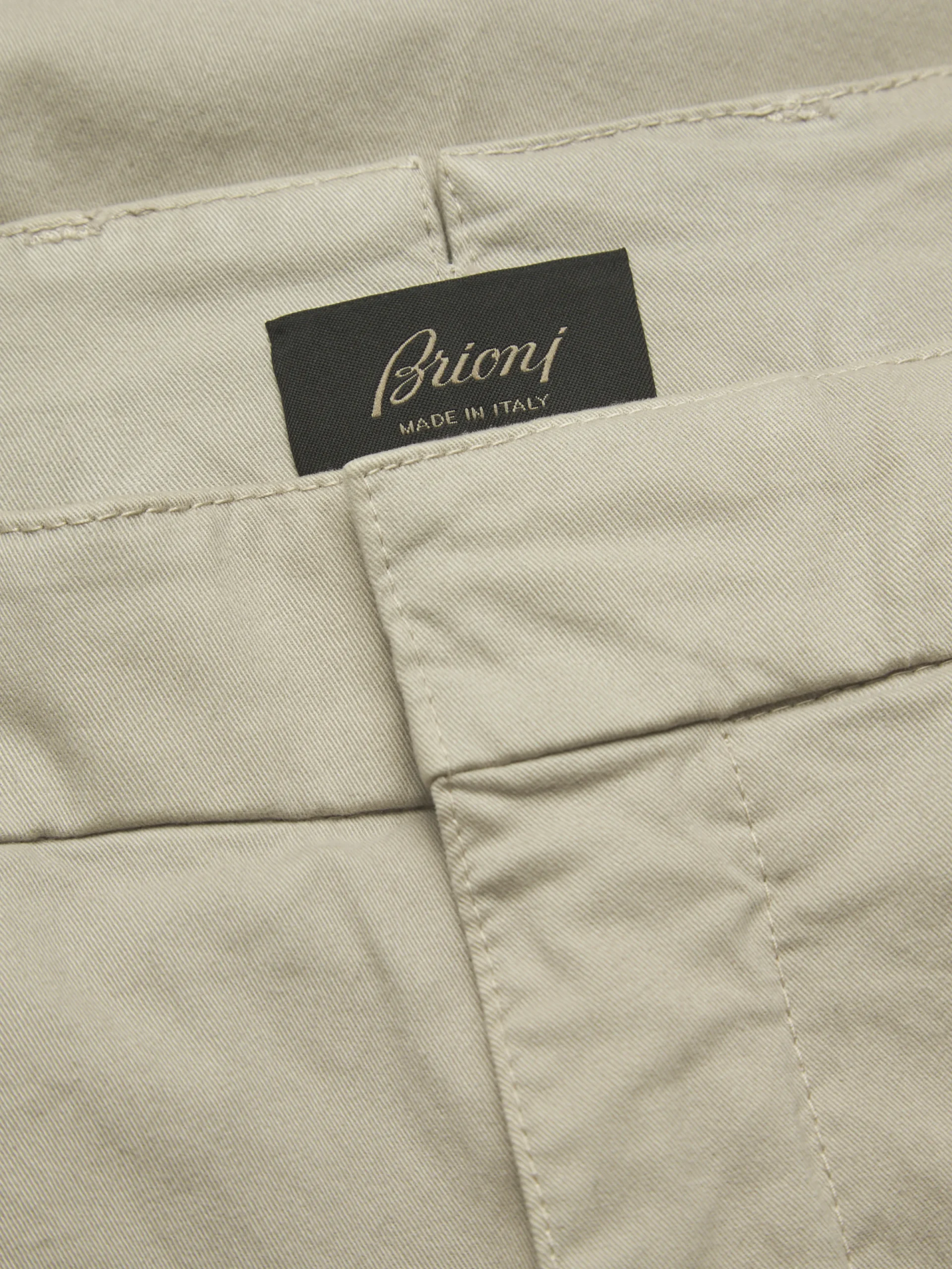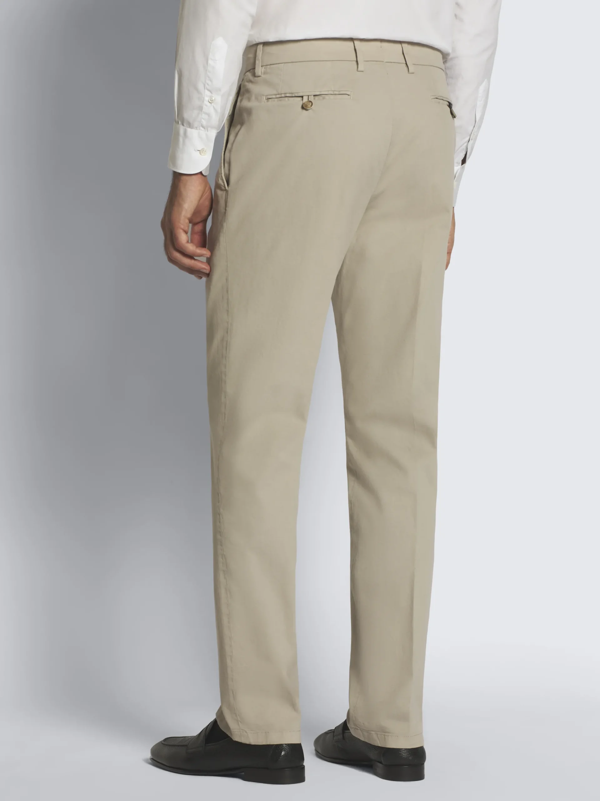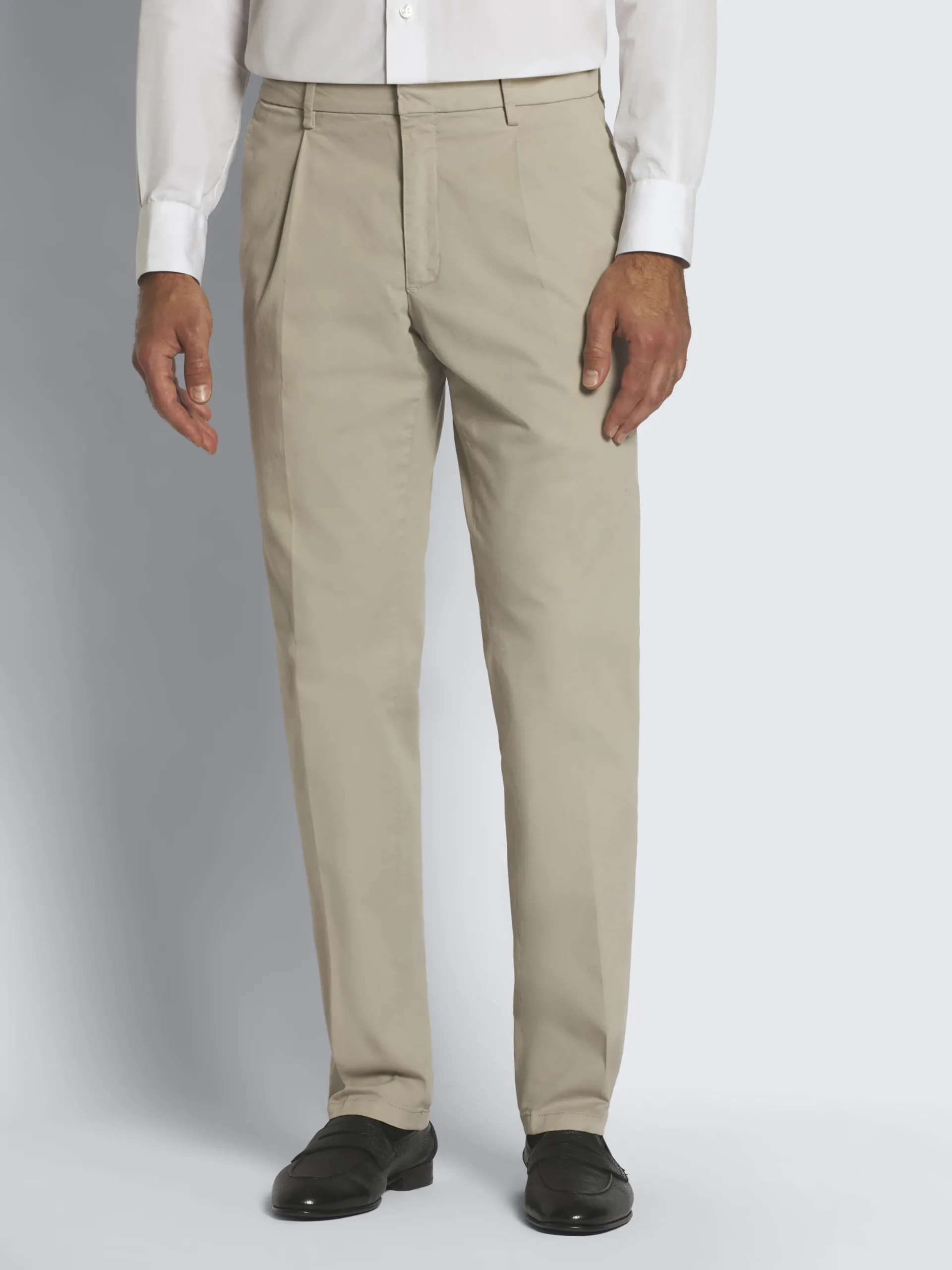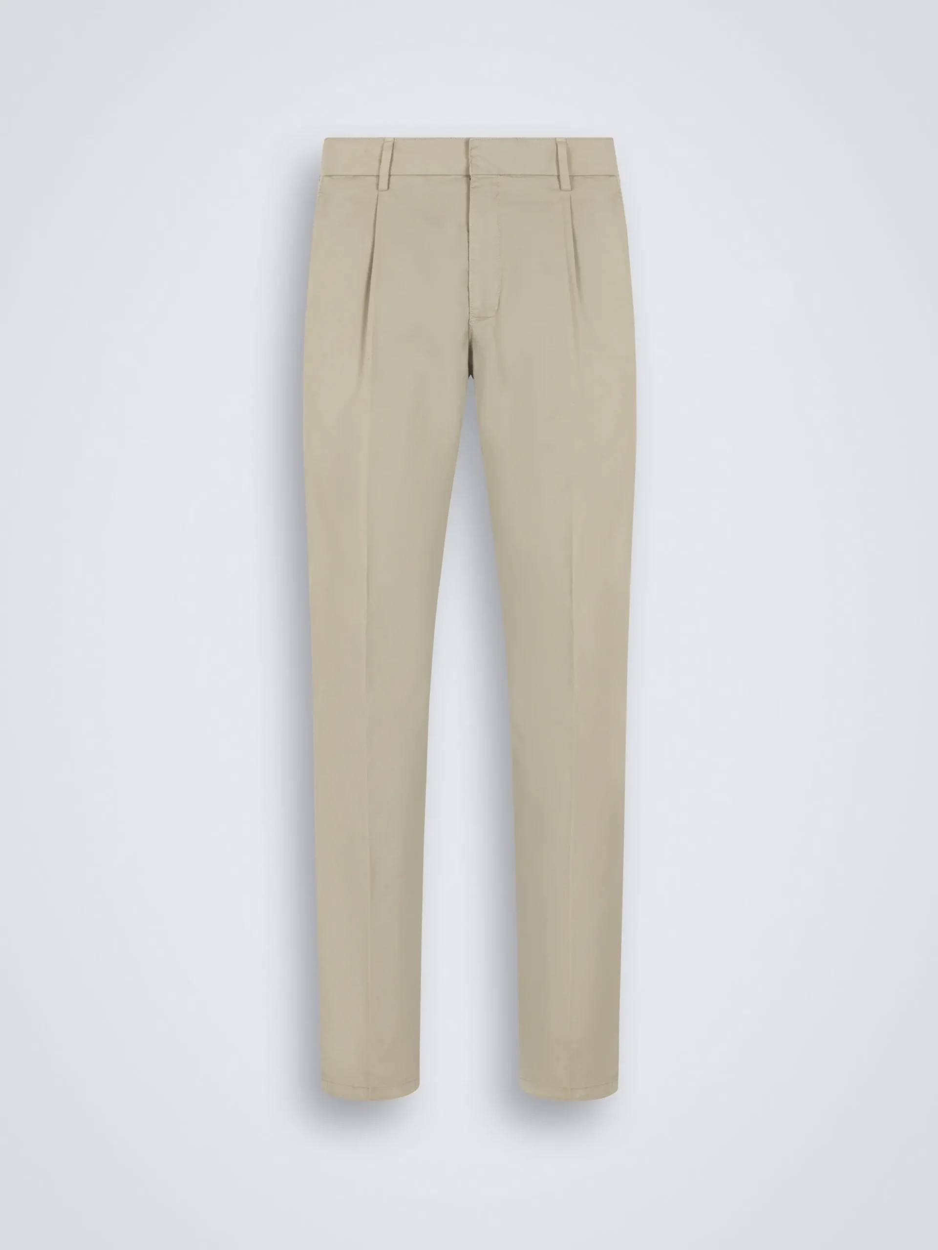 Beige organic stretch cotton Pienza trousers. Featuring a zip fly closure, single open pleats, two side slant pockets, two back pockets with button closure and regimental loop detail and belt loops. Ultra-versatile, these trousers are perfect paired with sneakers, suede loafers or even a derby for an effortlessly refined aesthetic.nThis garment contains GOTS certified cotton. The Global Organic Textile Standard (GOTS) is a voluntary standard obtained by verification through independent third-parties. Practices include requirements on environmental management and wastewater; protection of health, safety and rights of employees; avoidance of hazardous substances.