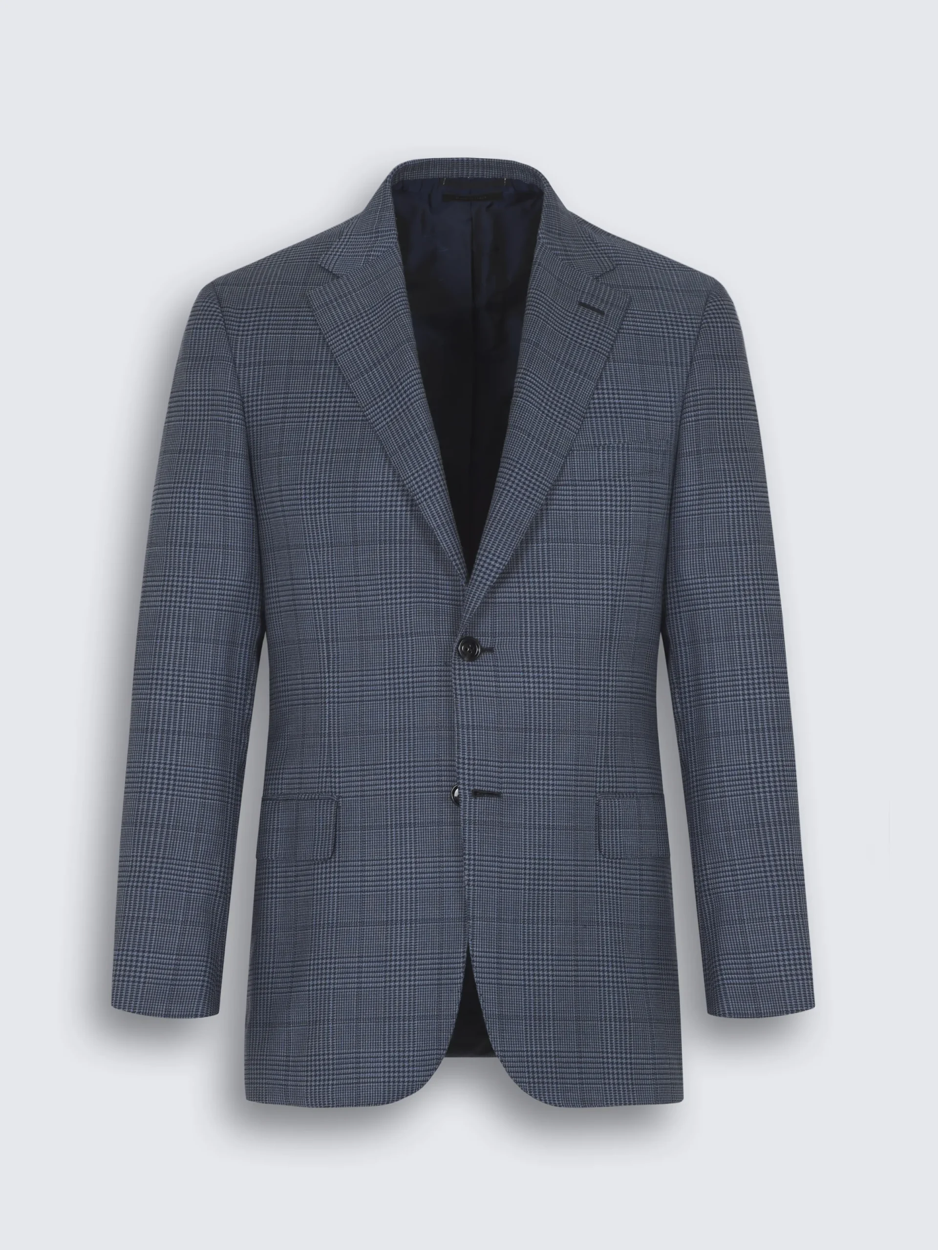 Steel blue glen plaid wool Ravello jacket. Featuring a regular fit, notch lapels, two back vents, one chest pocket, two flap pockets, two internal jet pockets and one internal pocket with button closure. Based on the classic Brunico model but with more relaxed and light shoulders, this jacket is the perfect addition to your formal wardrobe.