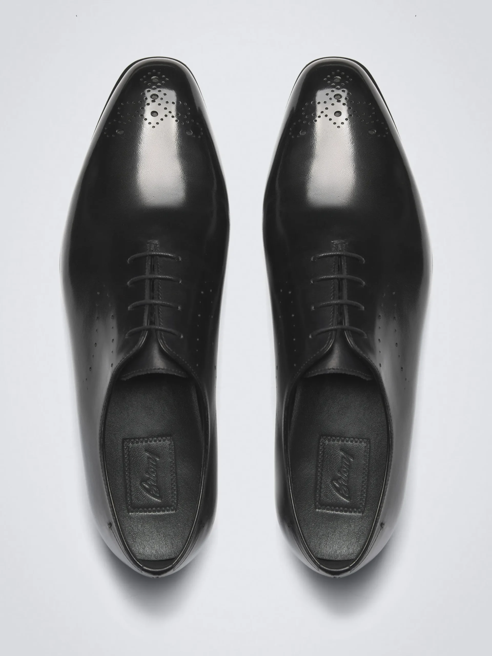 Black calfskin Elysium oxford shoes, featuring a hand painted upper made of a single piece of calfskin and handcrafted in Italy. The elegant tapered shape and clean lines make this item the ideal choice for your formal attires.