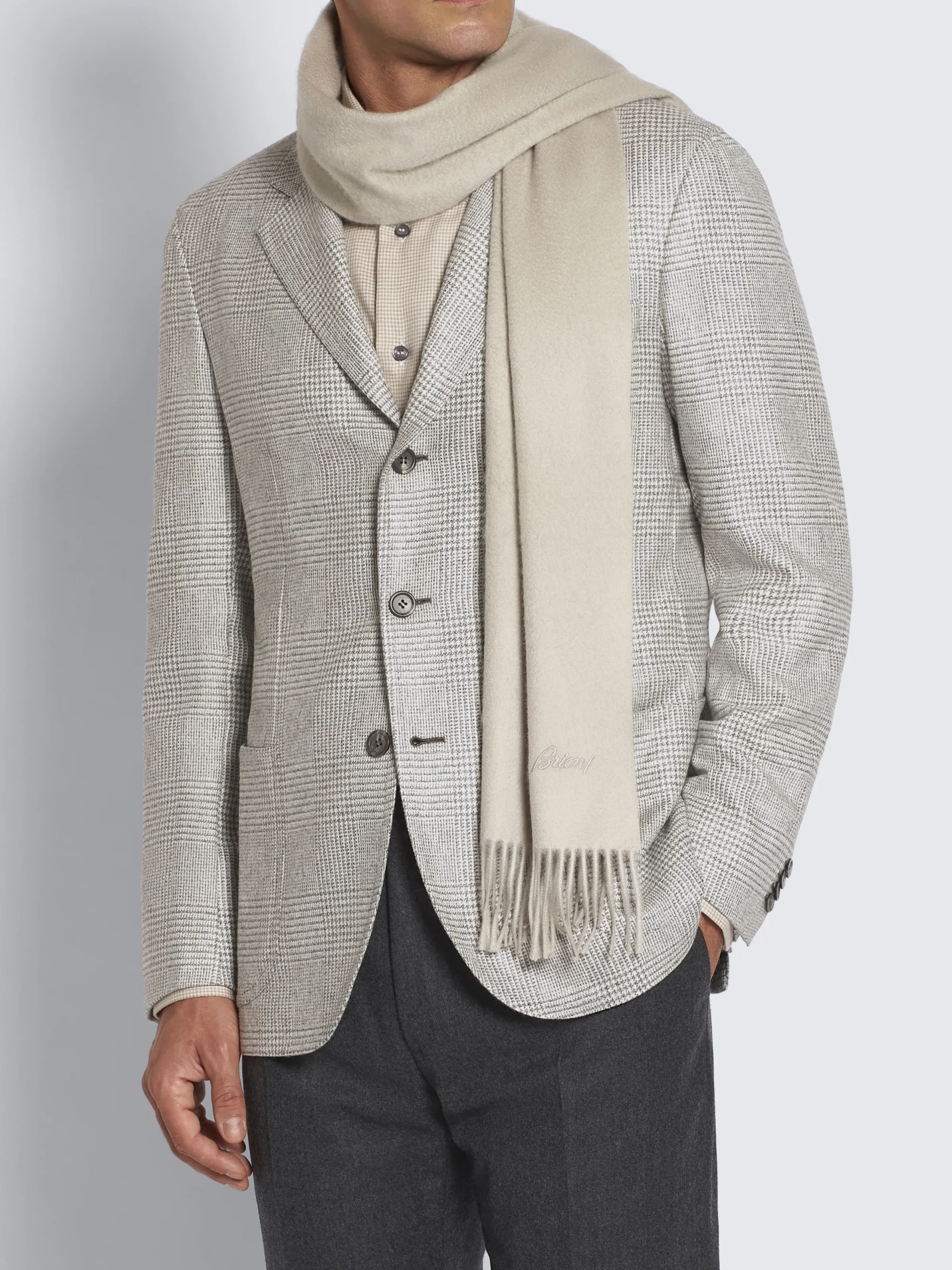 Beige scarf with fringes in cashmere, with regimental pattern all over. This classic accessory will add a contemporary t…