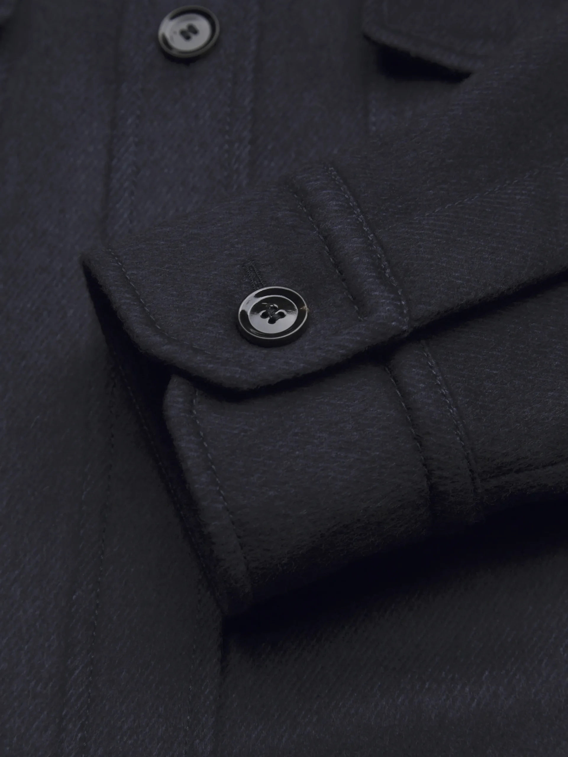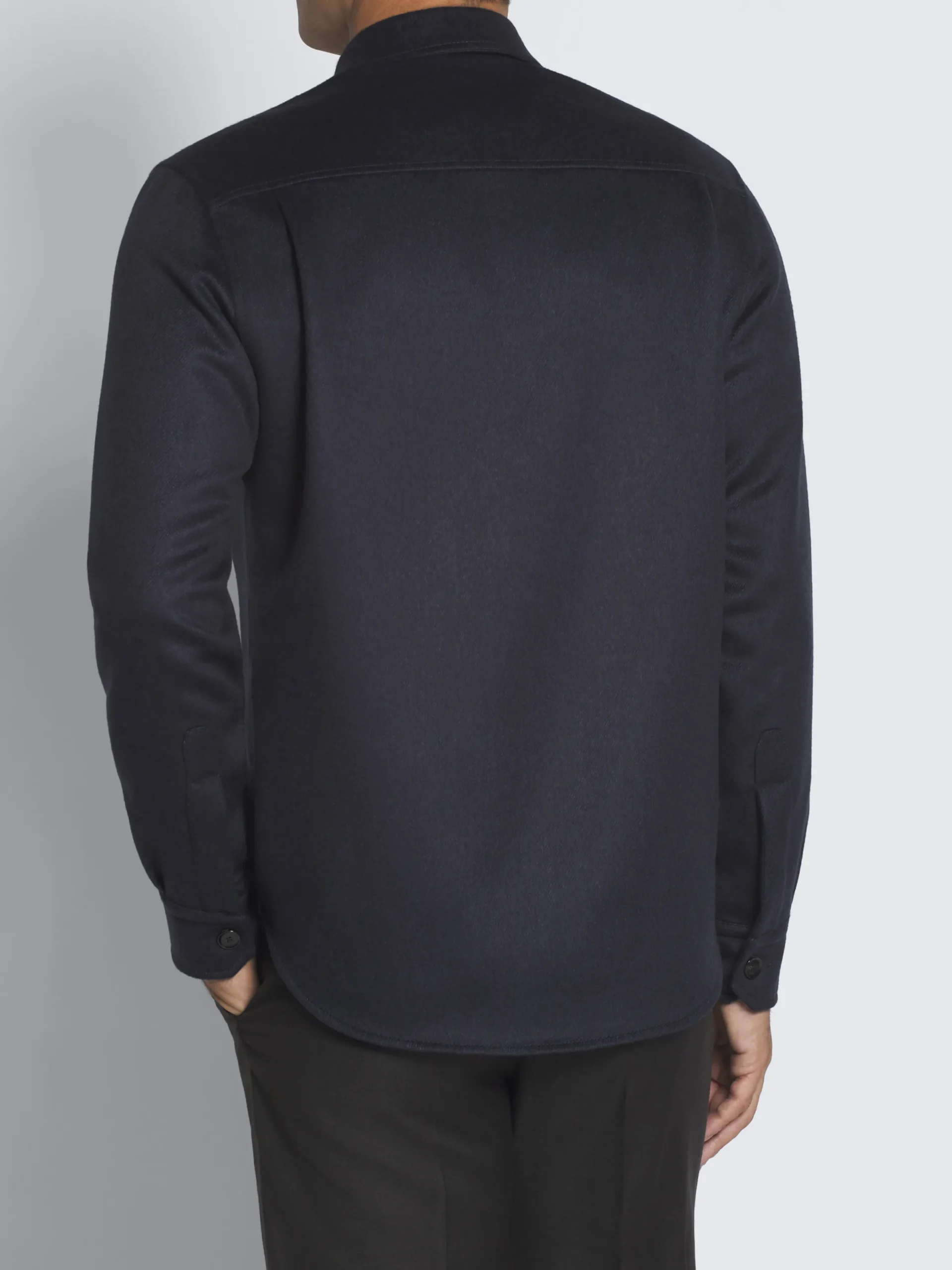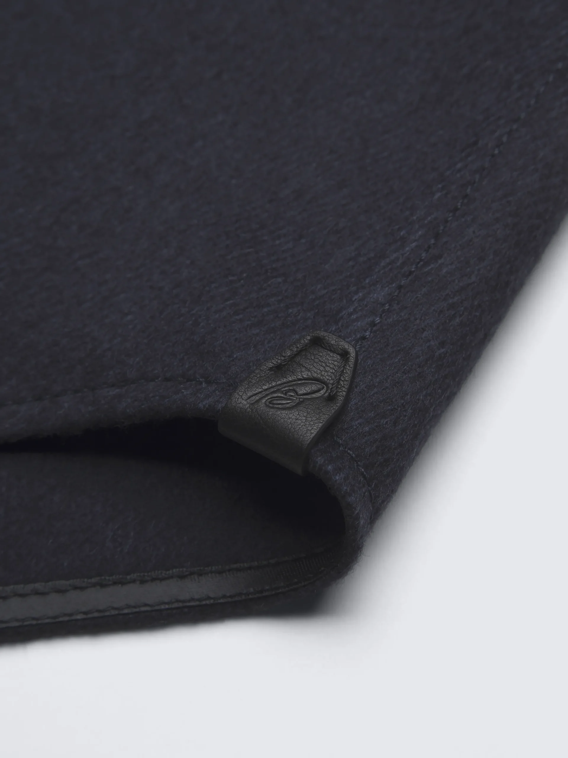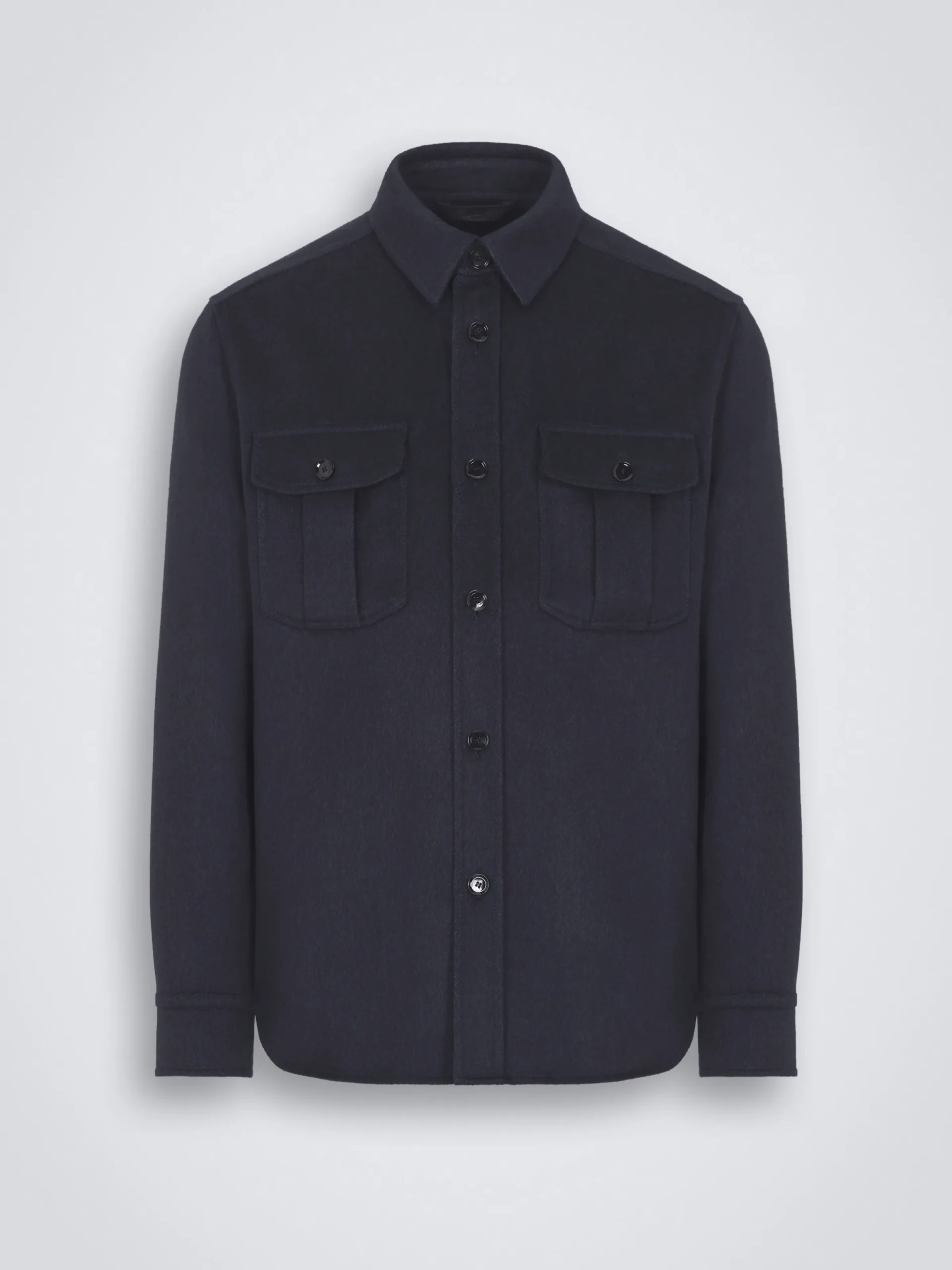 Our iconic cashmere, silk and vicuña navy blue Vagabond overshirt features a shirt collar, two chest patch pockets with bevelled shape and horn button flap closure, one internal pocket with button closure and half bevelled shape cuffs. The hem gusset presents the “B” logo in leather. This beautiful yet functional piece will be an elegant addition to your smart casual look when comfortably layered with a shirt or T-shirt underneath.nRenowned for its unparalleled softness and thermal properties, vicuña is extremely precious – the rarest and finest wool in the world. Garments crafted from this yarn are distinguishable by their strength, lightness, and warmth.