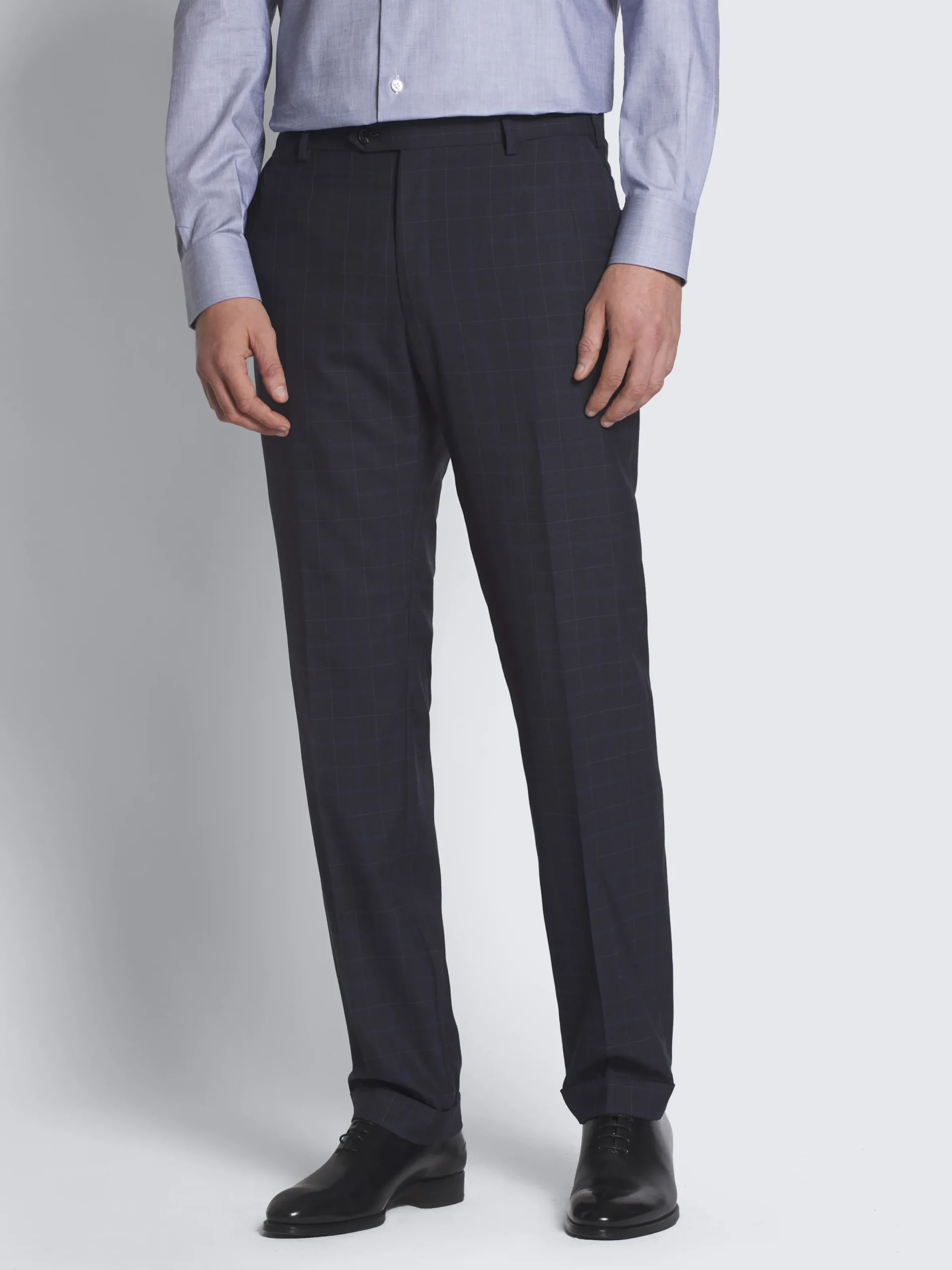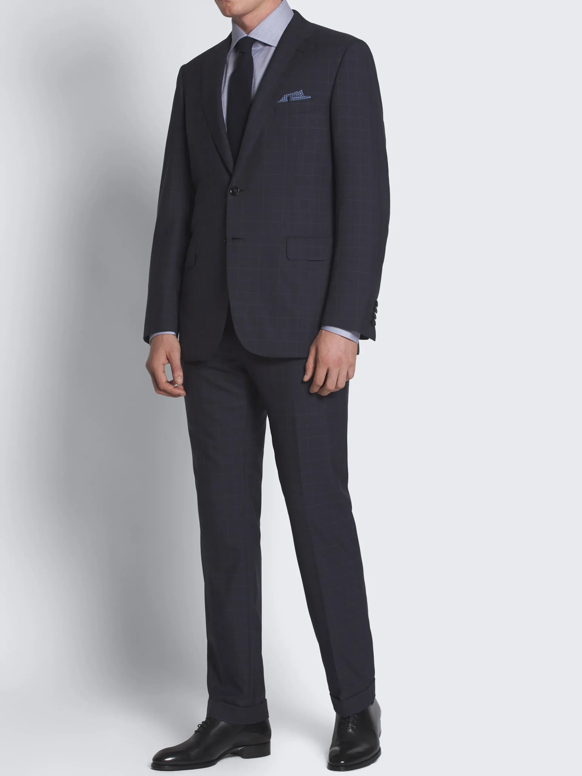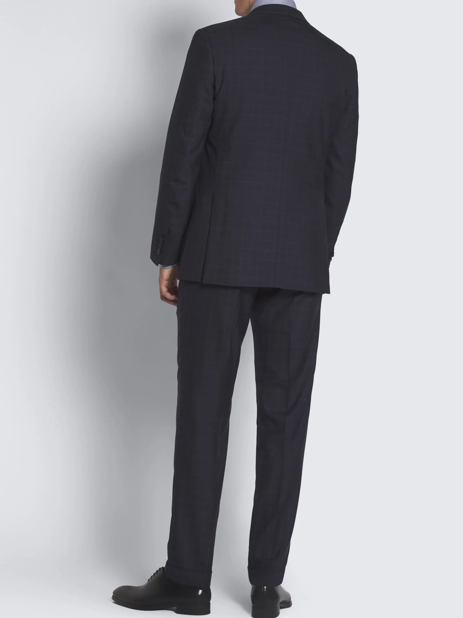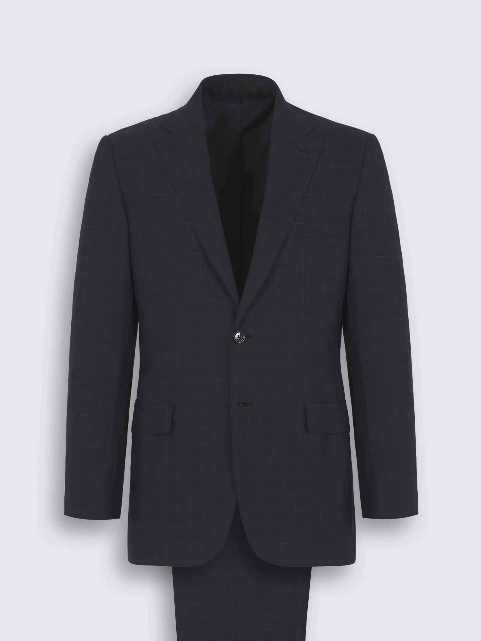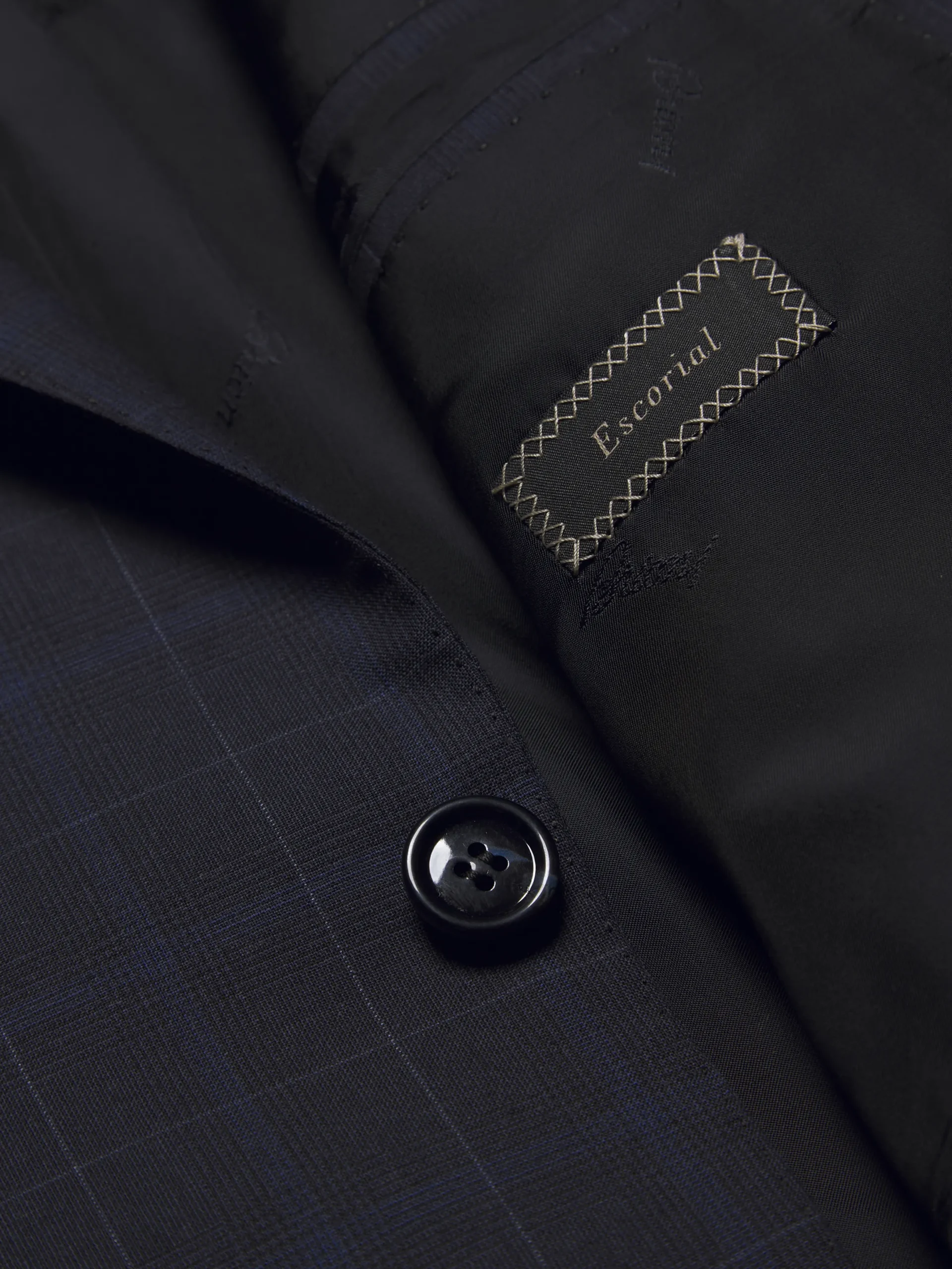 Navy blue checked Escorial wool Brunico suit. Fully lined, featuring a regular fit with eased armhole construction, notch lapels, two back vents, one chest pocket, two flap pockets, two internal jet pockets and one internal pocket with button closure. The trousers feature two side slant pockets, two back pockets with button closure and belt loops. Since its launch in 2010, the Brunico suit has become a staple. With its classic fit and handmade construction, it’s the expression of Brioni tailoring excellence.