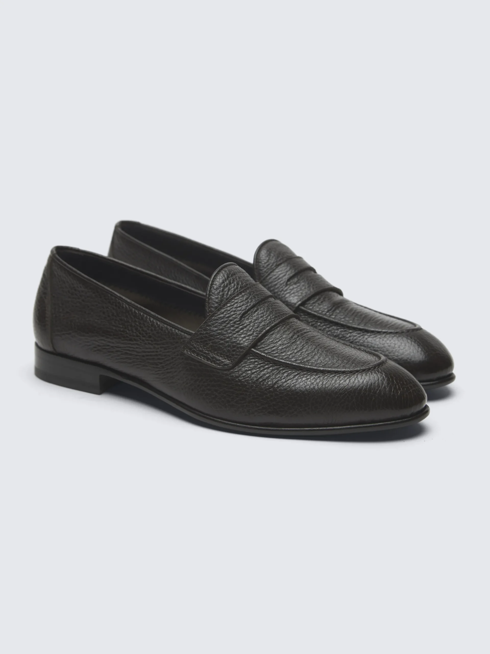 Dark brown deerskin leather Appia penny loafer, an epitome of elegance. Realized in a classic almond shape with a light and flexible construction, this loafer presents a slender and streamlined last resulting in a refined look with unparalleled comfort. The perfect choice for a gentleman who values both functionality and style. Named after the extensive Roman road, the shoe was born as a challenge for the classic moccasin to suit long walks. A timeless rounded shape complements the natural movement of the foot. An elegant icon that fits like a glove.
