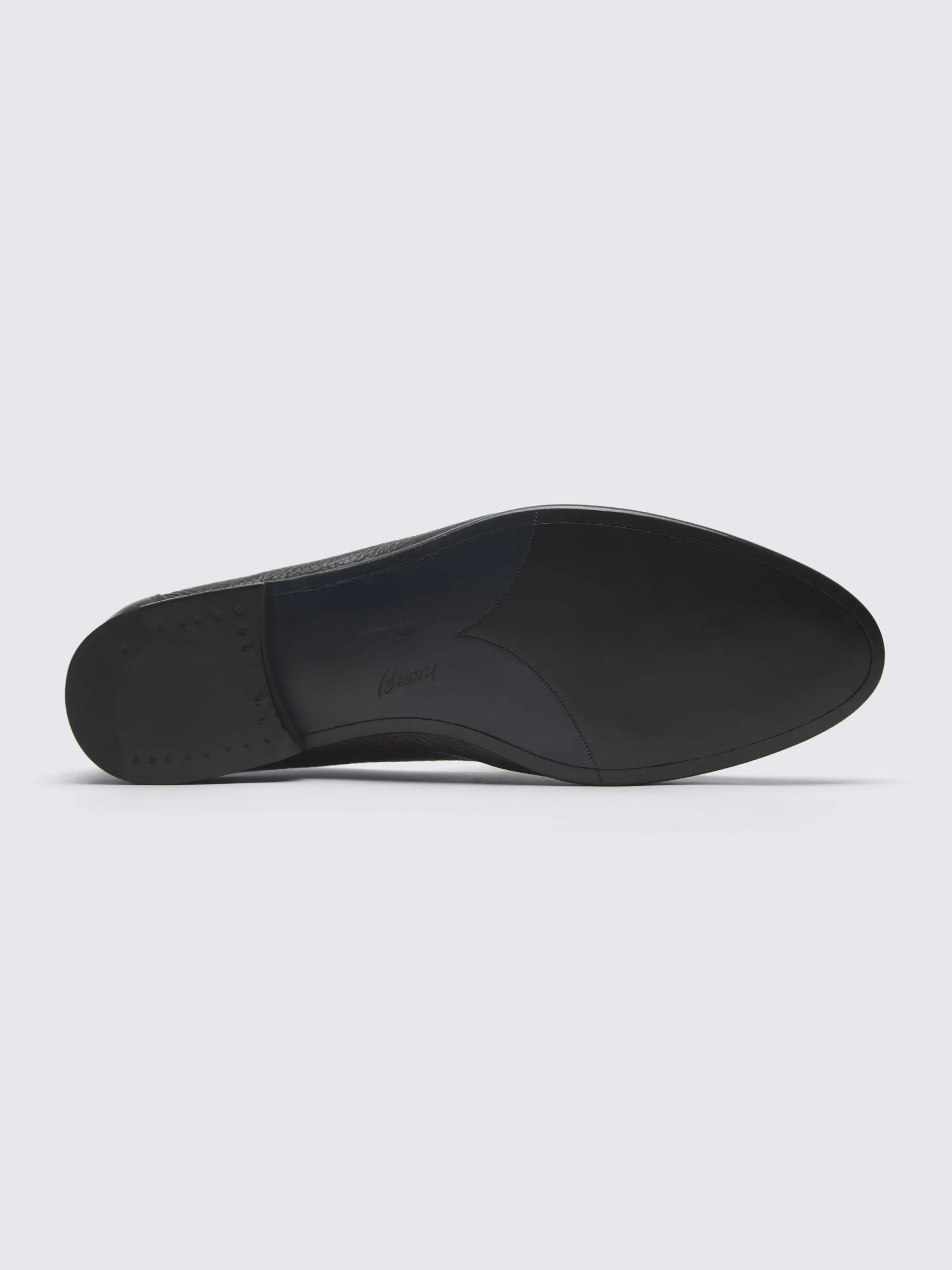 Brioni shoes are made of noble leathers selected by master craftsmen. Please consider fine wrinkles, veins or marks as a distinctive feature of the natural materials used. The shape and comfort of these shoes result from their design in keeping with the finest handcrafted traditions and techniques. The following gestures will ensure the long life of your shoes:• Alternate between different pairs of shoes each day to allow the leather to breathe and restore.• Insert wooden shoe trees to preserve their original shape.• Store them in their fabric dust bag and keep them in a dry place away from heat and light.• Before nourishing the leather, dust your shoes with the help of a soft brush.PATINA FINISH LEATHERClean it with a soft and slightly damp cloth. Use a nourishing colourless cream. Don’t use wax as this will alter the patina finish on your shoes.SMOOTH OR GRAINED LEATHERClean it with a soft and slightly damp cloth. We recommend you nourish the leather twice a month with the help of a nourishing colourless cream and a wax which will preserve its appearance and restore its original lustre.PATENT LEATHERClean it with a soft and slightly damp cloth. Finish by polishing it with a soft and dry cloth. SUEDE LEATHERClean it with a crepe rubber brush. We recommend you apply a colourless waterproofing and anti-stain spray before wearing your shoes and after every time you clean them.EXOTIC LEATHERClean it with a soft and dry cloth, following the direction of the scales.Return your shoes to a Brioni boutique for our leather artisans to restore them to their original state.