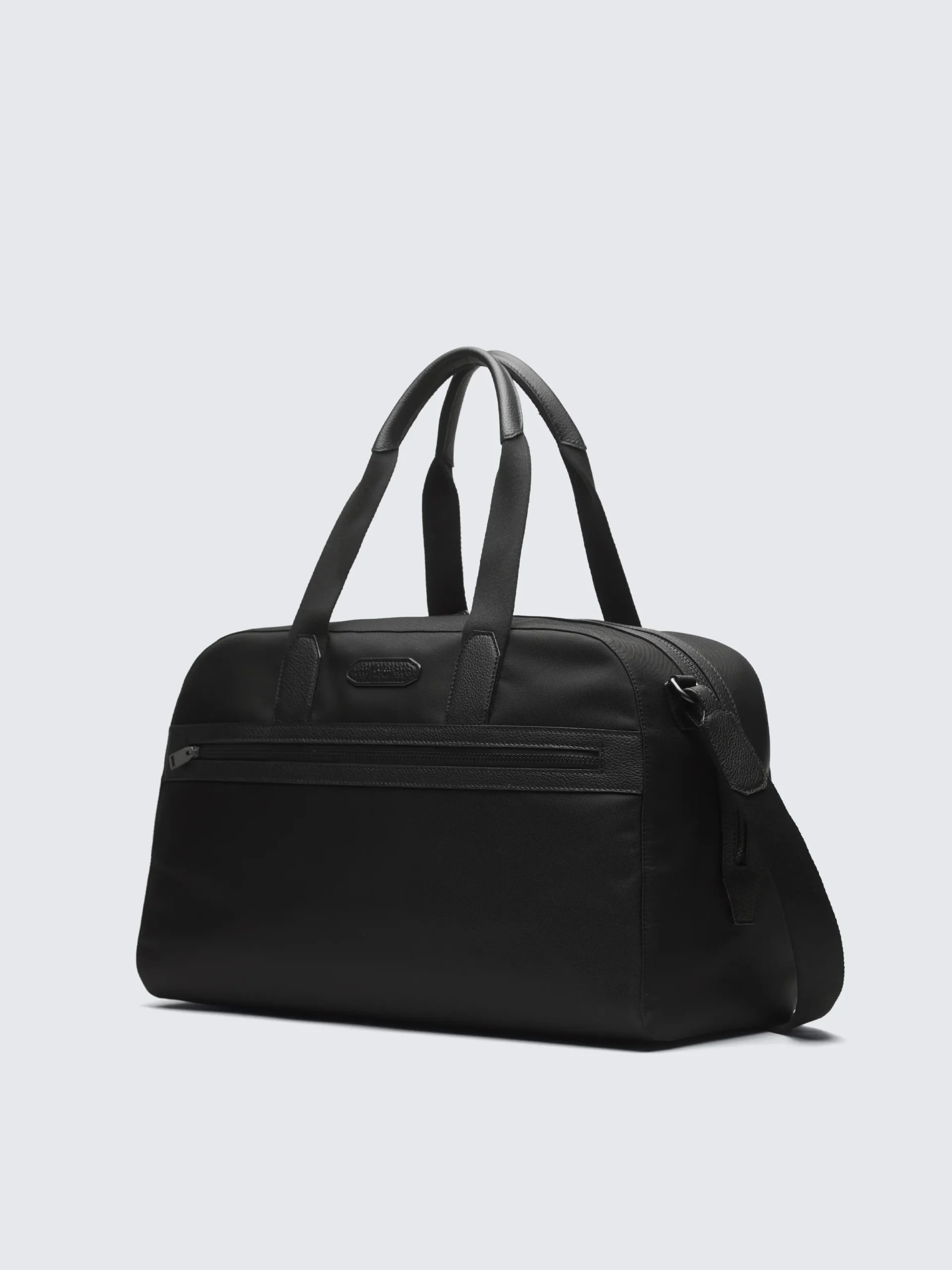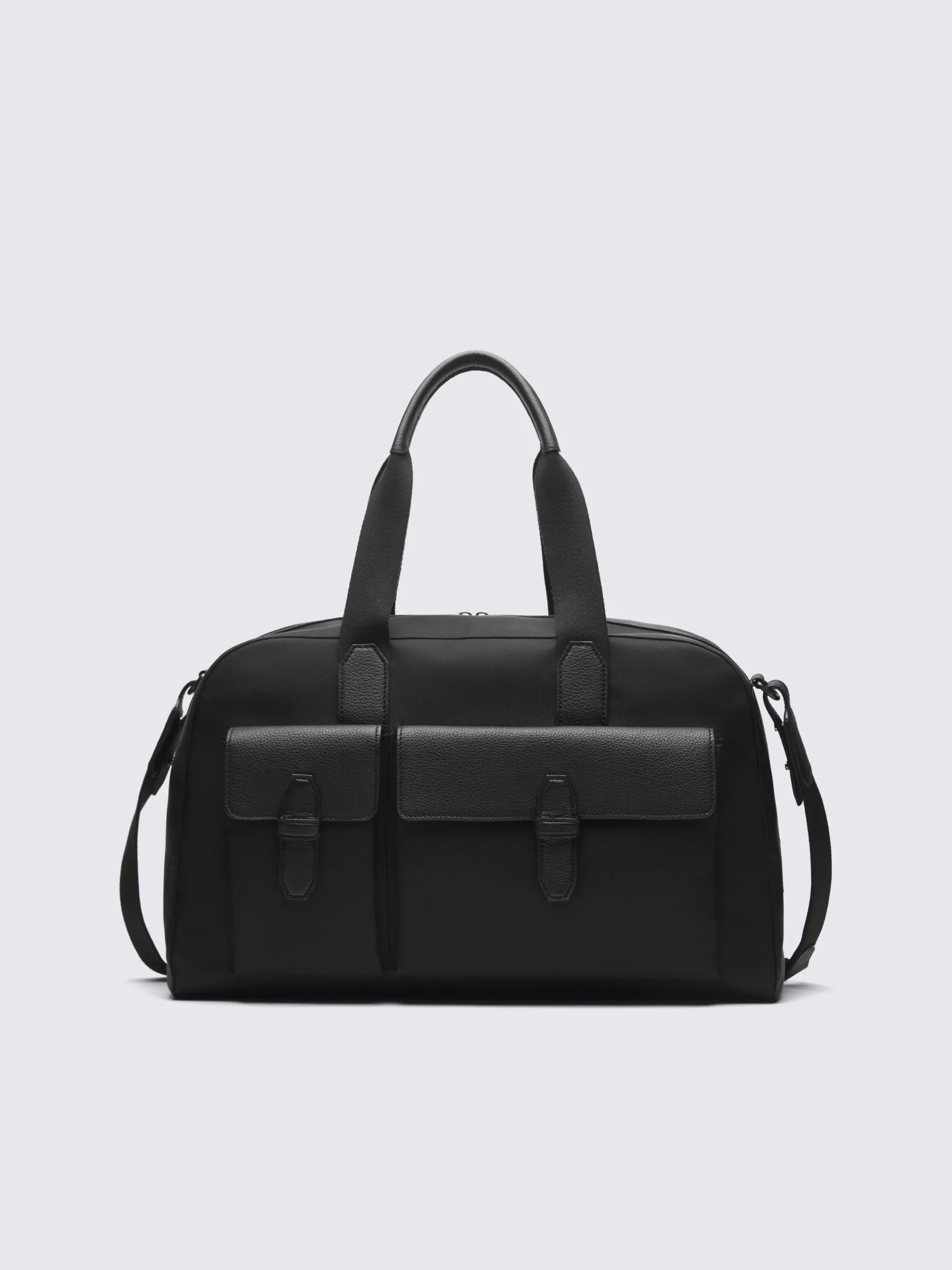 Black nylon and grained leather travel tote, with two top handles and a detachable and adjustable shoulder strap, which makes this accessory wearable also across the body. Featuring two flap-pockets with leather closure detail on the front, leather logo and double-zip closure pocket on the back for additional practicality, this is the perfect accessory to travel in style.