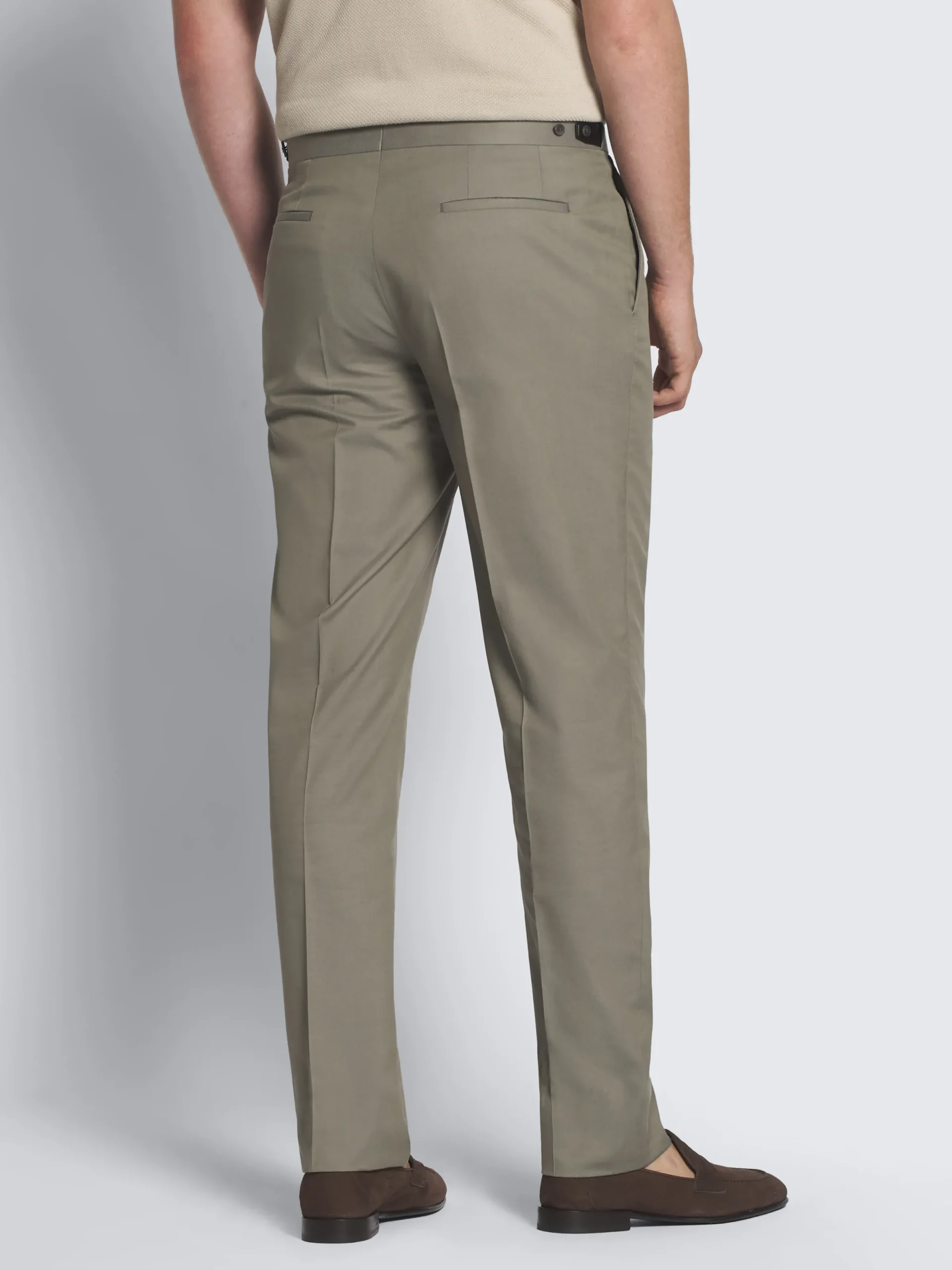 “,”features”:”Regular fitnExtended waistband with button closure and bevelled endnZip fly and metal hook front closurenAdjustable bevelled leather tabs with buttons and internal elasticated waistband on the hips nSingle open pleatsnTwo side slant pockets with topstitching detailnTwo back jet pockets with hidden loop and button closurenWaist: 46 cmnBottom: 18,5 cm measured on a size 50