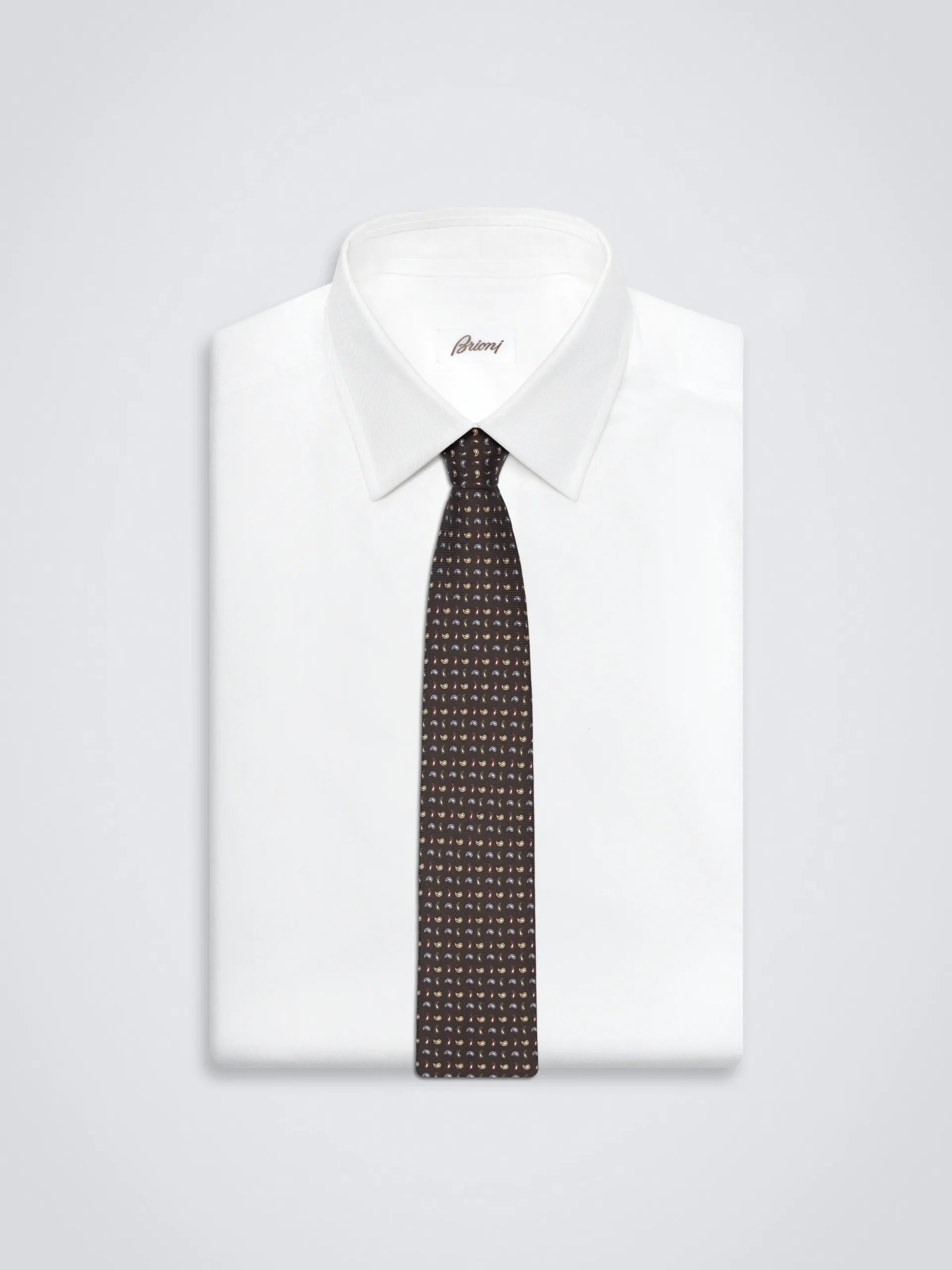 Silk brown tie with printed paisley motif, entirely handcrafted in Italy. The high quality of this fabric allows for a printing with brighter colours and smoother texture. Its subtle sheen add a refined elegance to your business wardrobe with the matching pochette to complete the look.