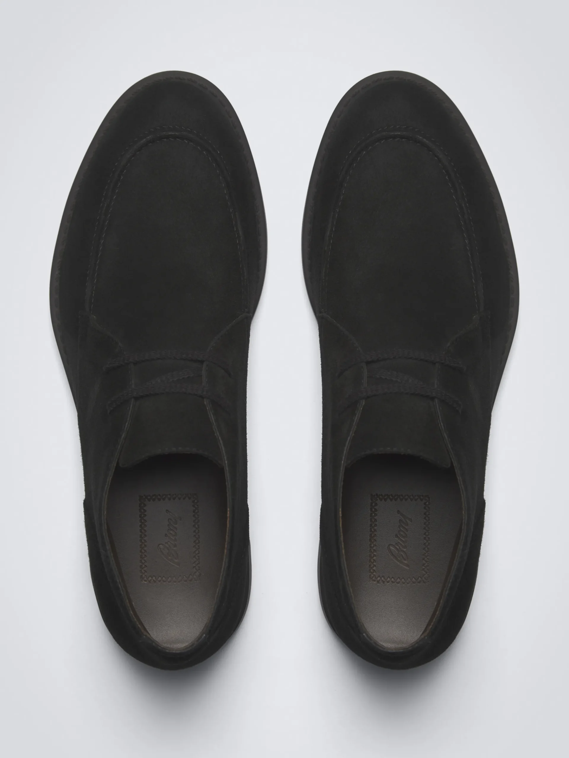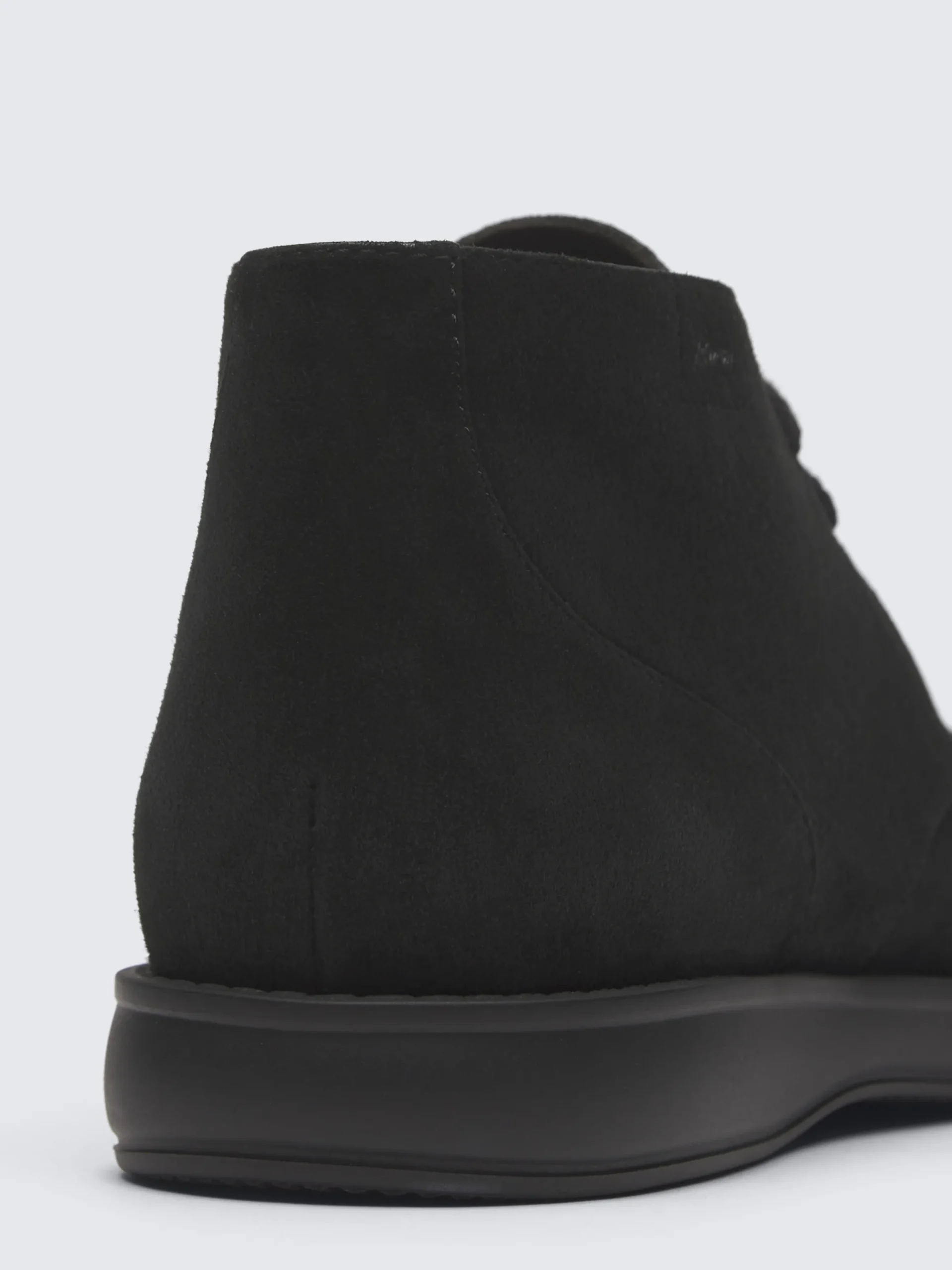 Black suede desert boots. Featuring two eyelets, embossed logo with square embroidery on the side, rubber sole for extreme lightness and flexibility, rounded last for comfort and Strobel construction, these shoes are the perfect combination of form and function. Timeless and easy to mix and match, ideal to complement your laid-back look on casual days and weekends. In the Strobel construction the upper is joined to a lightweight insole forming a pouch, which is subsequently joined to the sole. It guarantees a strong support for ankle torsion, crucial for footwear that requires great comfort and performance, like sailing shoes and active sneakers.