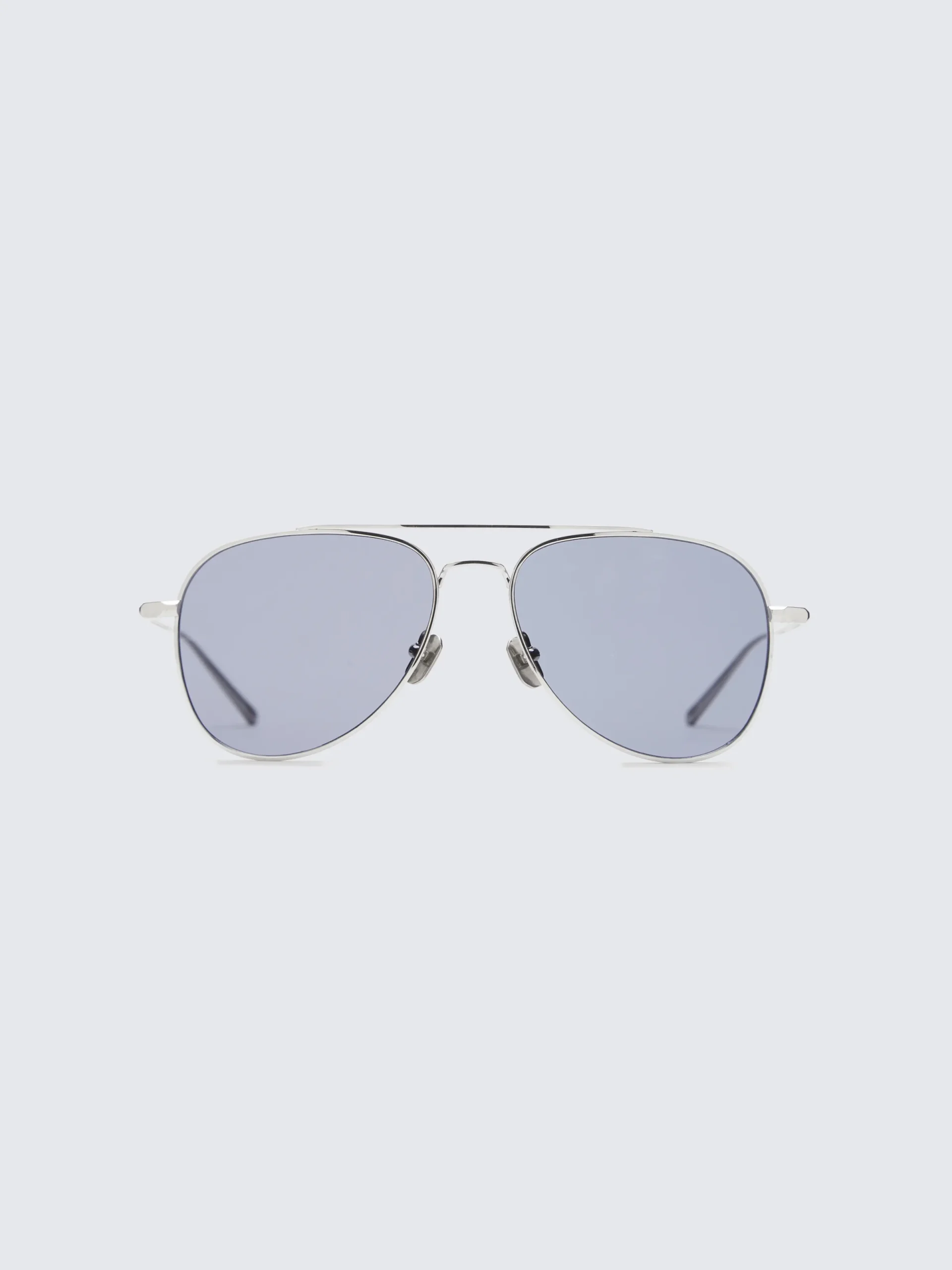 Pilot-style sunglasses with a full titanium construction, light grey lenses and the House signature regimental stripes motif on the rim and the bridge. Designed with an octagon frame, these iconic sunglasses are finished with a debossed Brioni logo on the temples for a recognisable look. The double bridge lends a modern touch to the gold-toned structure. Also available in gold with grey lenses and gold with grey mirrored lenses.