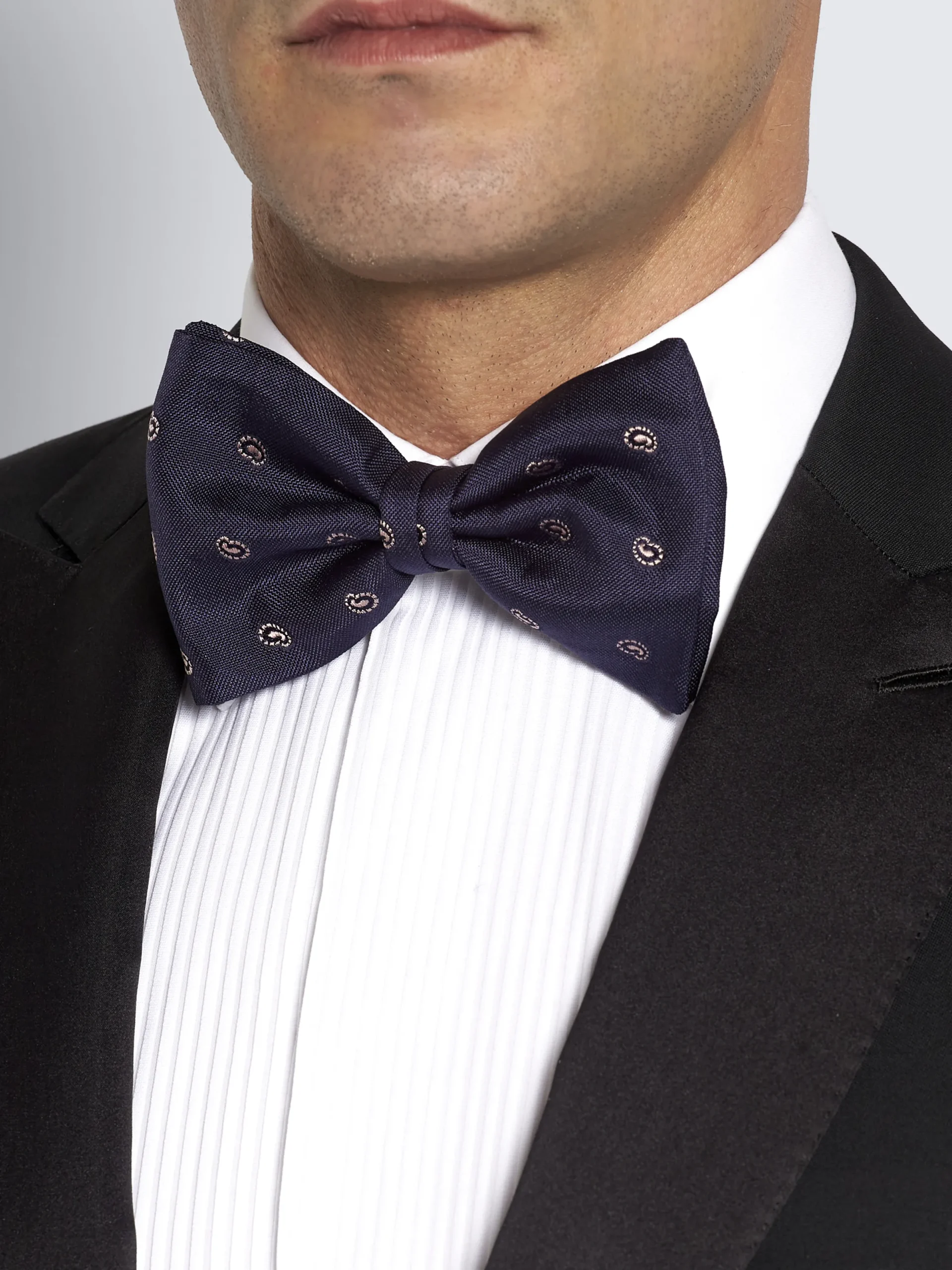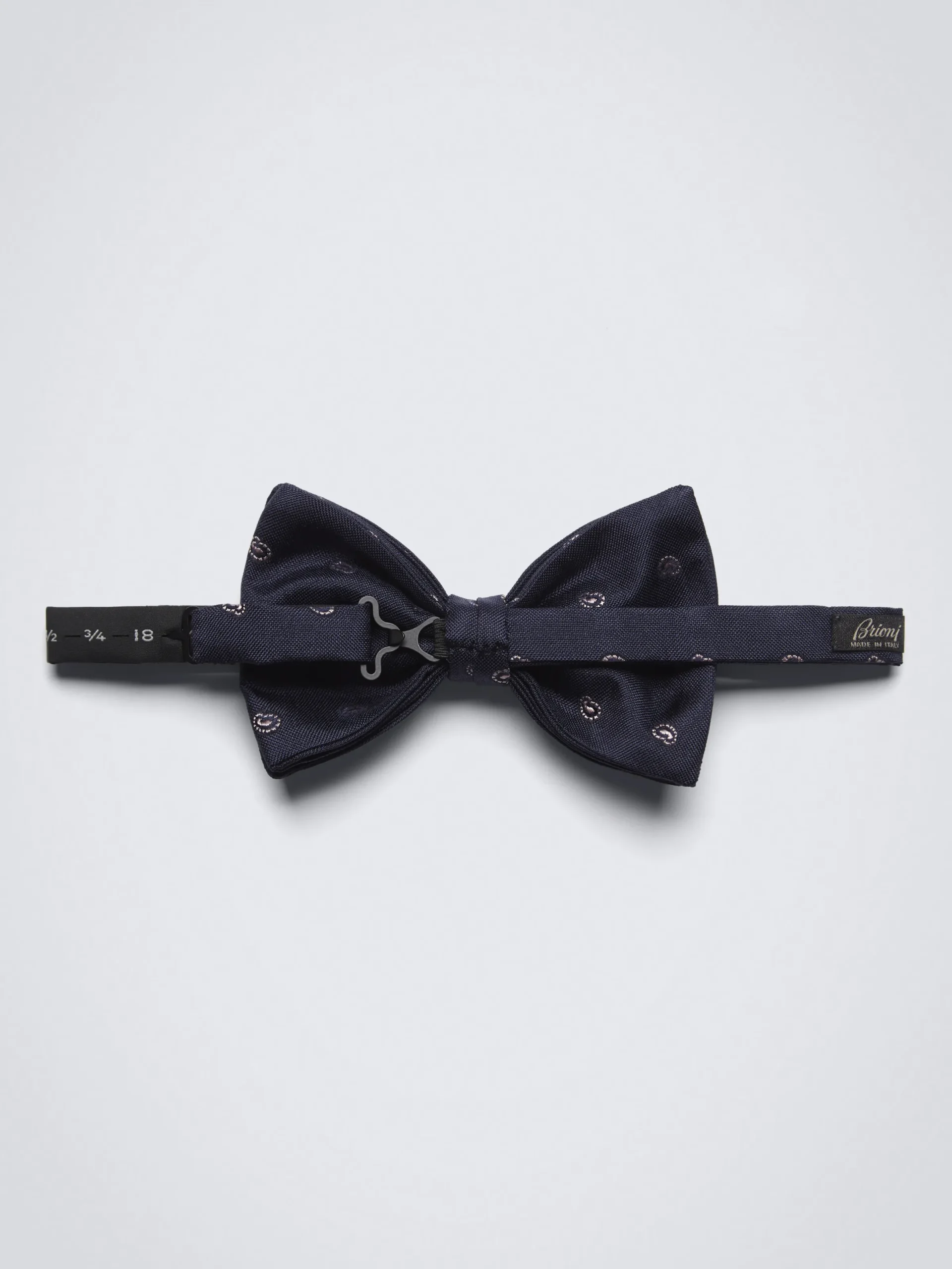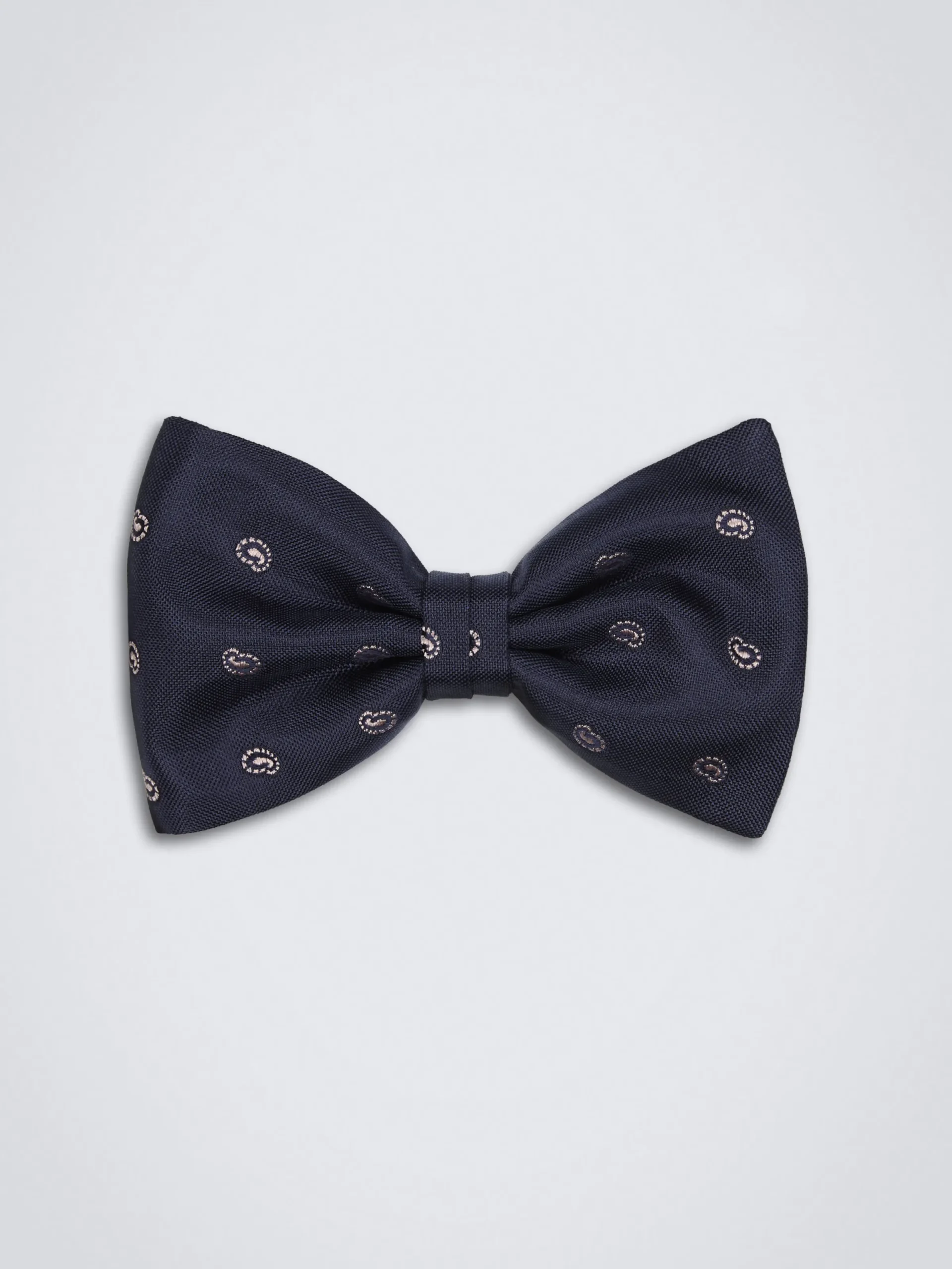 100% midnight blue silk bow tie with beige paisley motif, handmade in Italy. A stylish and innovative design that will allow you to compliment this piece with different colours and styles of jacket.