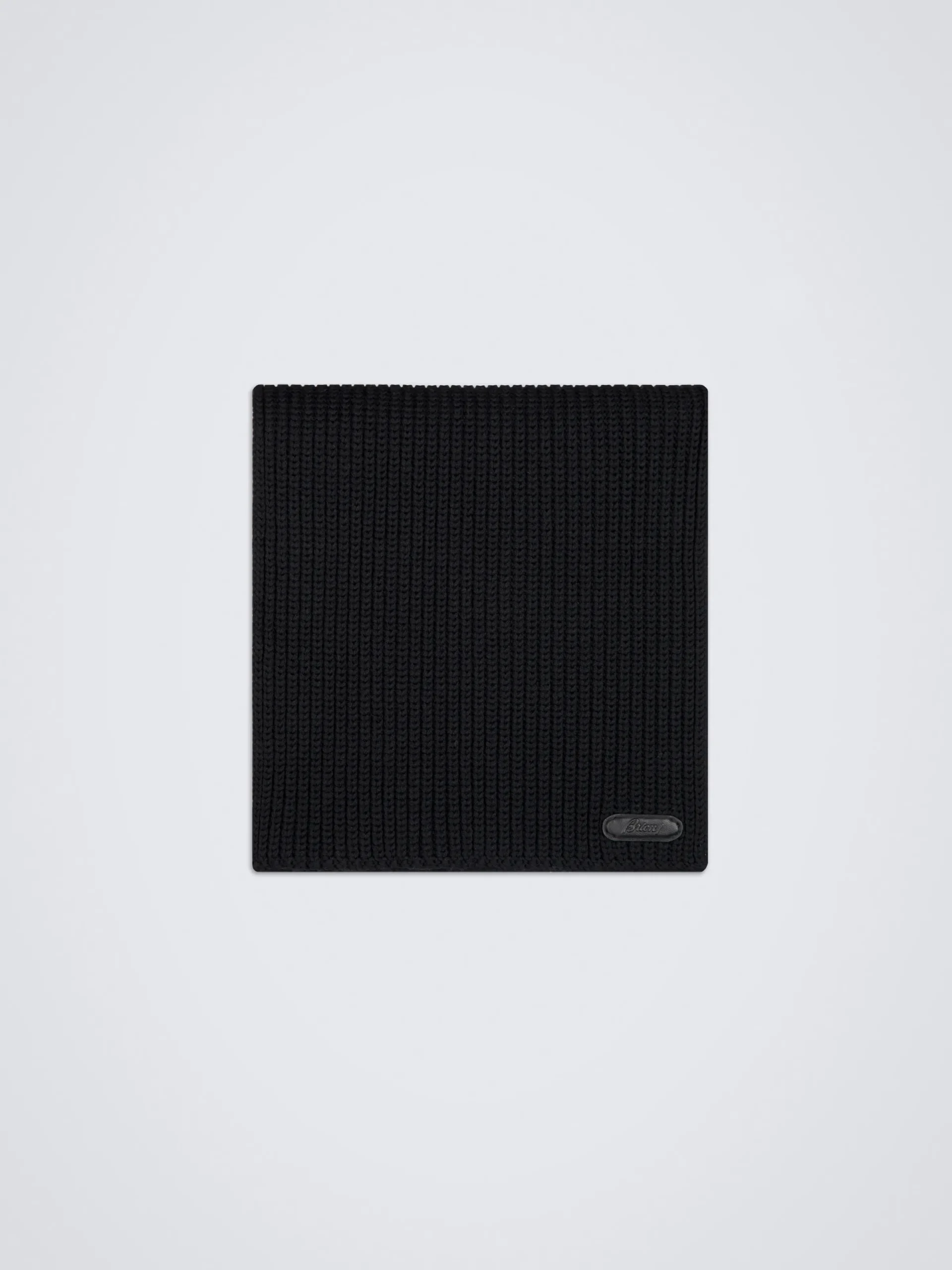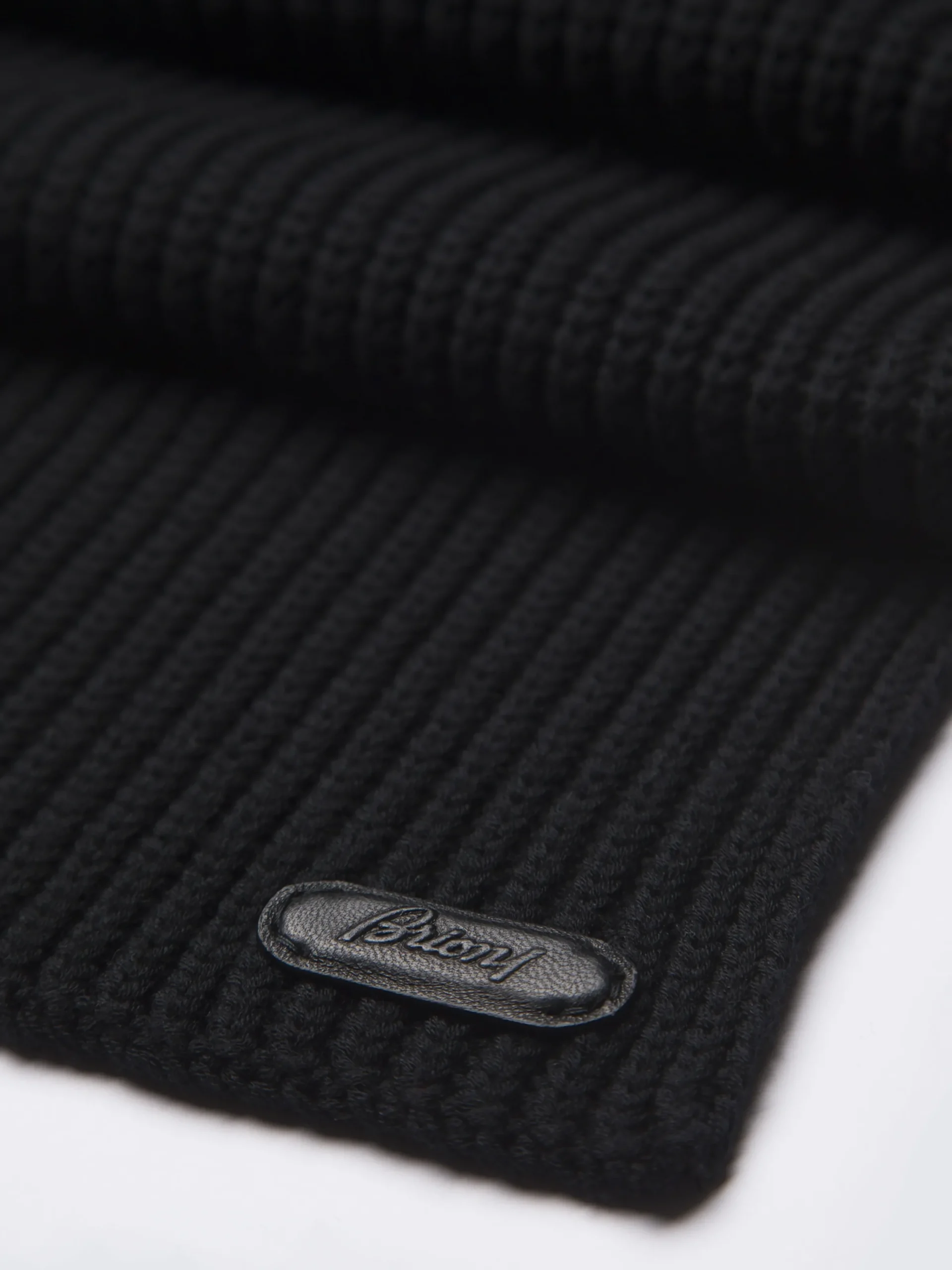 Black scarf in wool with subtle leather Brioni logo. Inspired by our knitwear garments, this incredibly soft accessory has been meticulously pieced together entirely by hand. It will add a street-cool and modern touch to your classic look, and will keep you warm on the coldest winter days.