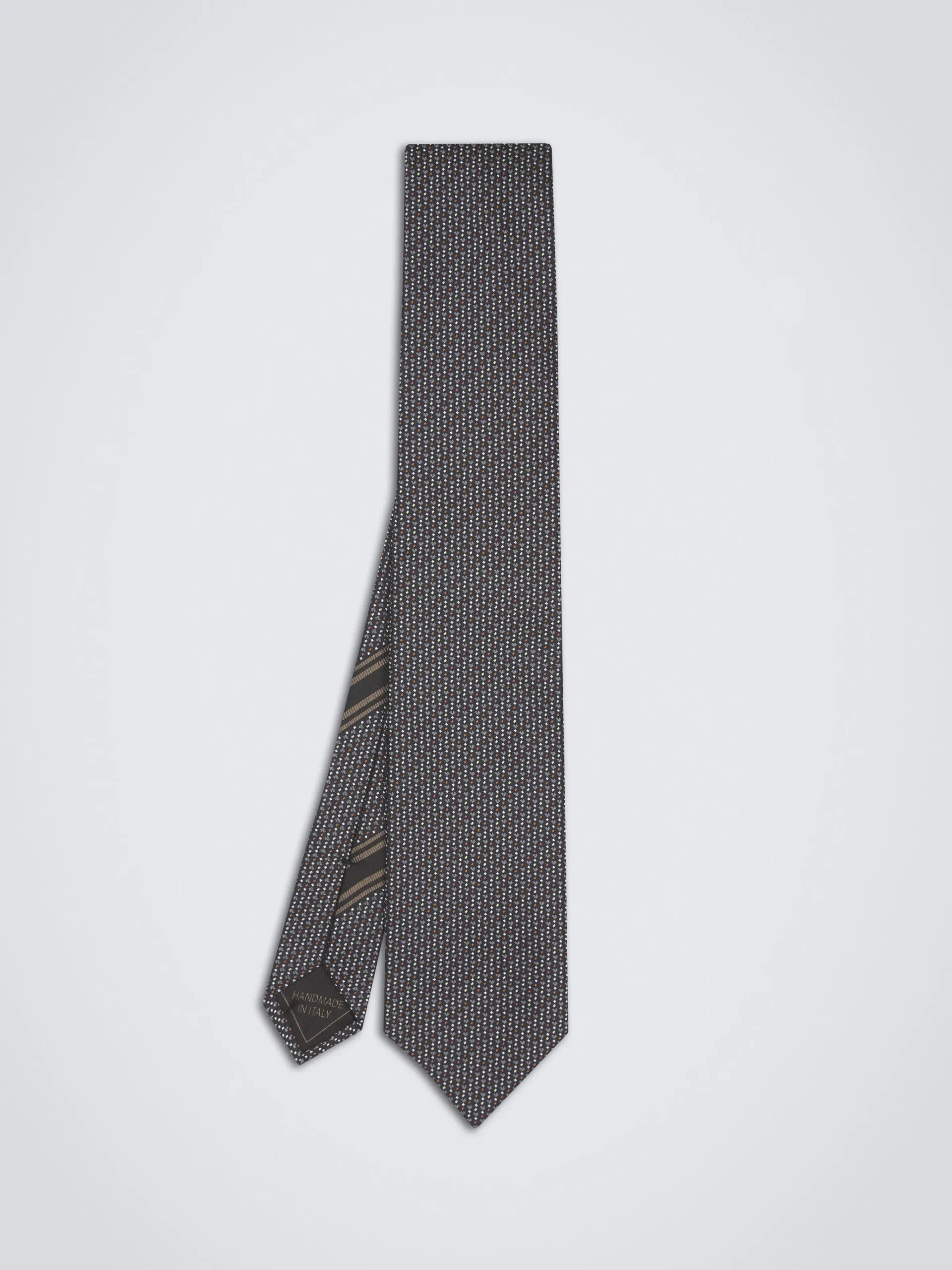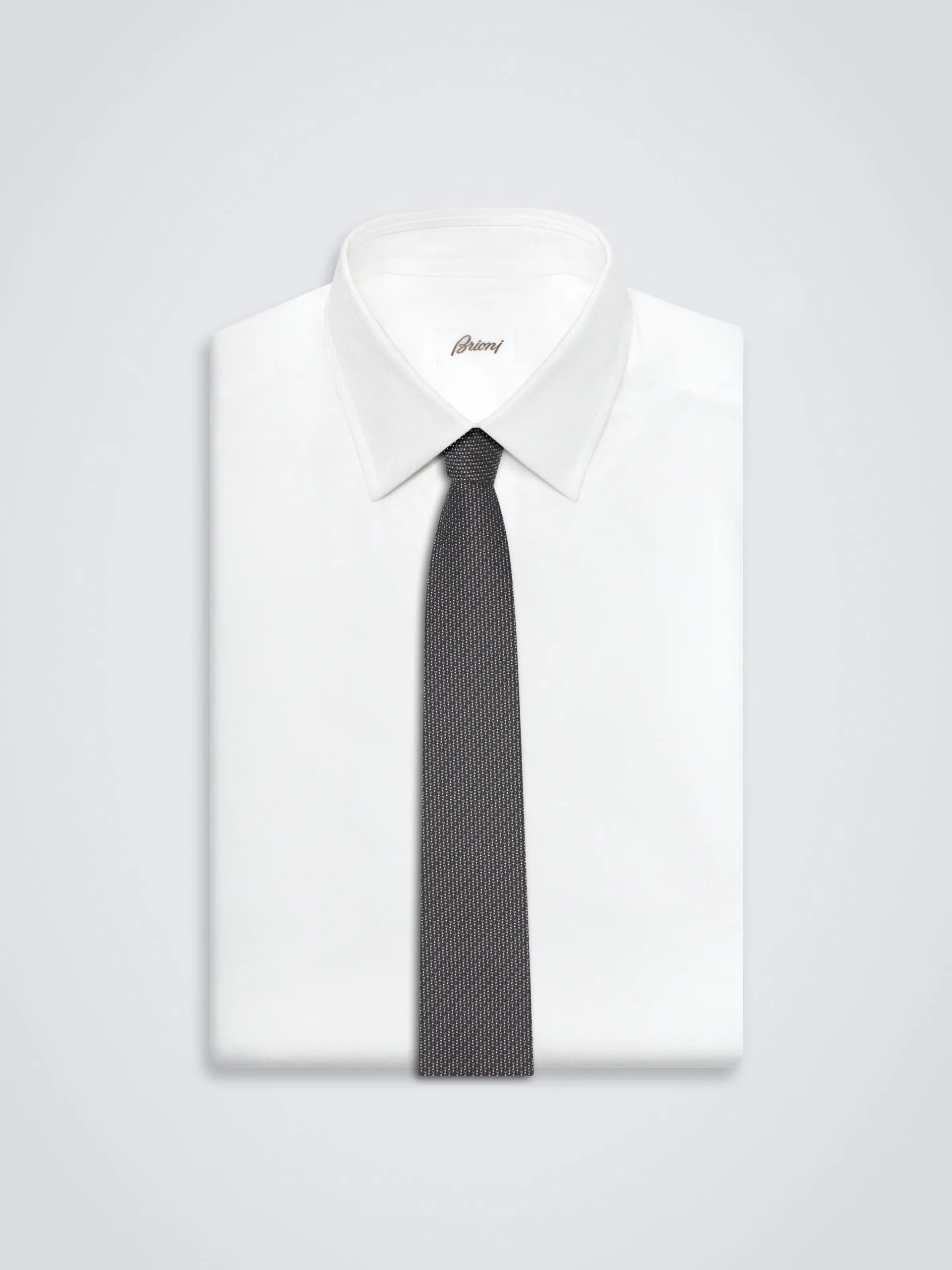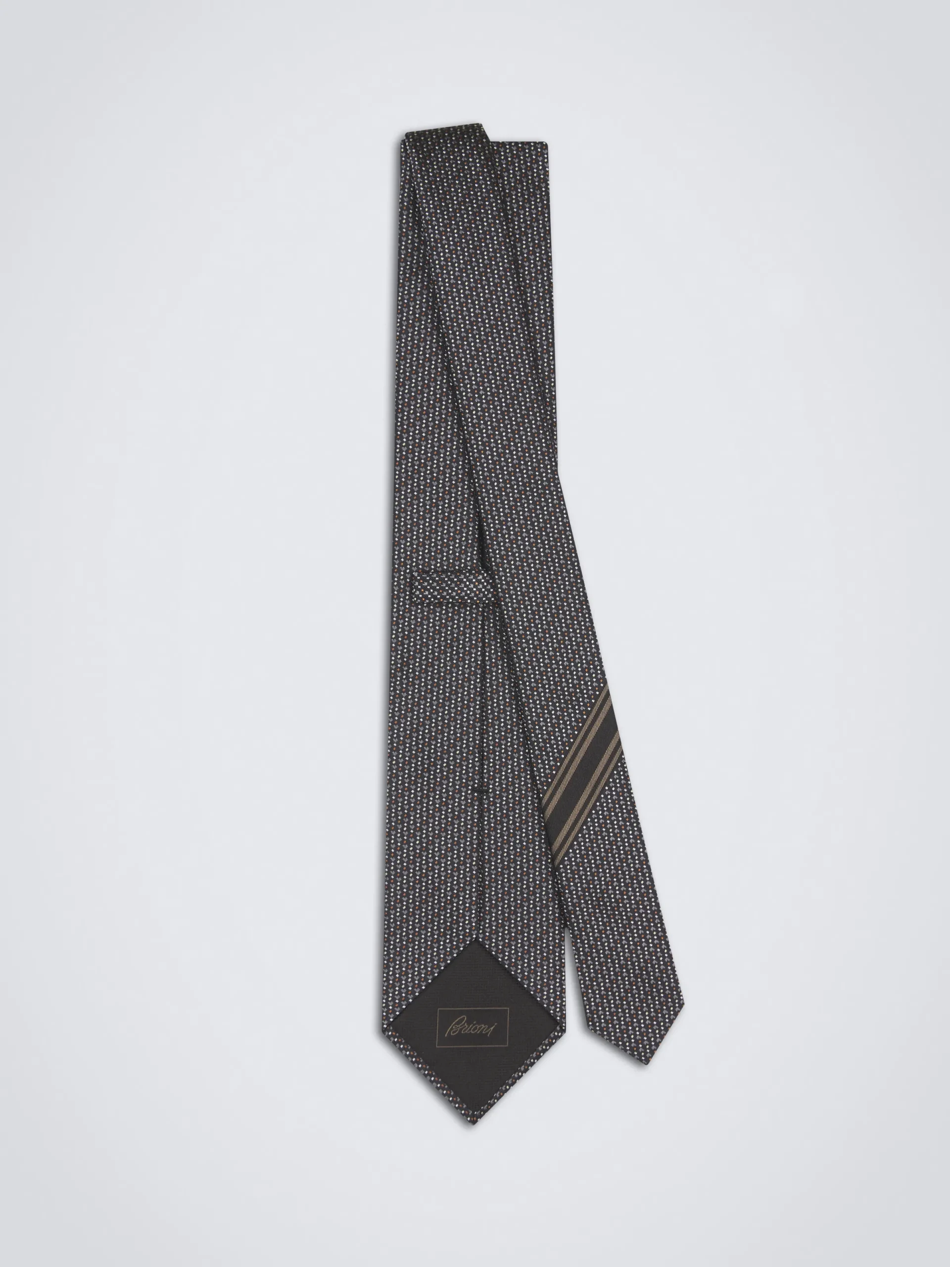 Black and dark grey micro motif jacquard silk tie. Brioni ties are the epitome of elegance, handmade from the finest materials. This piece in perfect to pair with a white crisp shirt and a formal jacket for a refined, chic and modern look.