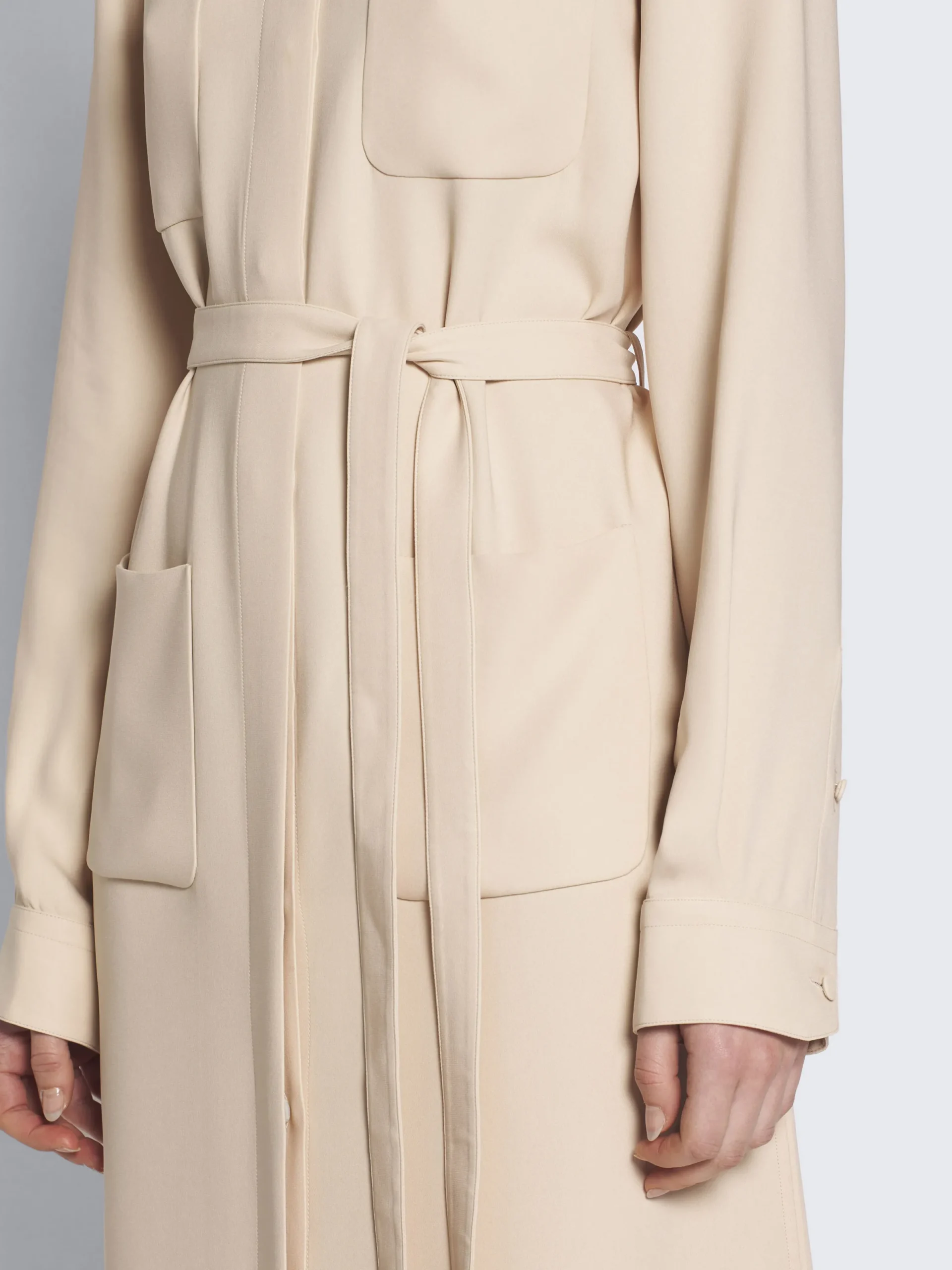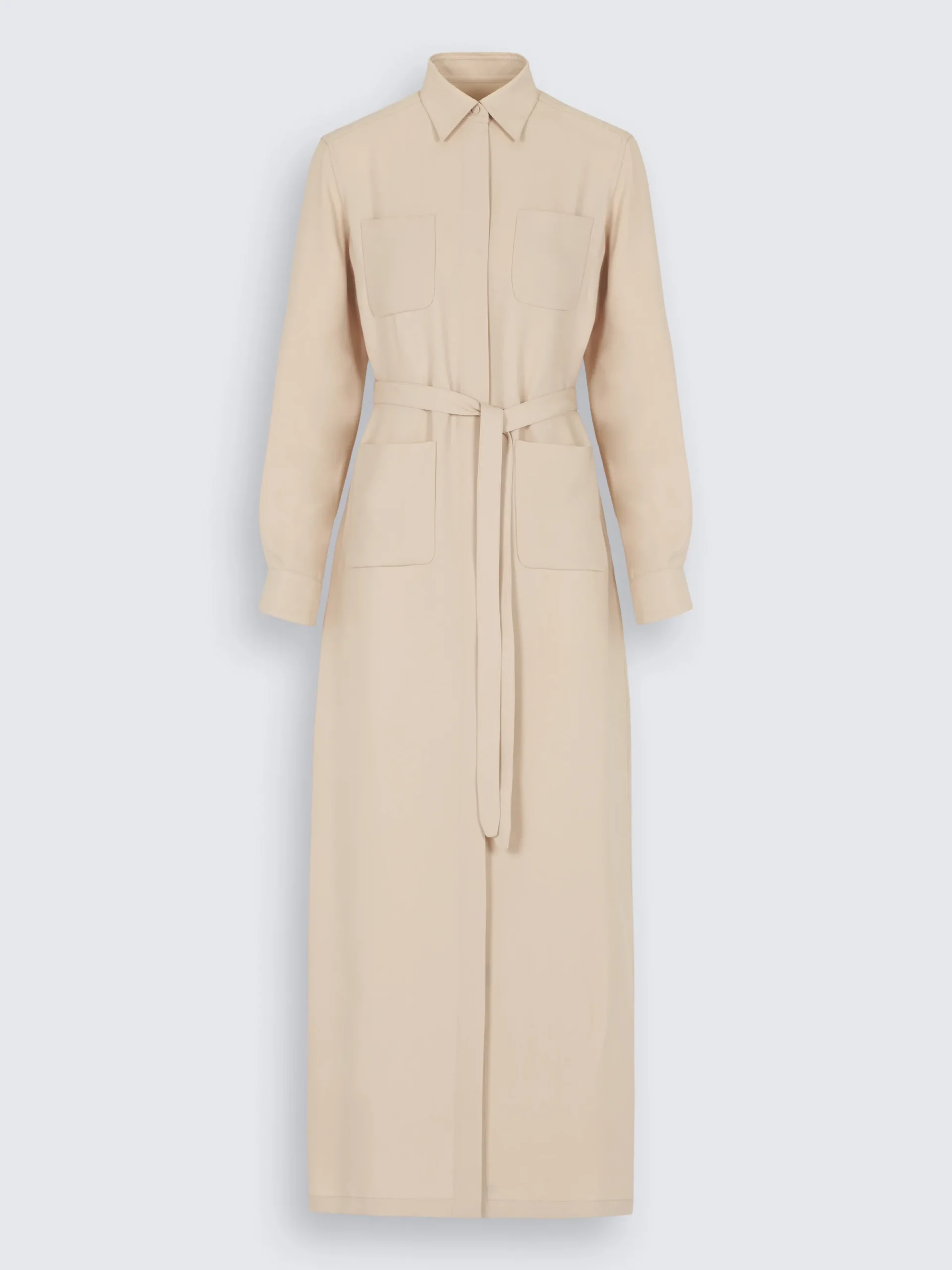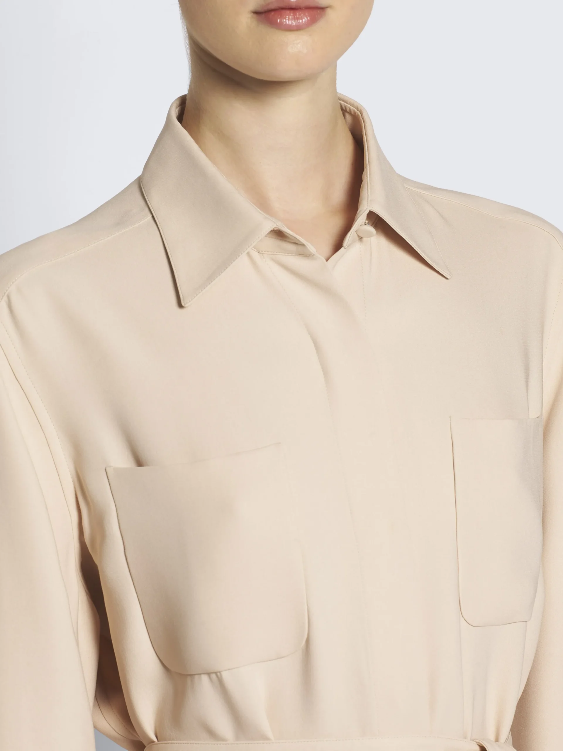 Beige silk cady workwear shirt dress. Featuring a regular fit, shirt collar, buttons and belt closure with loops. Four front patch pockets finish this garment. Its adjustable features will enhance the body silhouette and create a timeless chic ensemble, perfect to elevate any look.