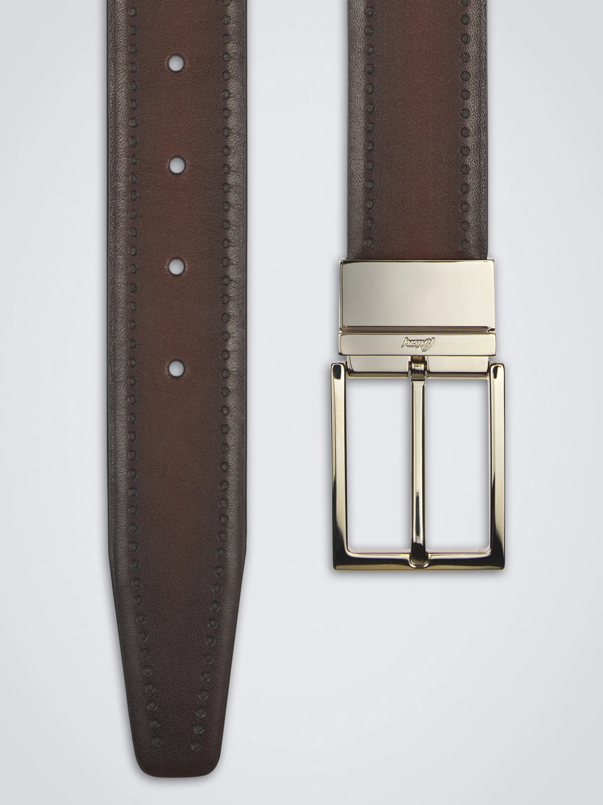 Brown calf leather belt. Adjustable, it features a squared buckle with shiny palladium finishing in light gold and bevelled ends, ideal to complement a variety of different attires.nThe uniqueness of the Vitello Roma leather is given by the hand-buffered technique, in which the material is hand-coloured and polished by the artisans to obtain the desired “light-and-dark” effect.n