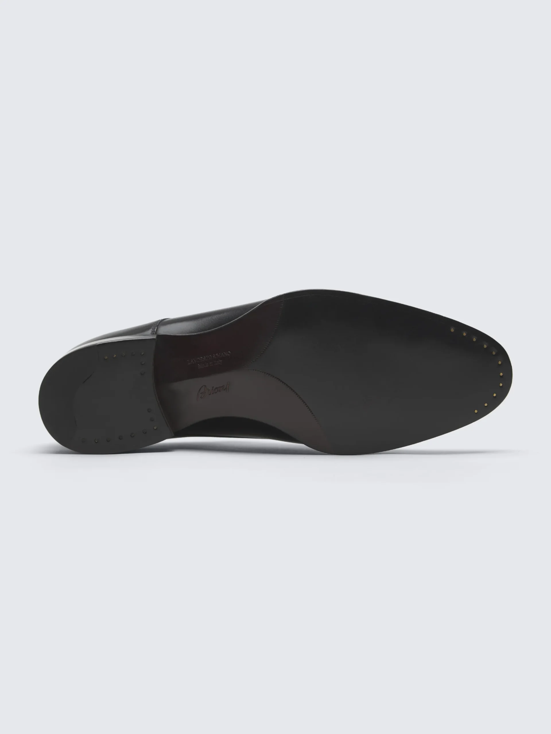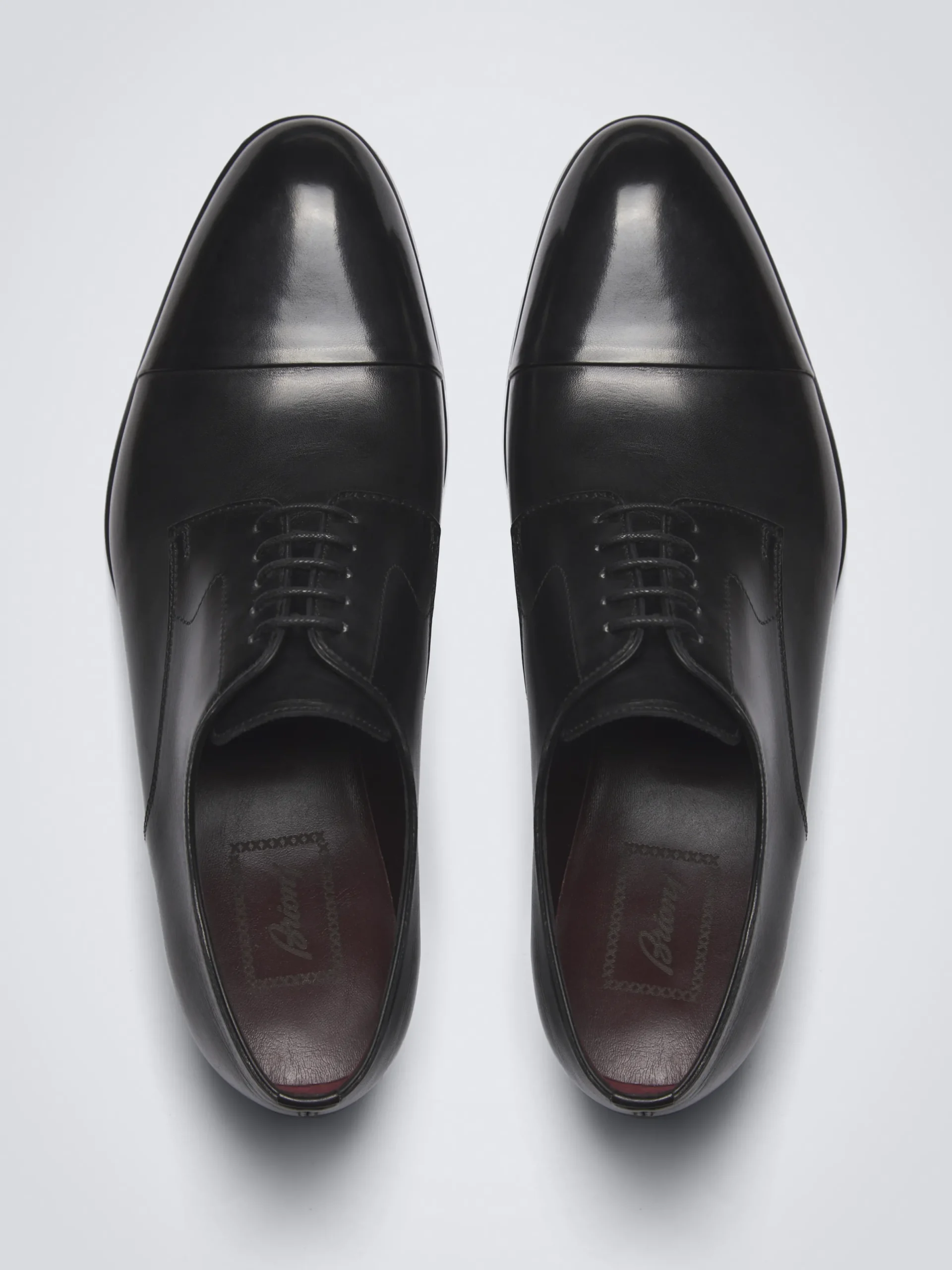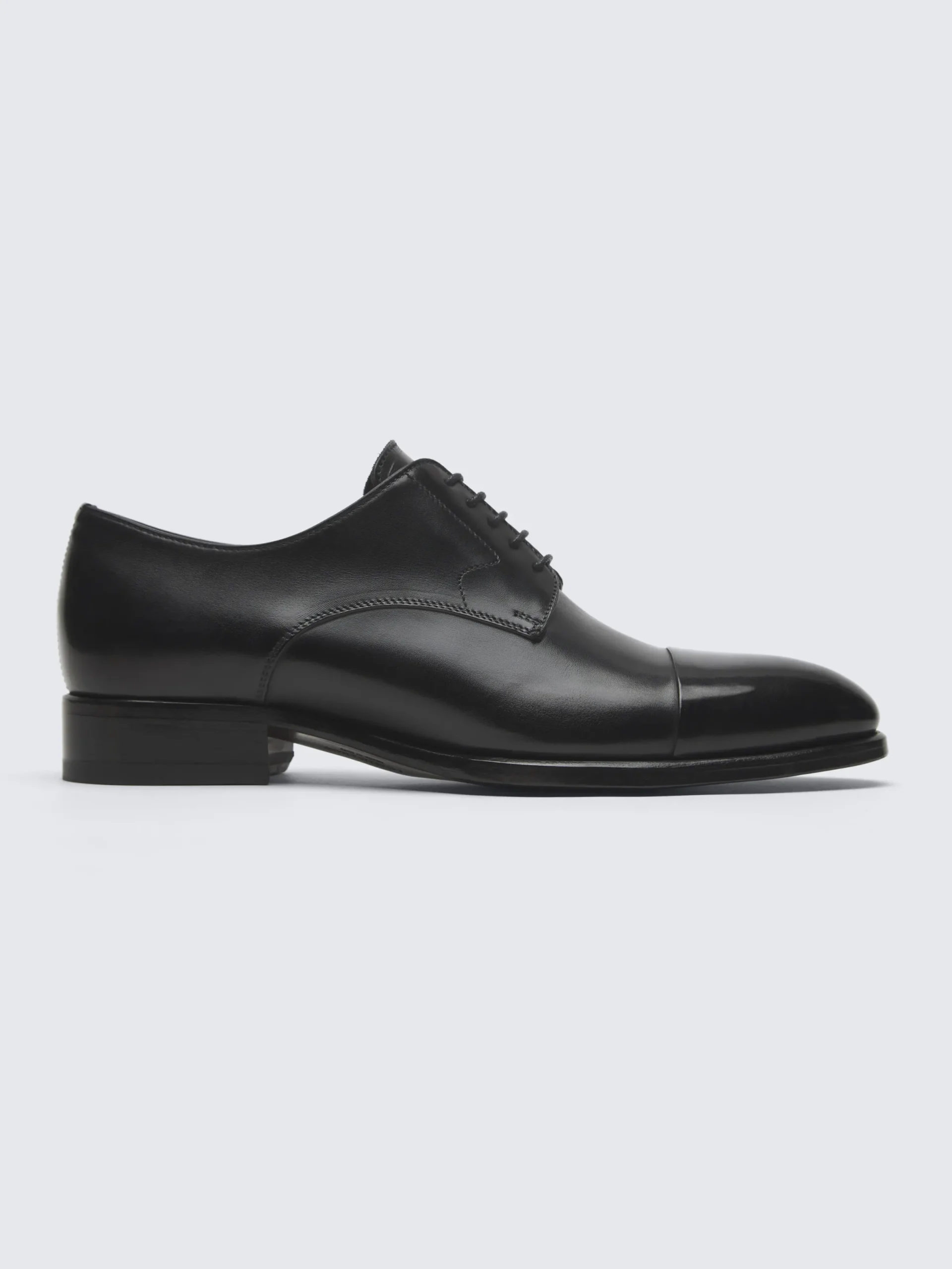 Essential black calf leather Milano derby shoes. The perfect blend of function and a sophisticated, modern look. The appeal is further enhanced by the smooth appearance of its material, which is extremely long-lasting and very soft. This garment is ideal for everyday wear at the office, or to complement your laid-back looks.