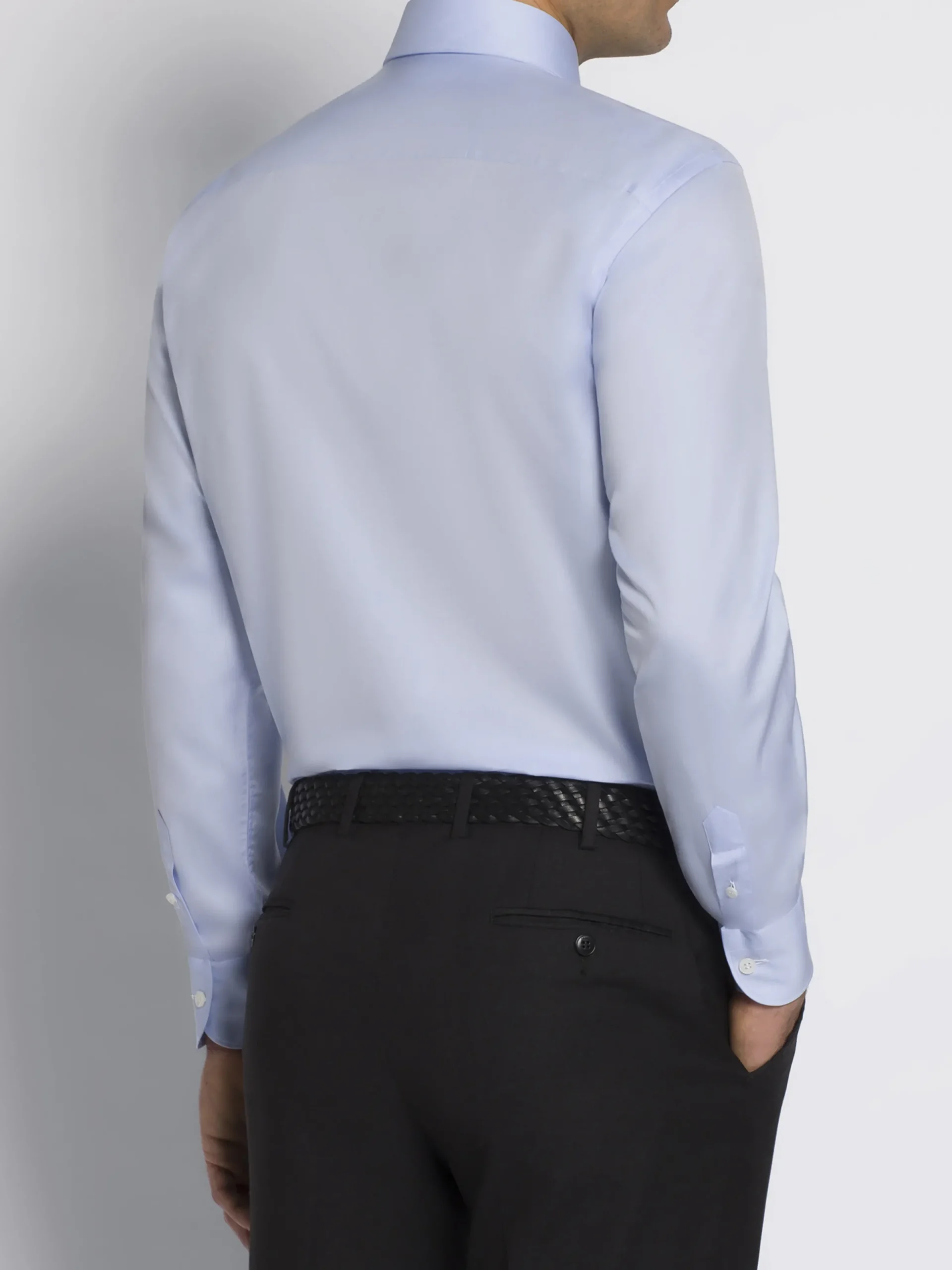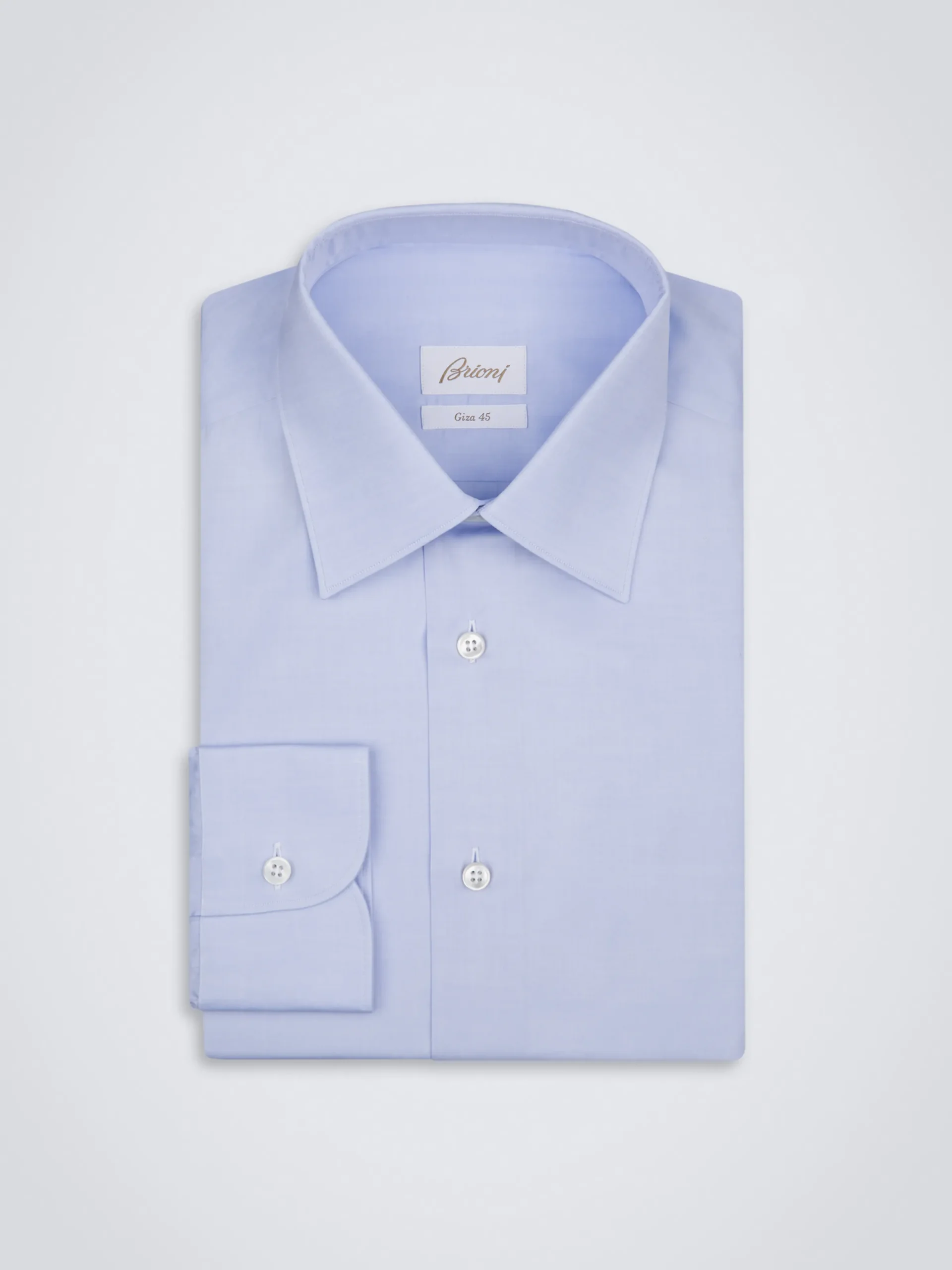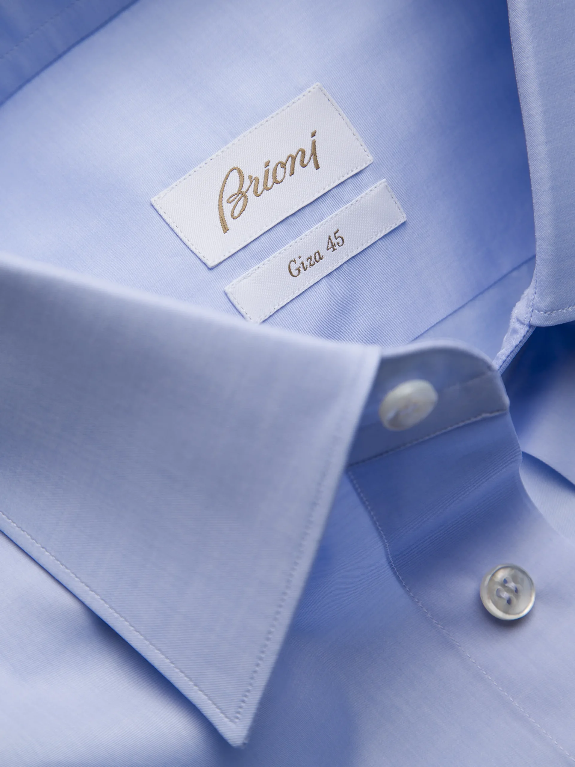 Essential sky blue Giza 45 cotton twill shirt with micro-checked, featuring a point collar and rounded cuffs. With its classic fit and extraordinarily soft hand feel, this shirt is perfect to add a refined touch to your look.nGiza 45 is one of the finest and most noble cottons. It offers the wearer an unparalleled smoothness and is incredibly light and soft on the skin. This extra-fine fabric has a silky touch while offering high strength adding the top level of luxury to any gentleman’s wardrobe.