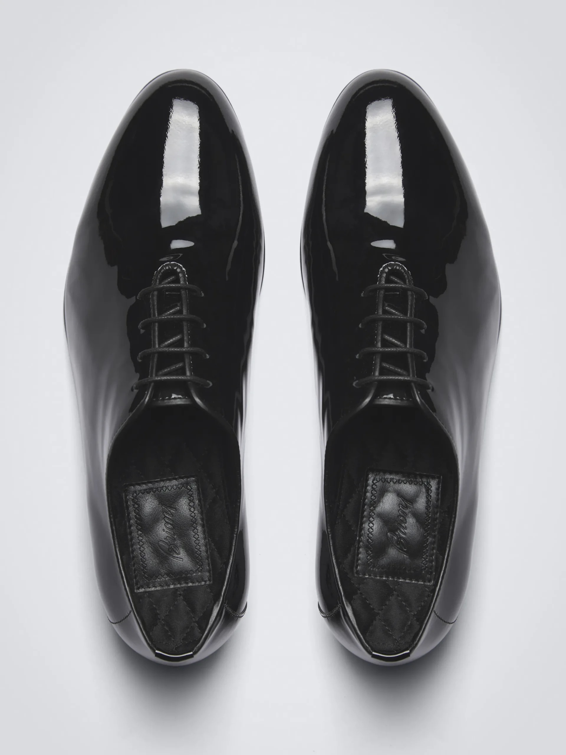 Essential black patent leather evening oxford shoes, featuring a hand painted upper made of a single piece of leather and handcrafted in Italy. The elegant tapered shape and clean lines make this the ideal finishing touch to a classic tuxedo.