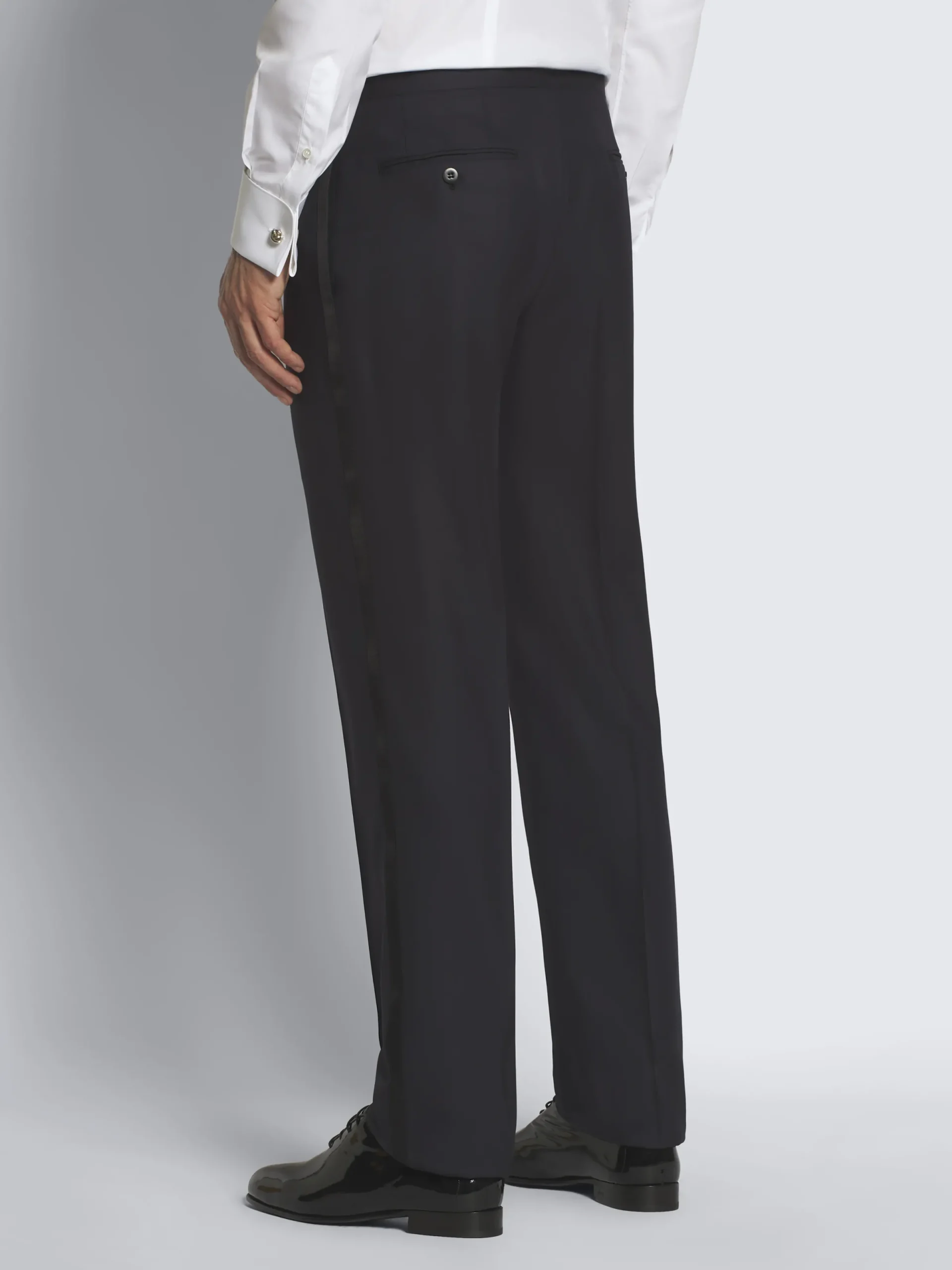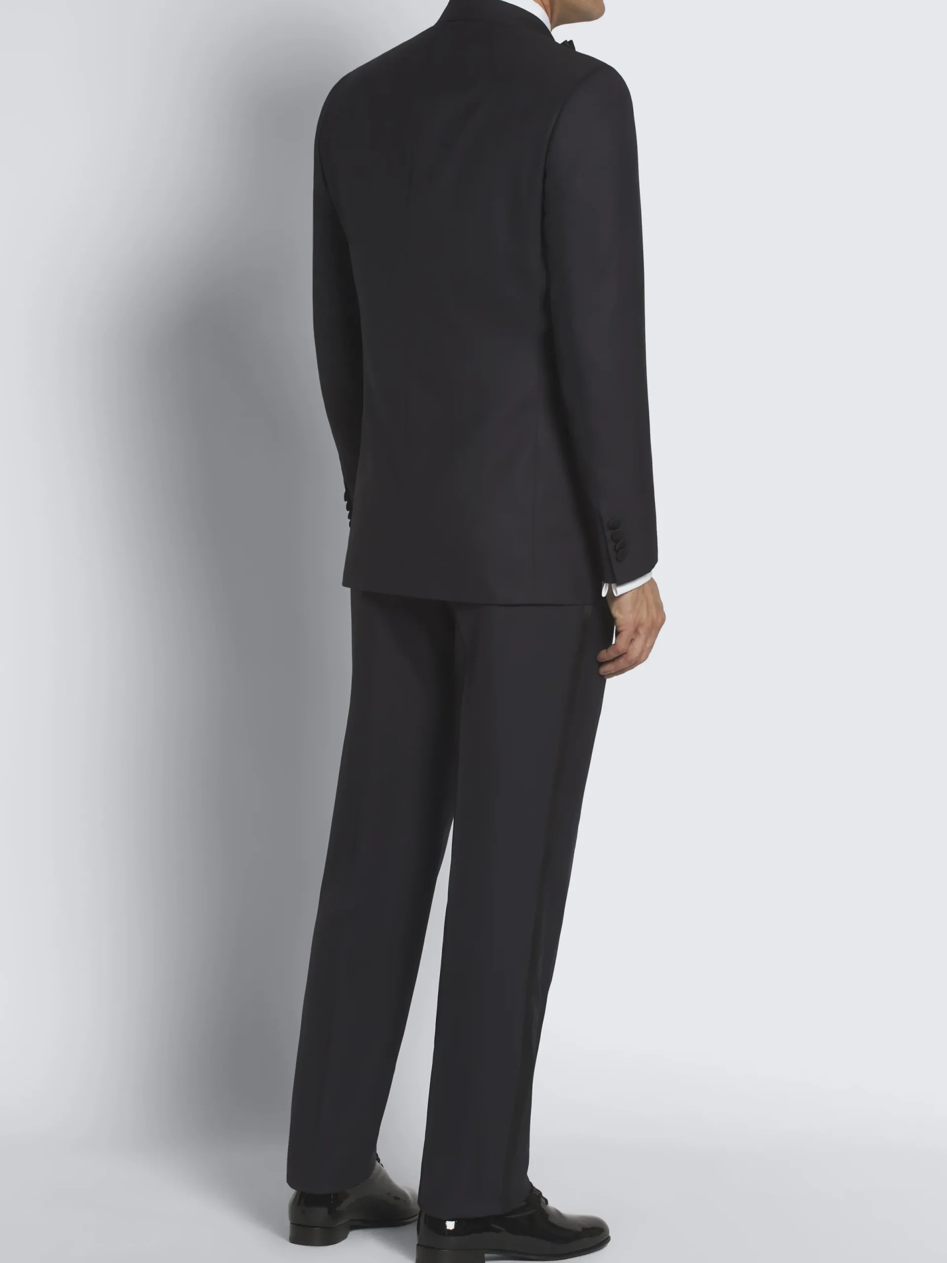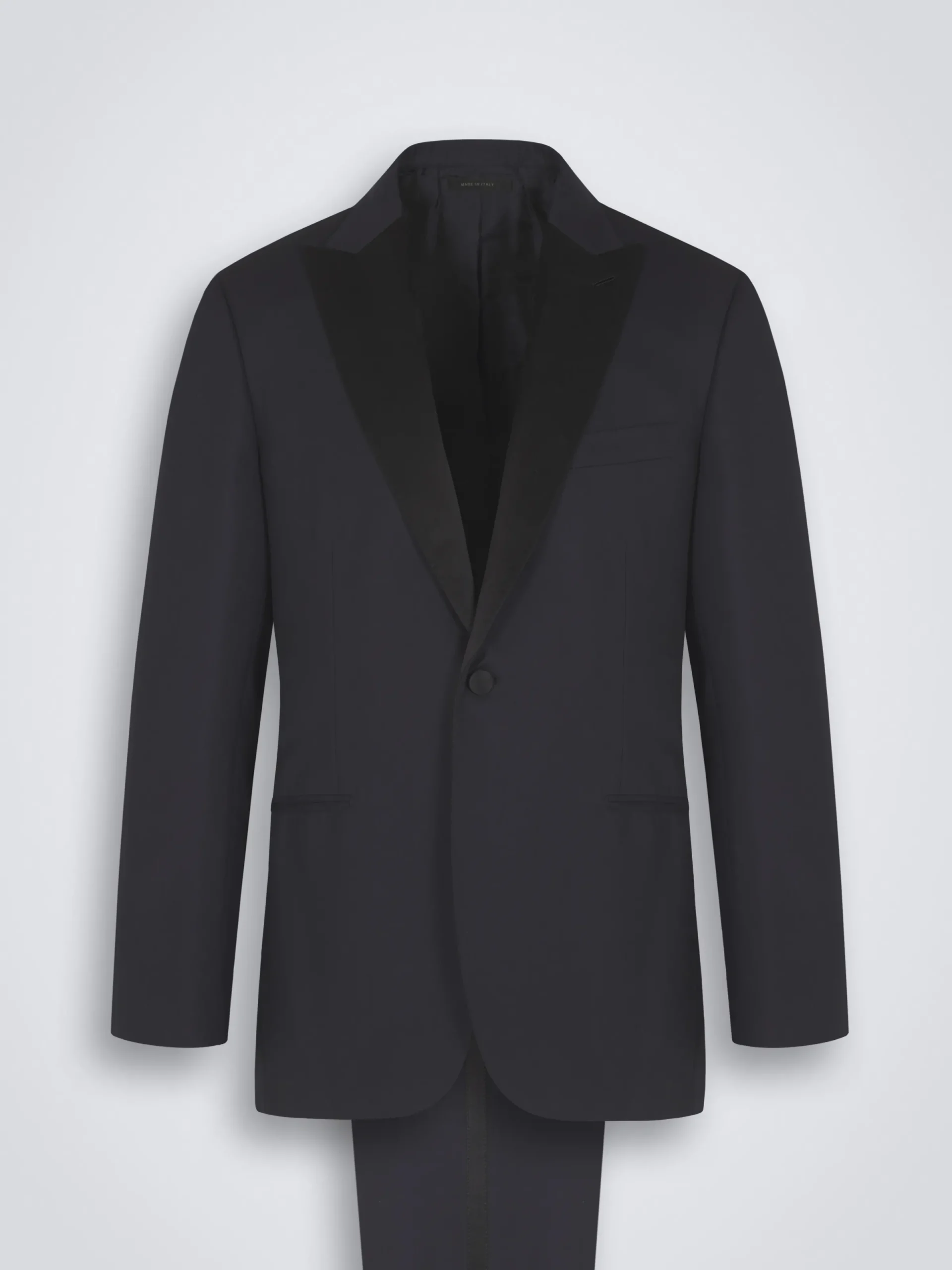 This traditional midnight blue Policleto tuxedo in Super 160’s wool is part of the Brioni Essential Wardrobe. The two button single-breasted jacket features classic satin peaked lapels, while the matching regular trousers features side bands and are internally lined at waist for increased comfort and wearability.