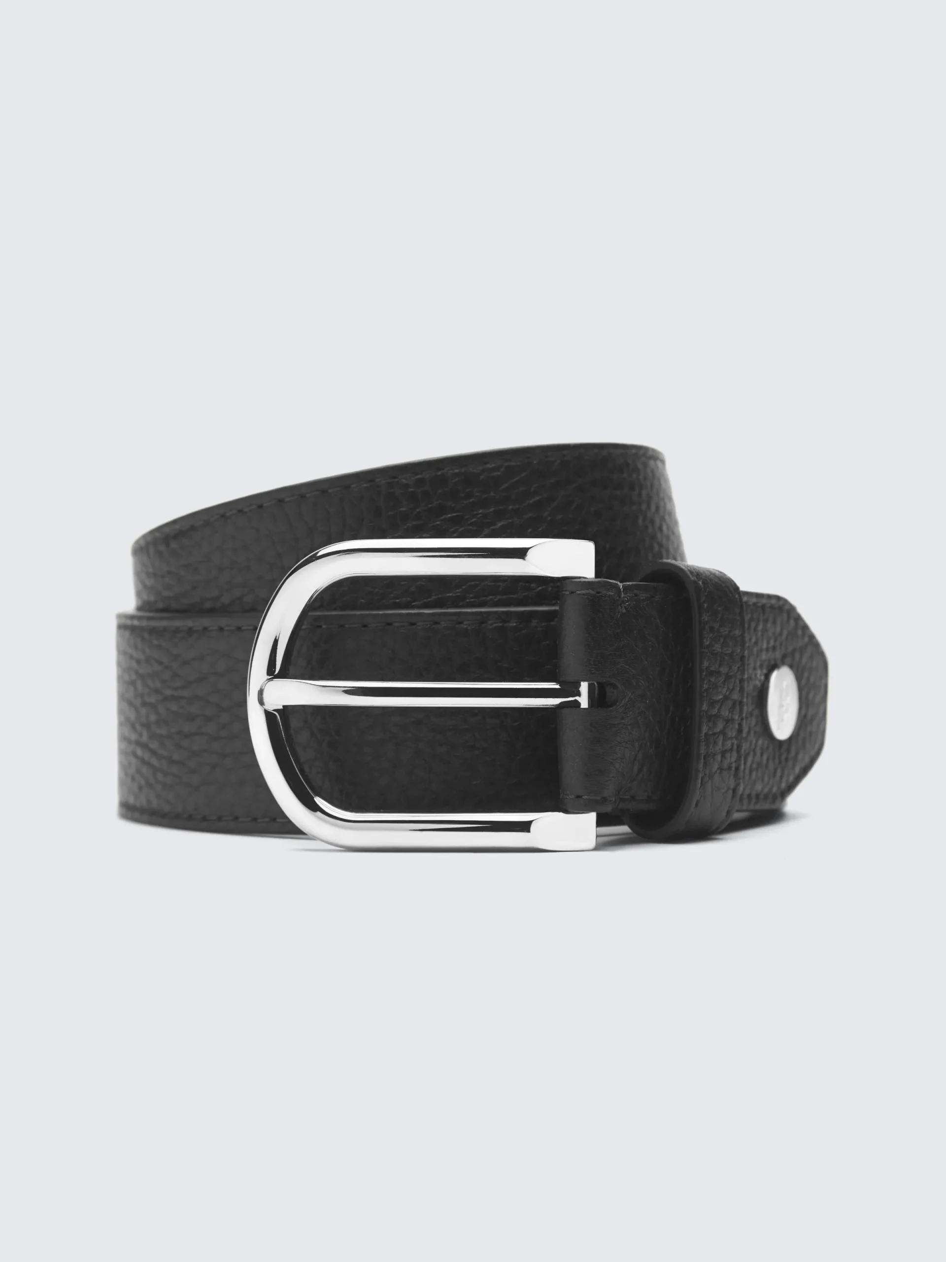Black belt in scratch-resistant grained leather with nappa lining in contrast, with small rounded metallic buckle. This sophisticated belt features stitching all around for improved durability. Thanks to its fine material and elegant design, this piece is the perfect final touch to our casual trousers. This belt has a length of 110 cm.