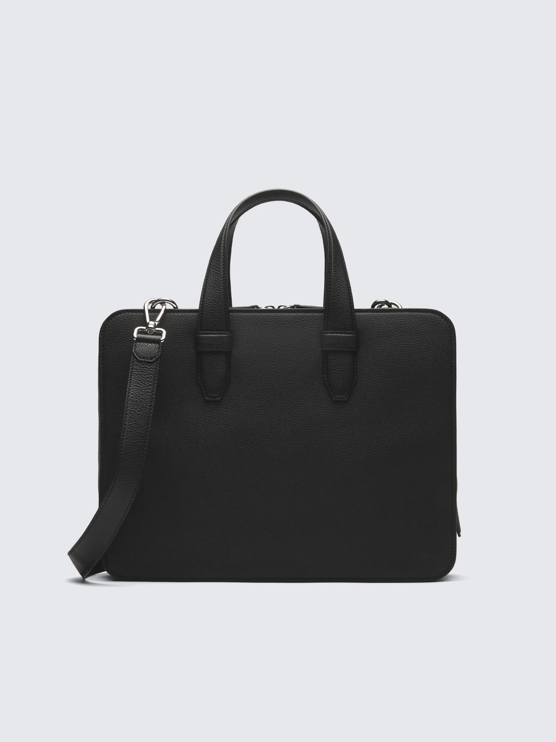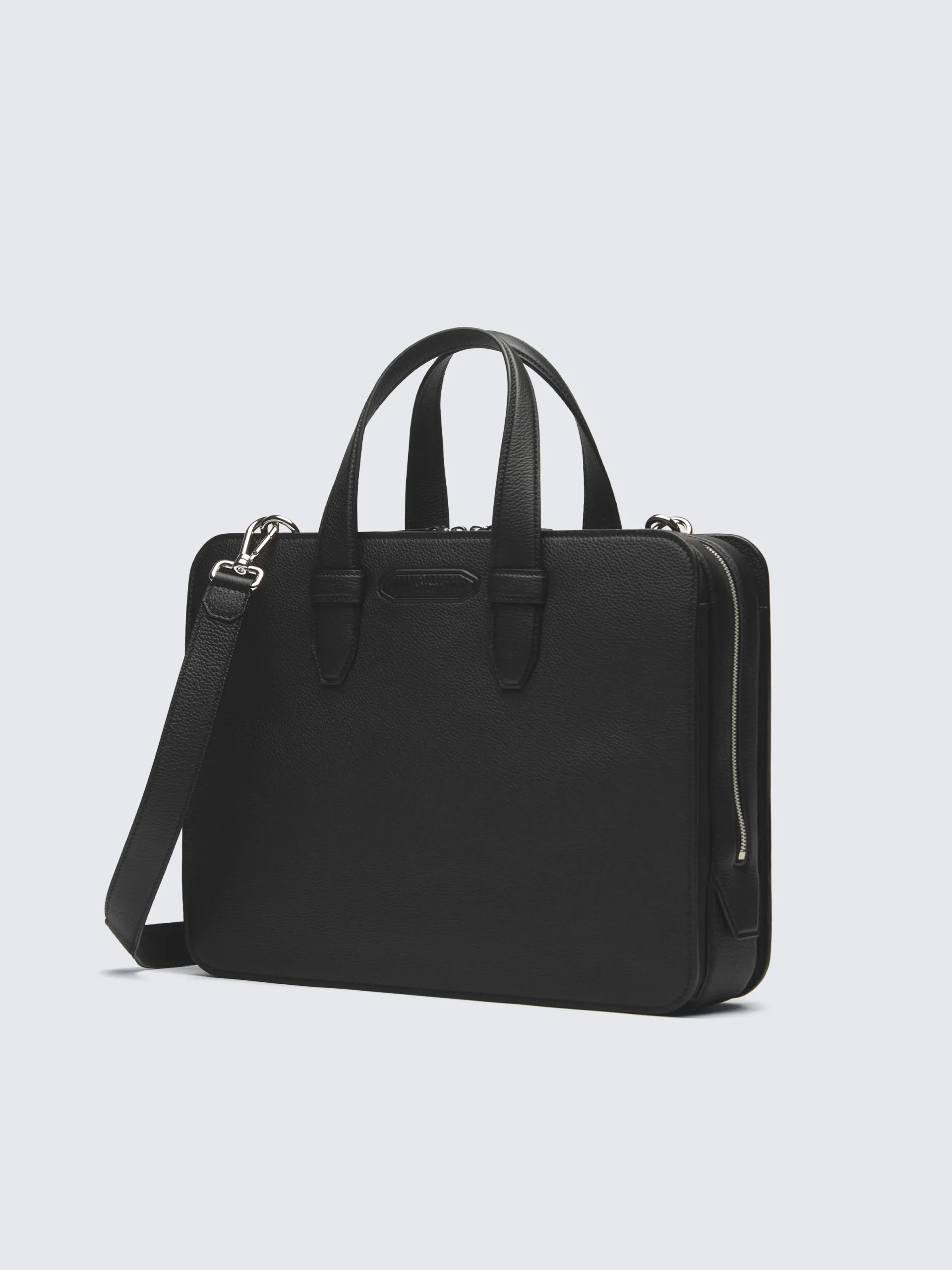 Black grained leather briefcase. It features a superlight and flexible construction, which makes it ideal for everyday business use. It presents a perfectly organized interior, composed by two compartments closed by an upper zip. The briefcase has an adjustable and removable shoulder strap. Made with soft and flexible grained leather, treated to ensure beautiful aging.
