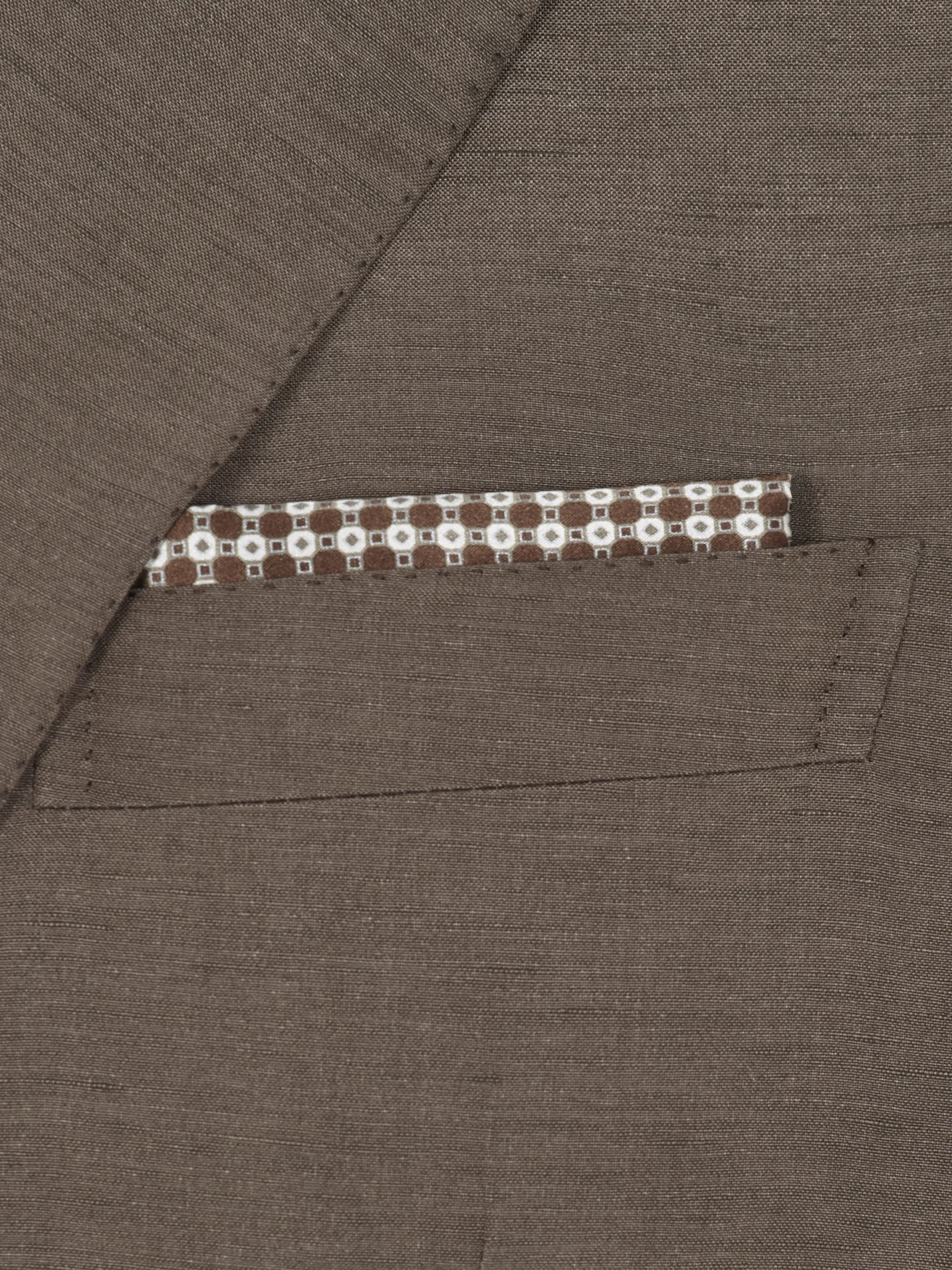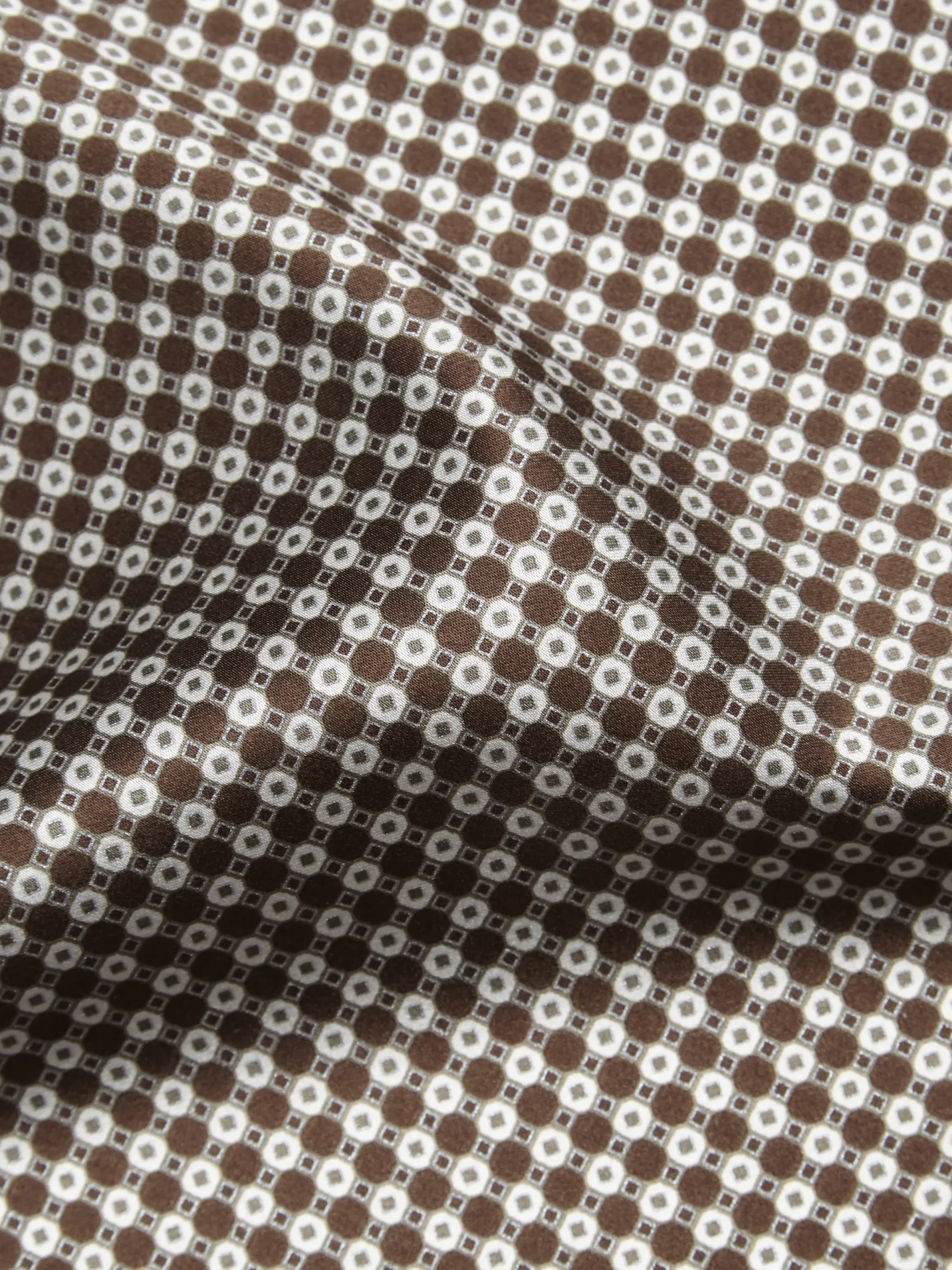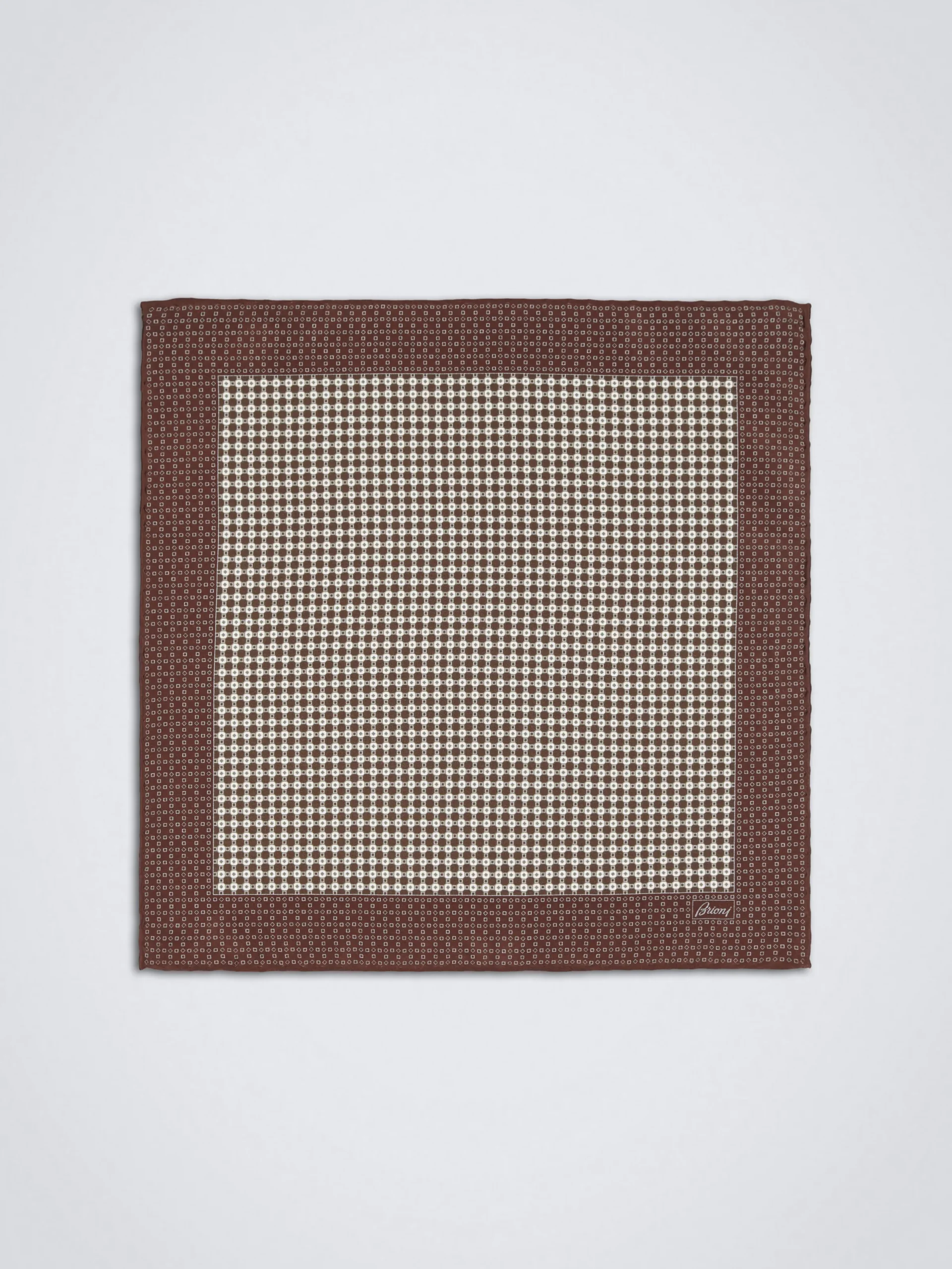 Brown pocket square in super soft silk with printed micro motif and silver pigment. The screen printed technique used to create this accessory, is made in the atelier by highly skilled artisans will allow vivid colour to seamlessly penetrate the most delicate of fabrics in intricate designs. An aesthetic and sensory joy for the contemporary gentleman.
