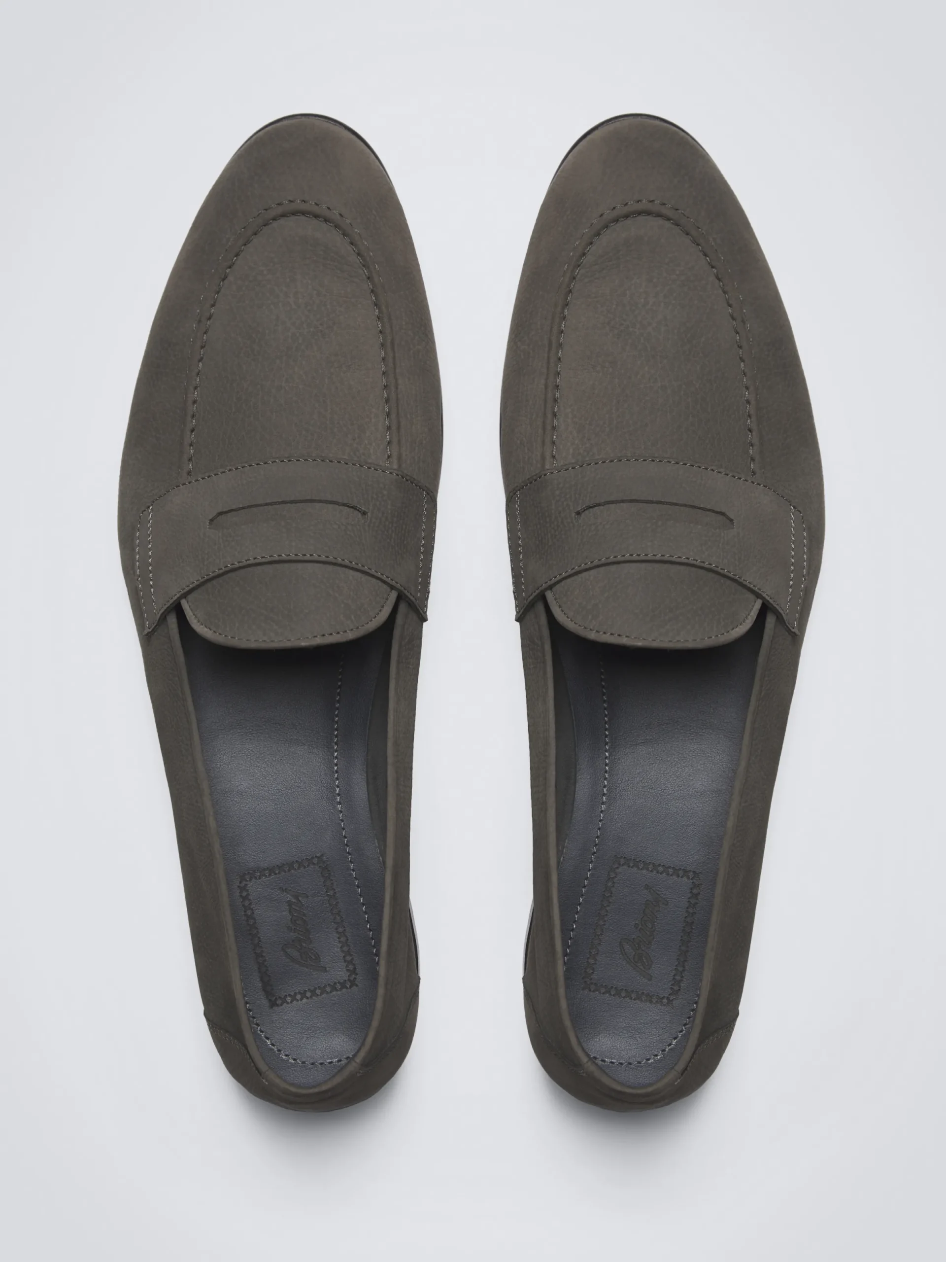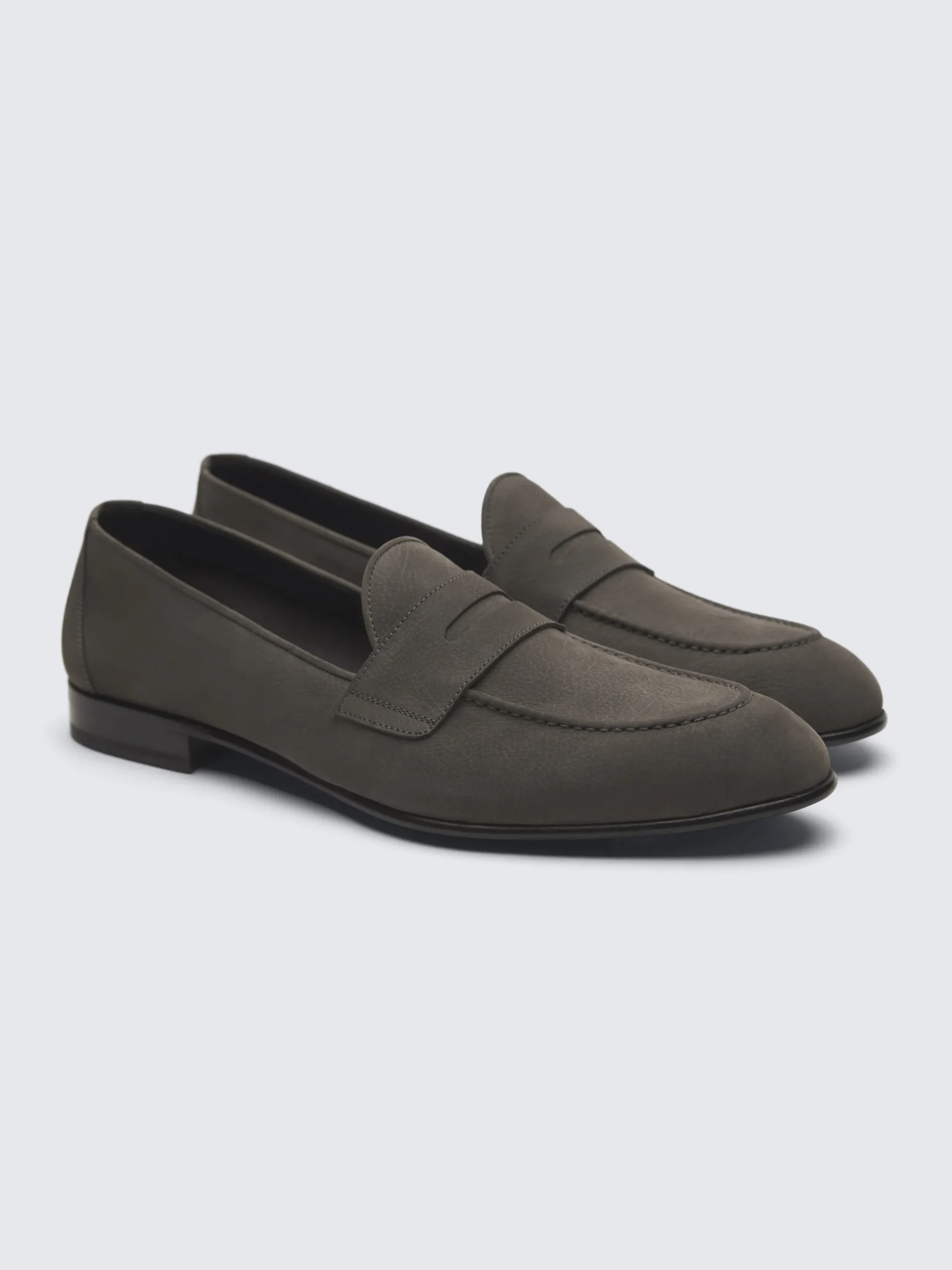 Taupe nubuck Appia penny loafers, an epitome of elegance. Realized in a classic almond shape with extra flexibility in the sole, resulting in a refined look with unparalleled comfort. Nubuck is recognized for its soft velvet touch and renowned for its finishing. The outer side of the raw skin undergoes a sanding treatment that erases the first layer of the leather to obtain a powdered texture. It is a very refined tannery process which makes the shoes even more valuable. Named after the extensive Roman road, the shoe was born as a challenge for the classic moccasin to suit long walks. A timeless rounded shape complements the natural movement of the foot. An elegant icon that fits like a glove.