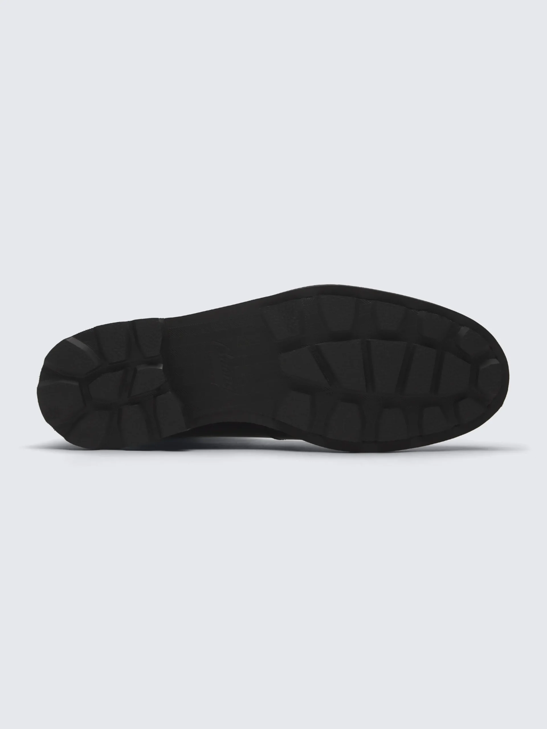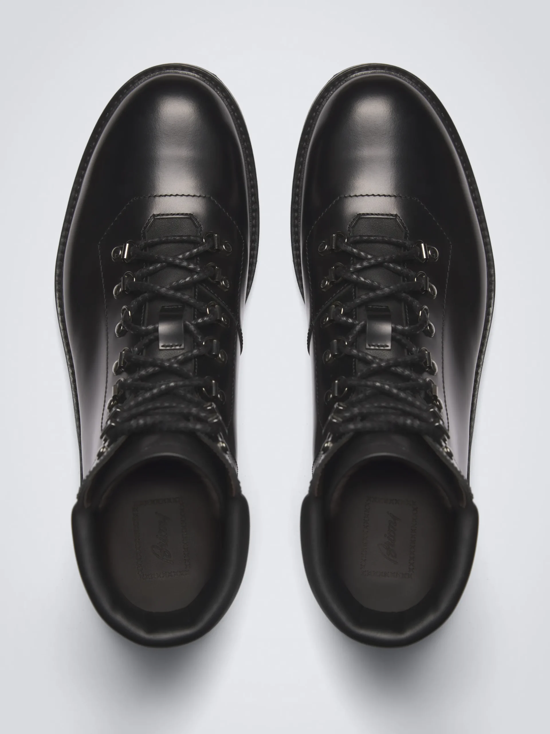 Black oiled calf leather St. Moritz hiking boots. Featuring a rounded last, metal eyelets and classic alpine eyelets for faster and easier lacing above the ankle, padded ankles for added comfort, embossed logo with bevelled shape on the back, finished with rubber sole. These boots are the combination of high quality and luxury, ideal for a relaxed weekend on the mountains for the perfect laid-back look.
