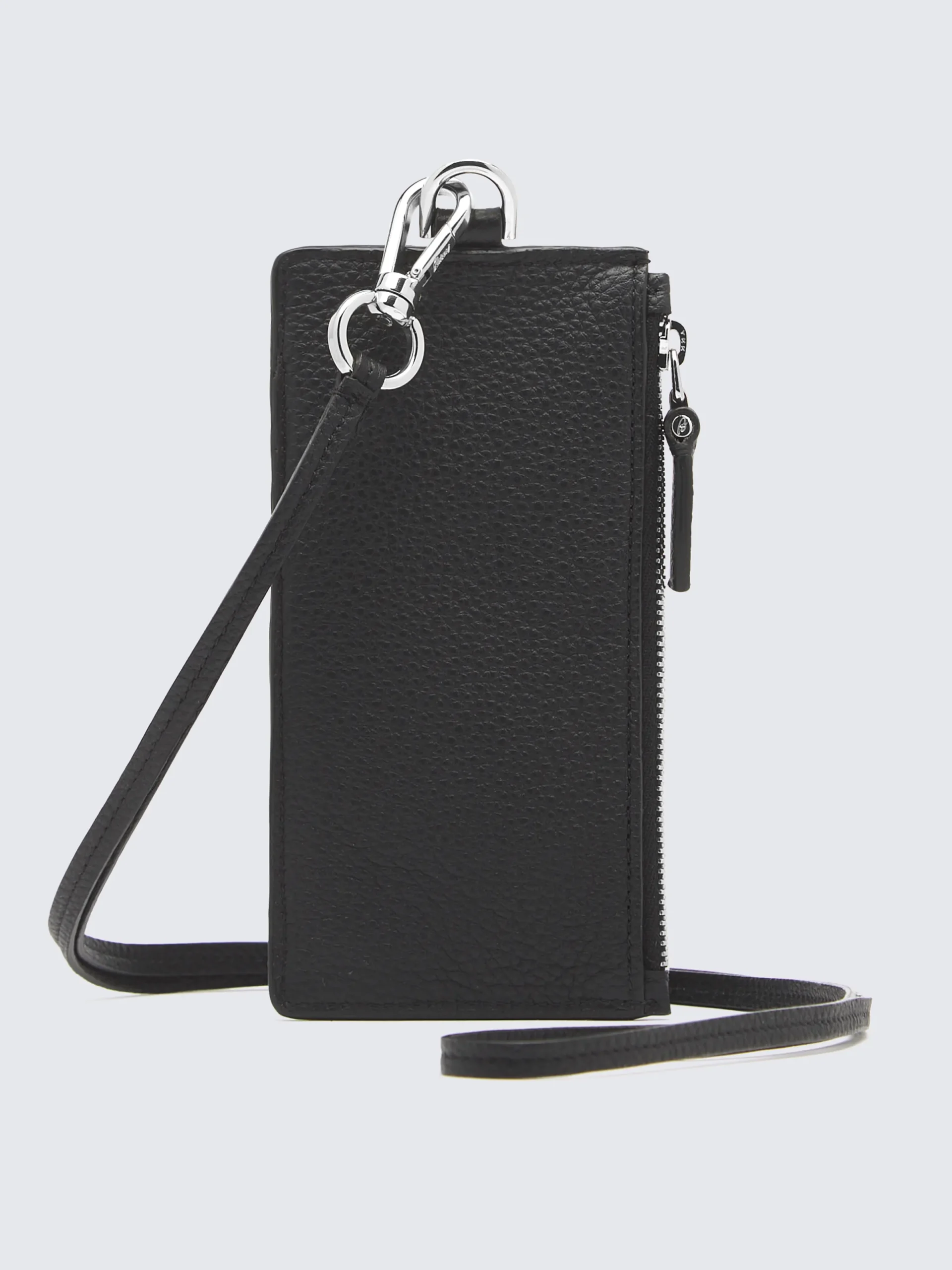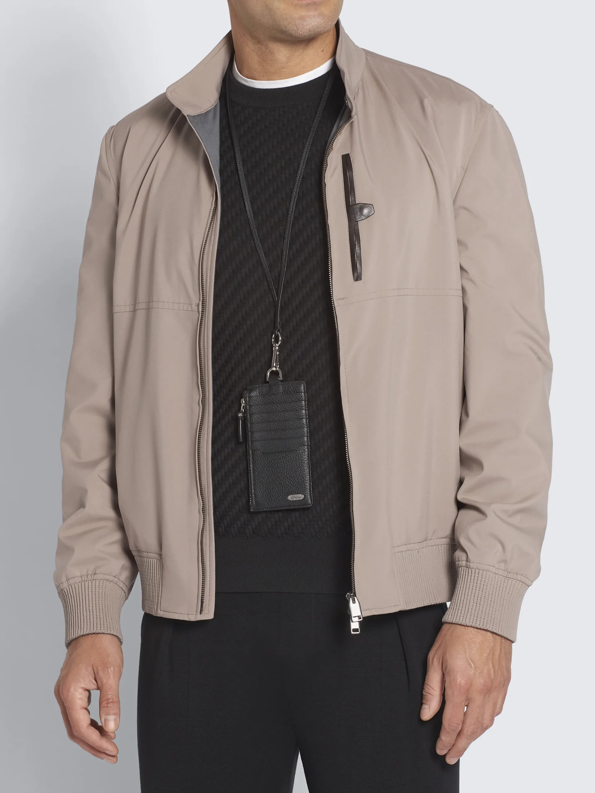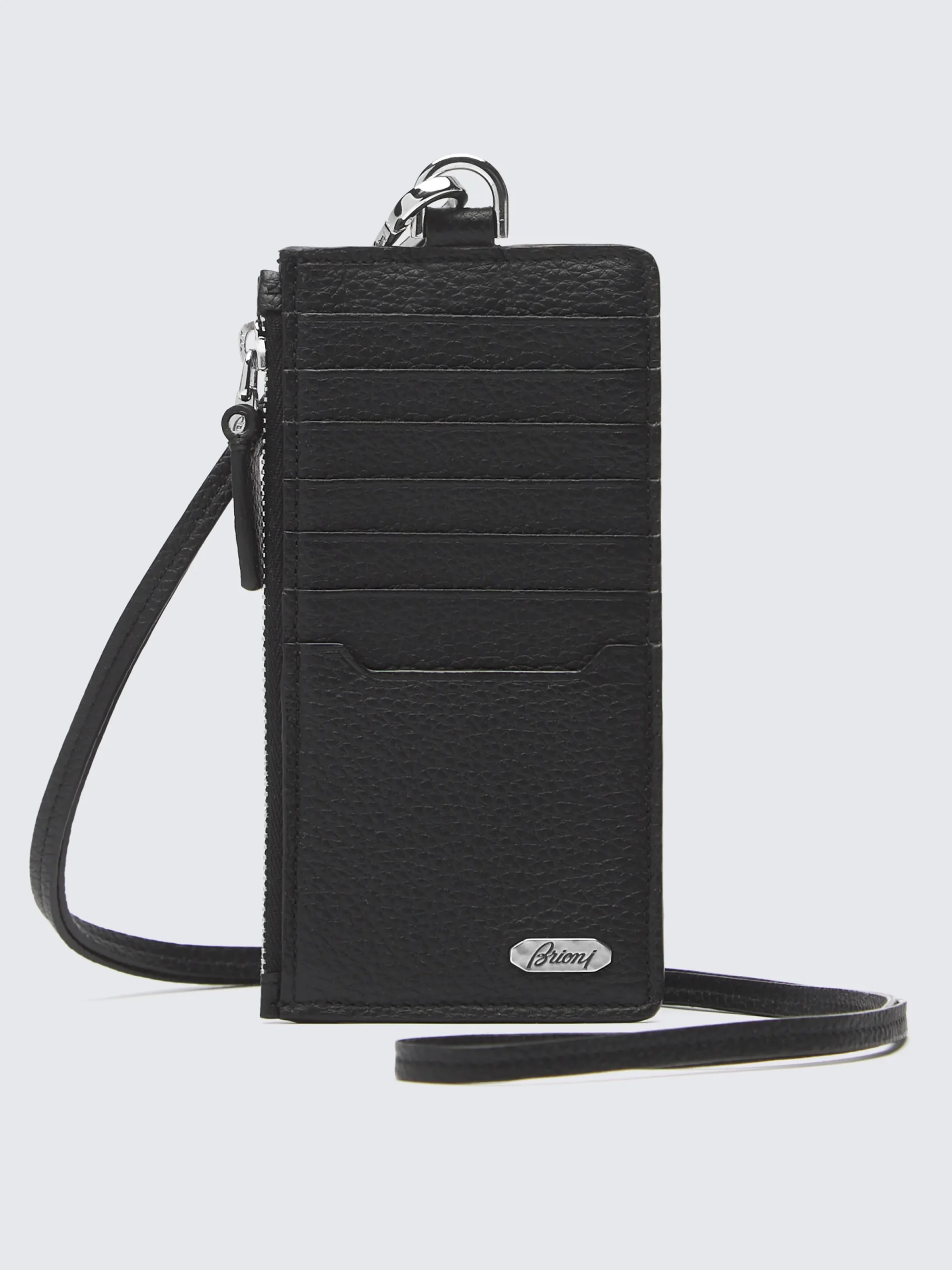 Black and taupe credit card case made from 100% soft grained leather, featuring a removable neckband and a zipped pocket on the side for additional space. The iconic octagonal Brioni logo fully integrated into the leather, making it smooth also to slide into a pocket. A functional accessory, perfect for a touch of personal luxury or ideal for gifting. This piece is scratch-resistant: designed to last, the treatment of this exceptionally fine leather ensures that it ages beautifully over time.