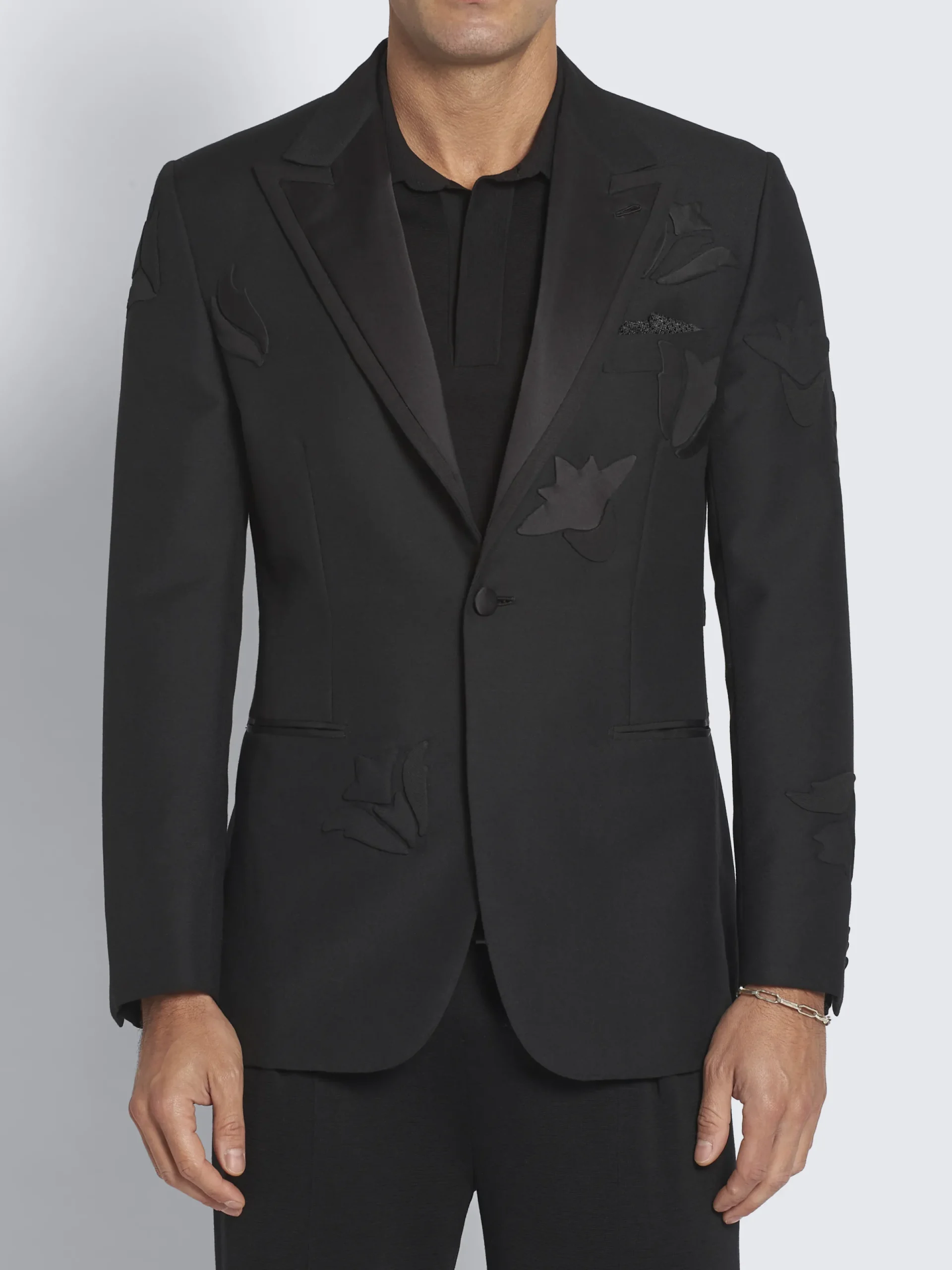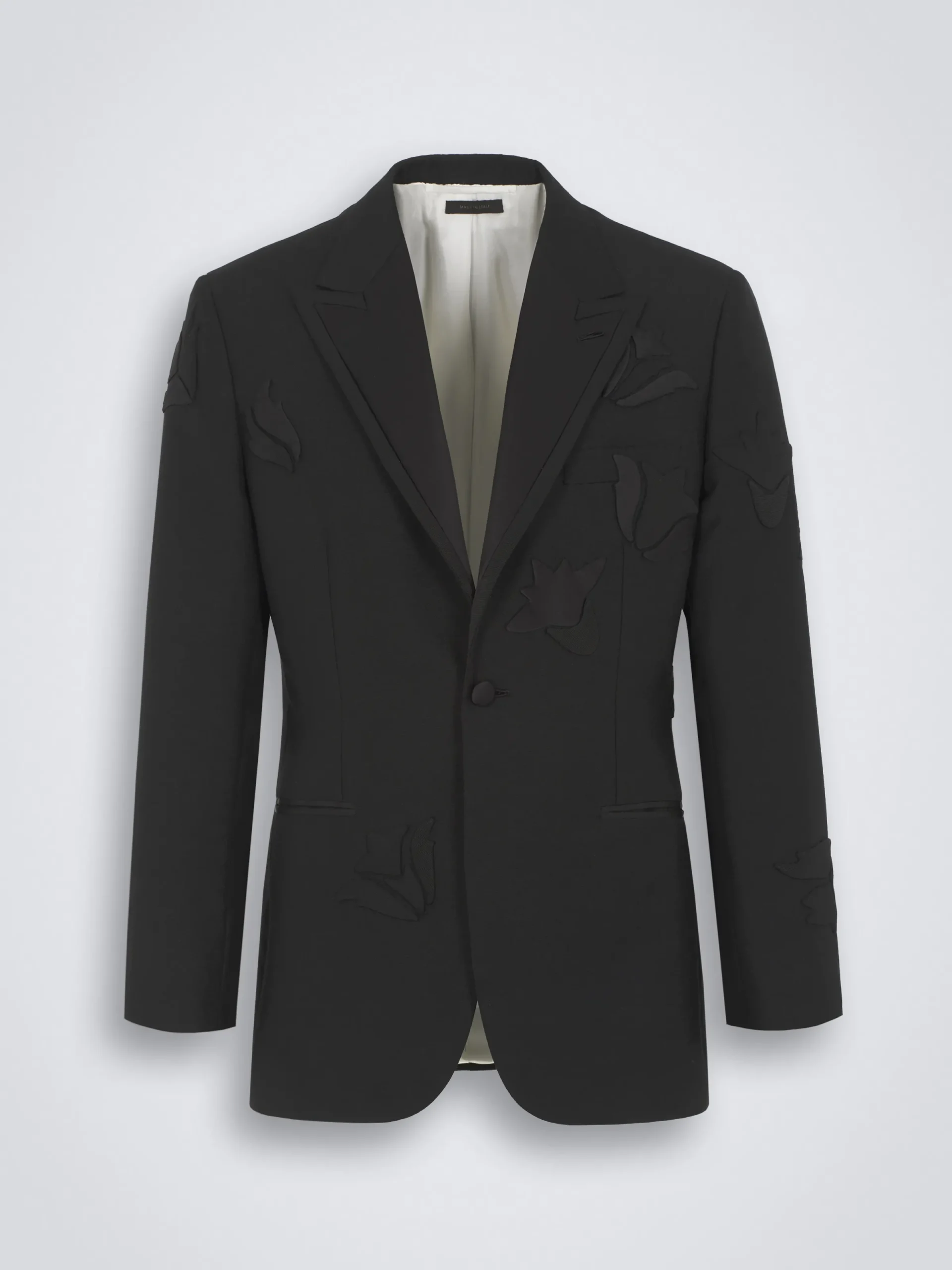 This Brioni evening jacket is the finest expression of couture tailoring, handcrafted only by master artisans in Italy. Its name takes inspiration from the narciso, the flower, represented through the ornament flowers on the jacket. Each flower shape is different and made of three materials: mohair wool, silk satin and silk file. These will not only emphasize the 3D effect of the petals, but will also reflect different lights. All the petals are made and applied by hand, with a very meticulous sartorial technique that requires several steps and time. In this masterpiece, delicate and subtle details are married with fine fabrics resulting in the most distinguished eveningwear style, perfect for the most exclusive of events.