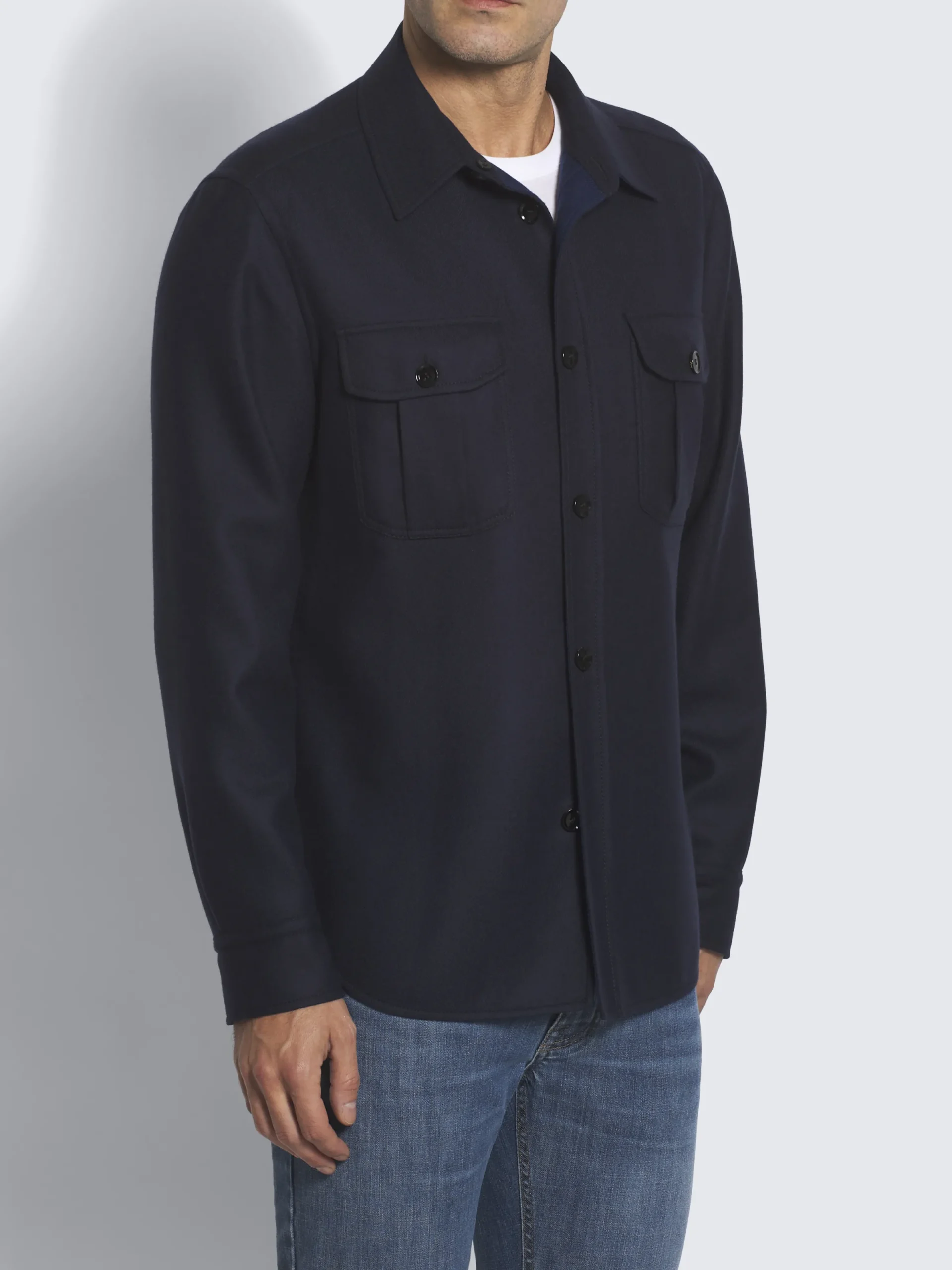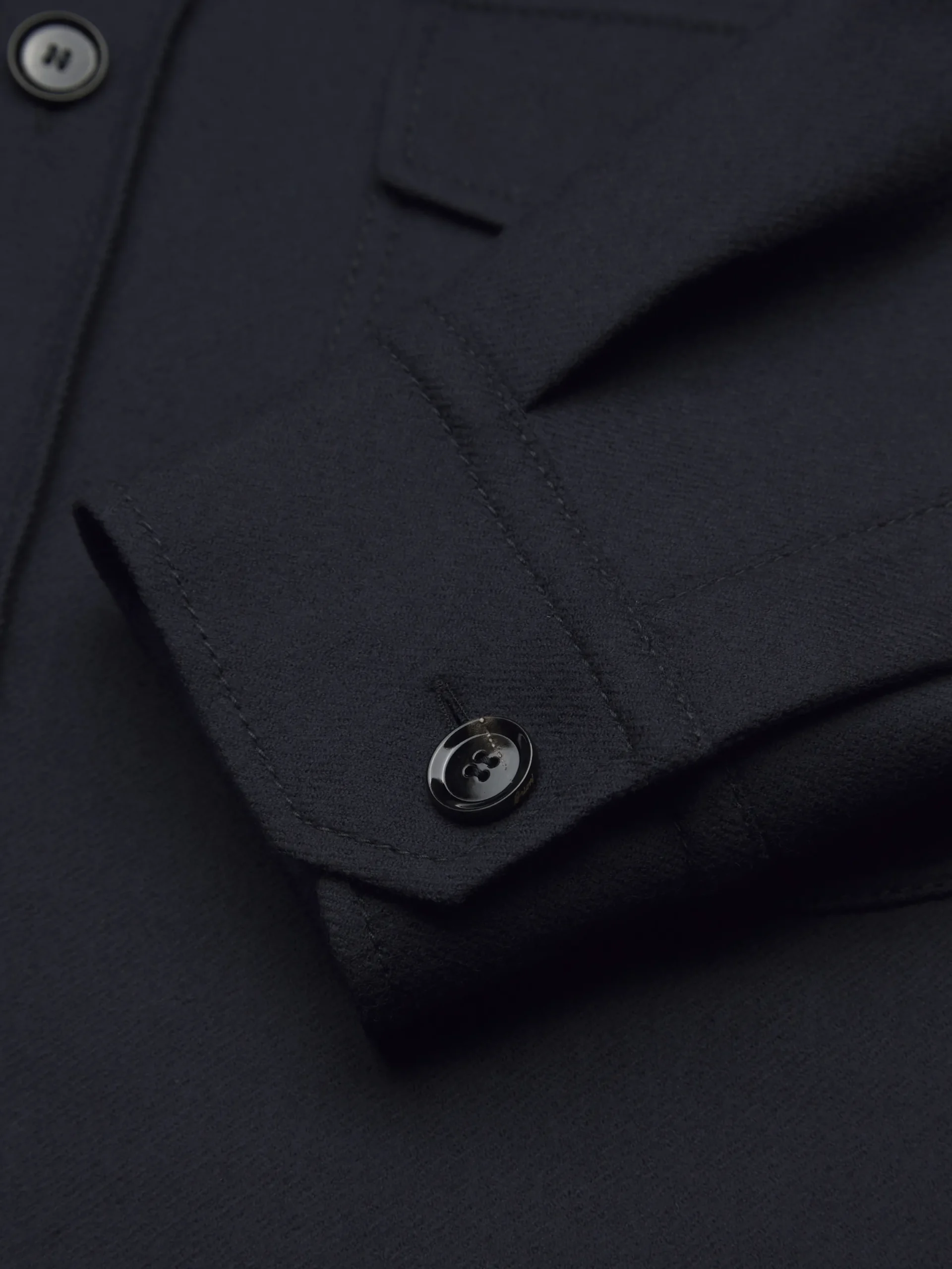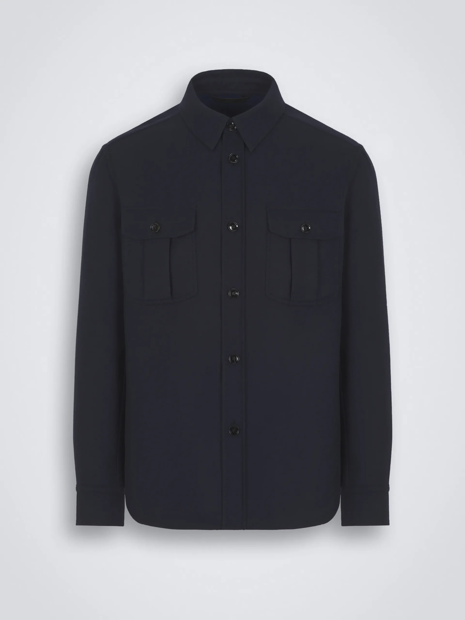 Navy blue double-splittable wool Vagabond overshirt with royal blue interior, featuring shirt collar, two chest patch pockets with bevelled shape and horn button flap closure, one internal pocket with button closure and half bevelled shape cuffs. The hem gusset presents the “B” logo in leather. This beautiful yet functional piece will be an elegant addition to your smart casual look when comfortably layered with a shirt or T-shirt underneath.nThis piece features our iconic double-splittable fabric: in this construction, the faces of two separate fabrics are painstakingly and invisibly sewn together giving the aesthetic and fluidity of a single cloth. The edges are finished by hand by the finest craftsmen using a technique handed down through generations, displaying sartorial know-how at its best.