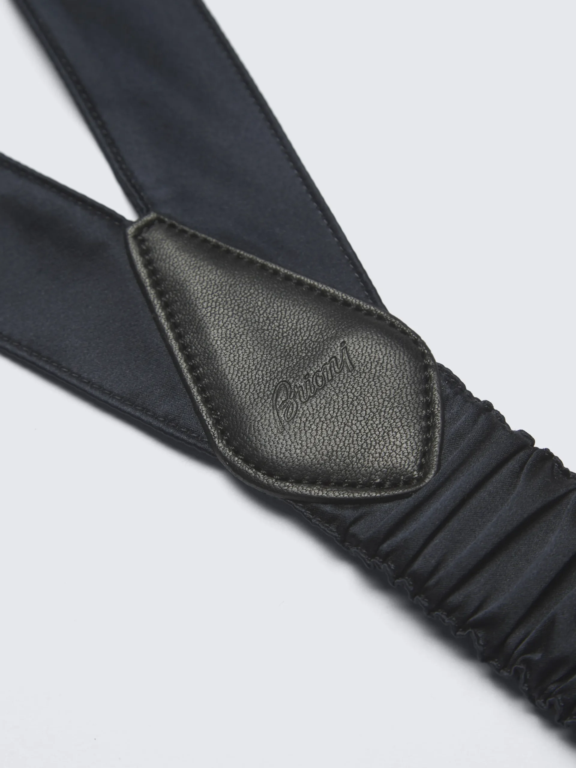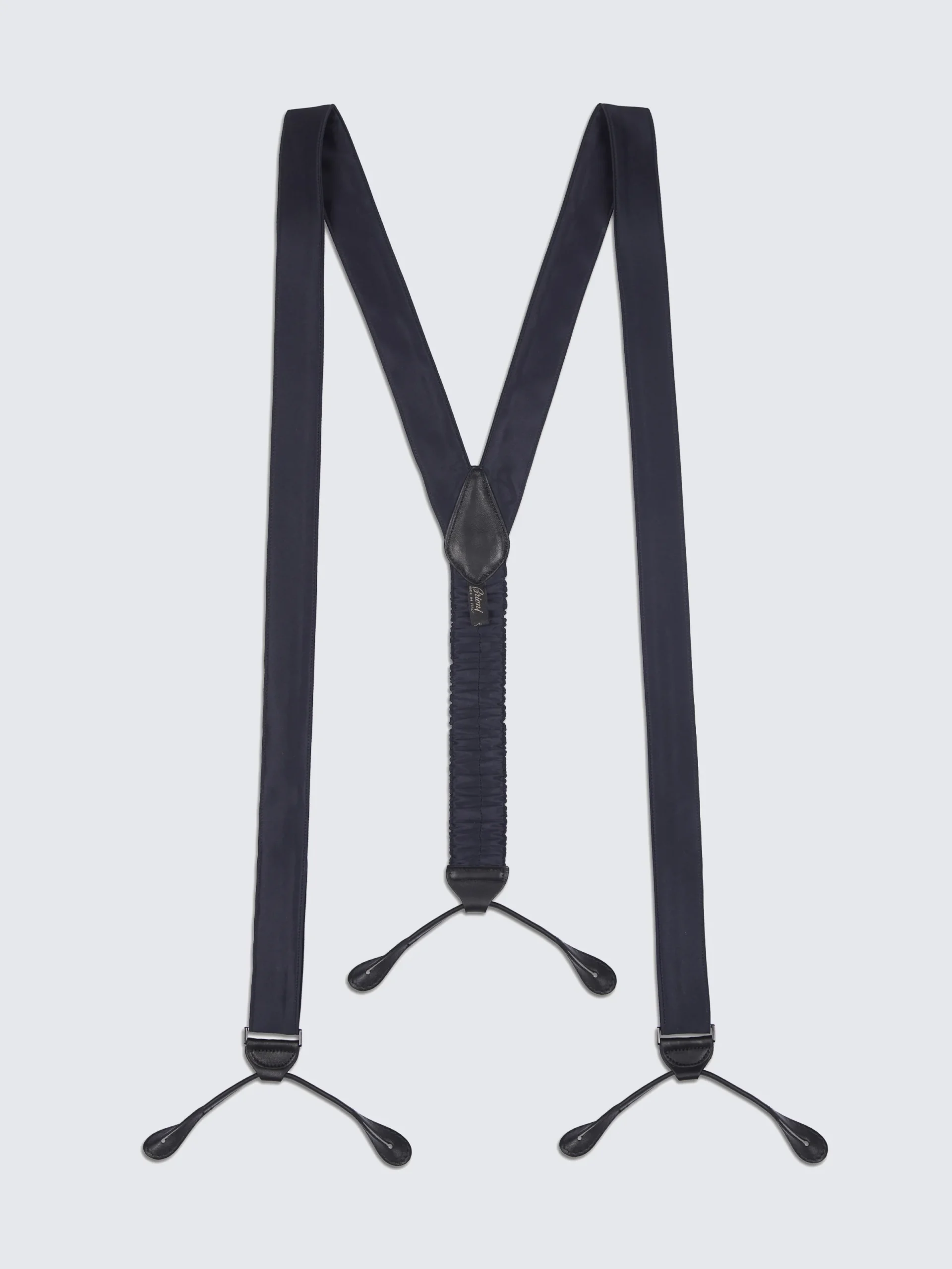 Essential midnight blue adjustable suspenders in satin silk. This elegant accessory is perfect in combination with a classic tuxedo.