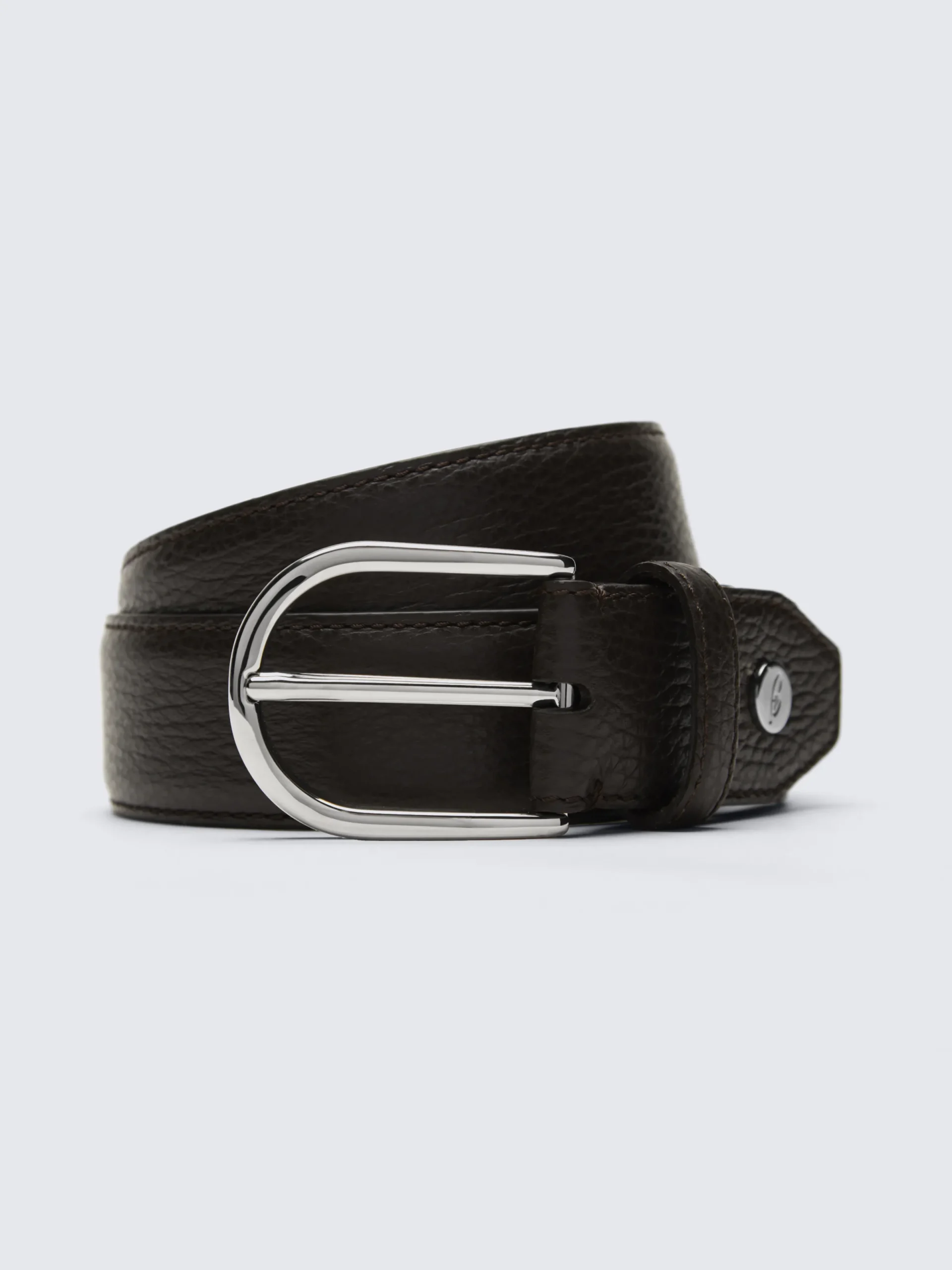 Dark brown grained calf leather belt. Adjustable, it features a shiny palladium finished rounded buckle, bevelled ends and « B » logo detail. With smooth leather on the inside, it is the perfect complement to a variety of different looks.