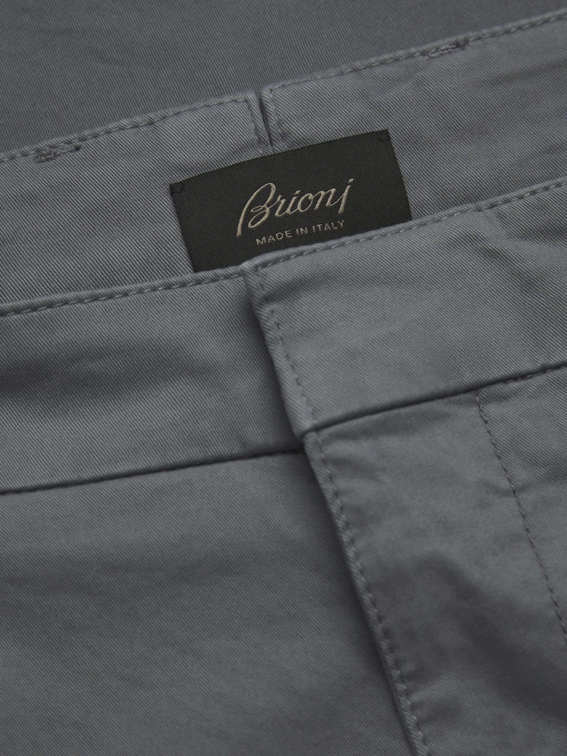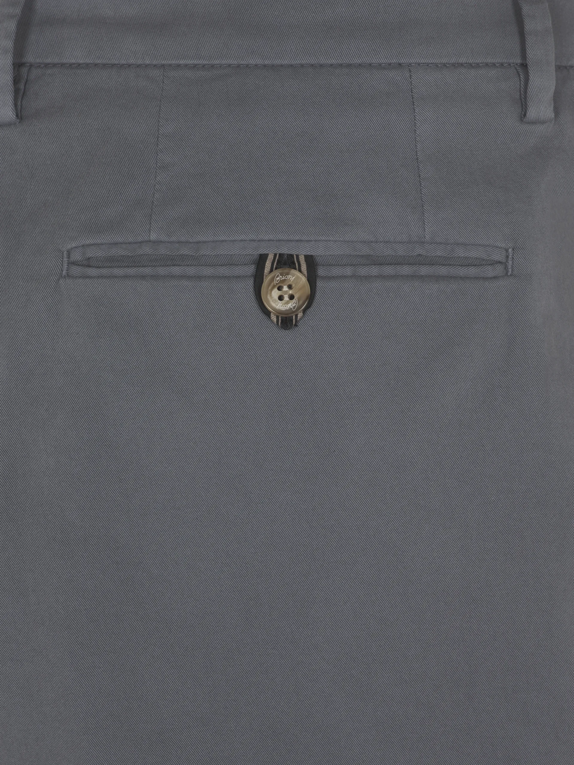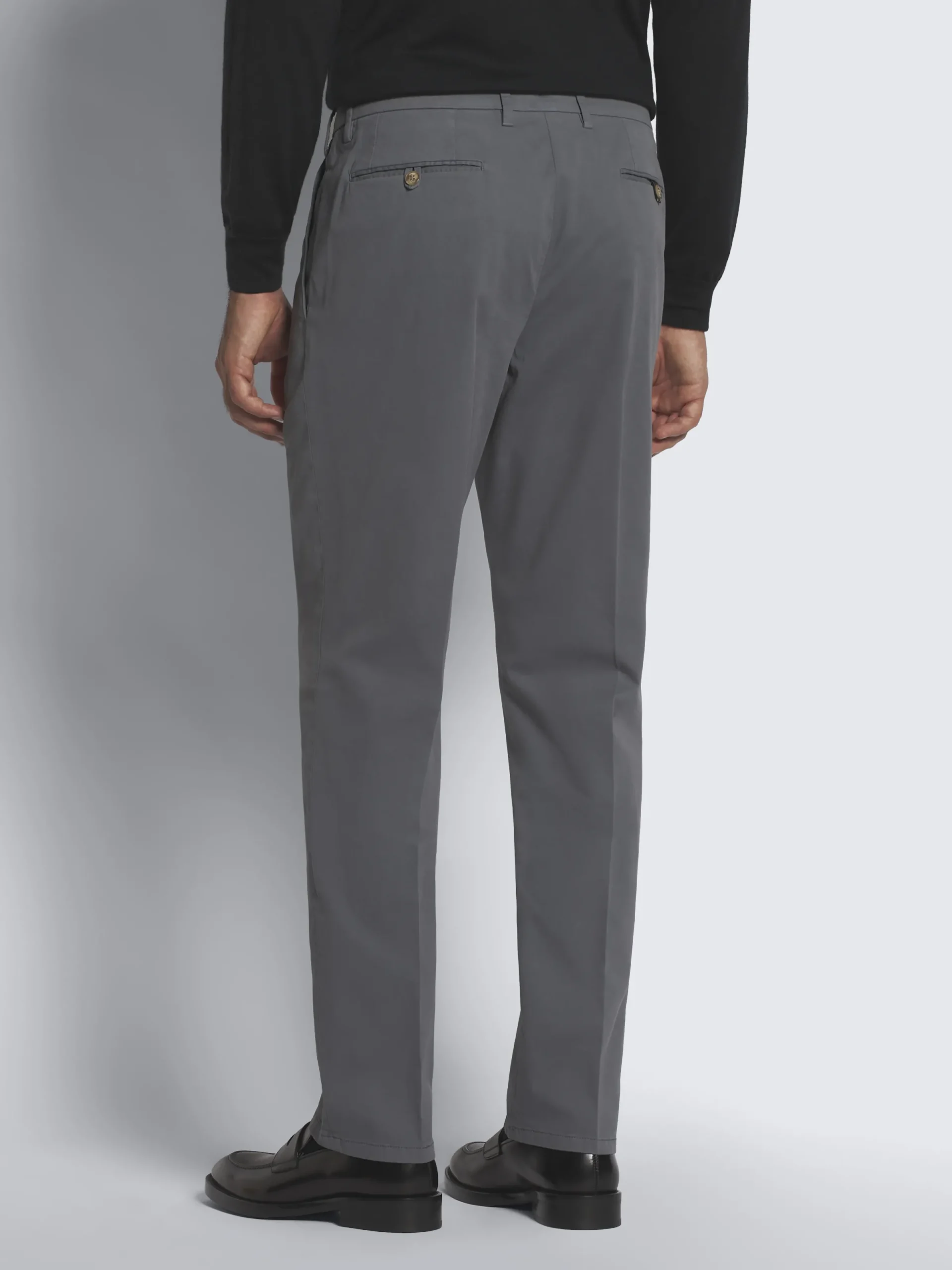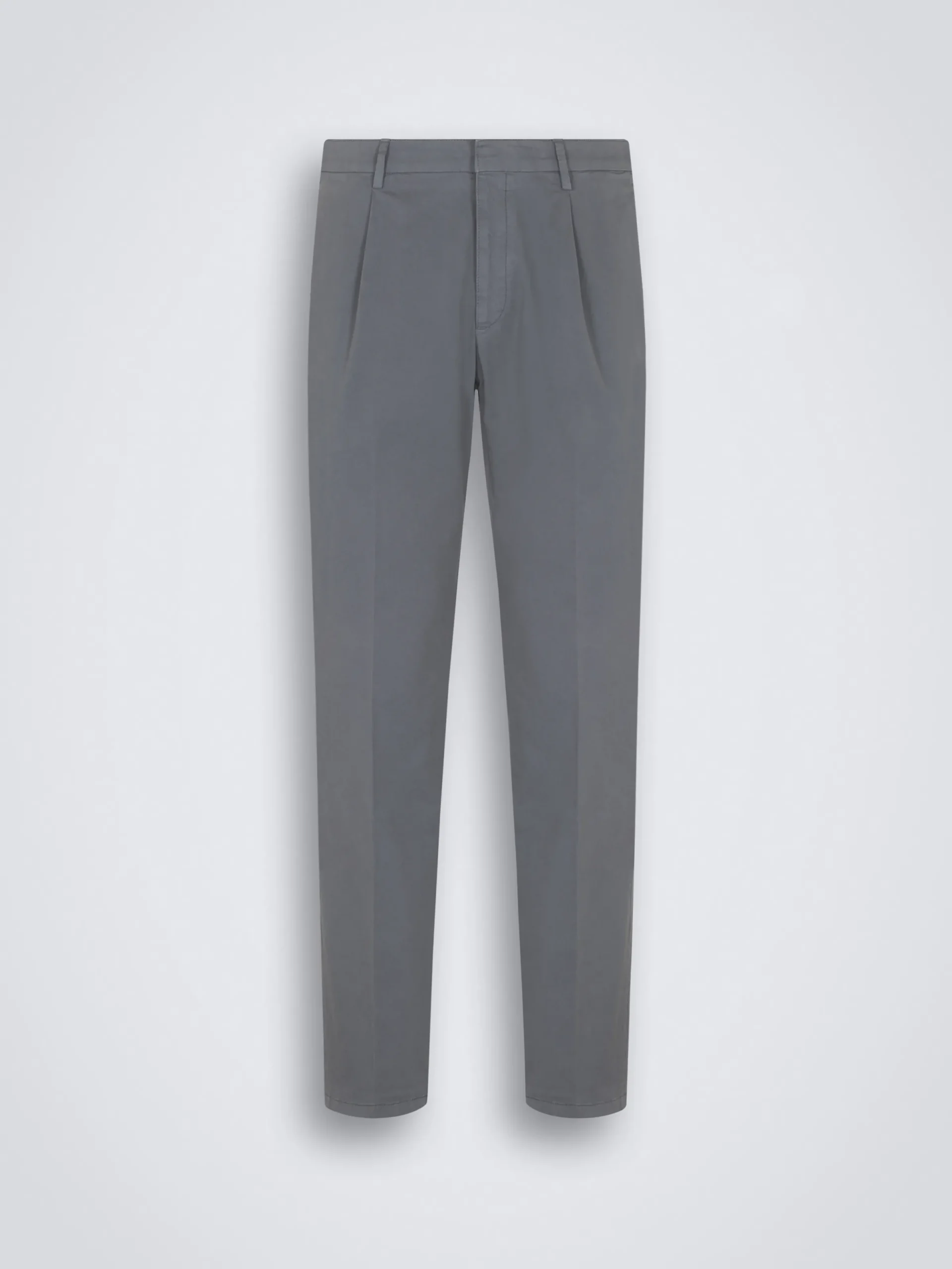 Grey stretch organic cotton Pienza trousers. Featuring a zip fly closure, single open pleats, two side slant pockets, two back pockets with button closure and regimental loop detail and belt loops. Ultra-versatile, these trousers are perfect paired with sneakers, suede loafers or even a derby for an effortlessly refined aesthetic. This garment contains GOTS certified cotton. The Global Organic Textile Standard (GOTS) is a voluntary standard obtained by verification through independent third-parties. Practices include requirements on environmental management and wastewater; protection of health, safety and rights of employees; avoidance of hazardous substances.