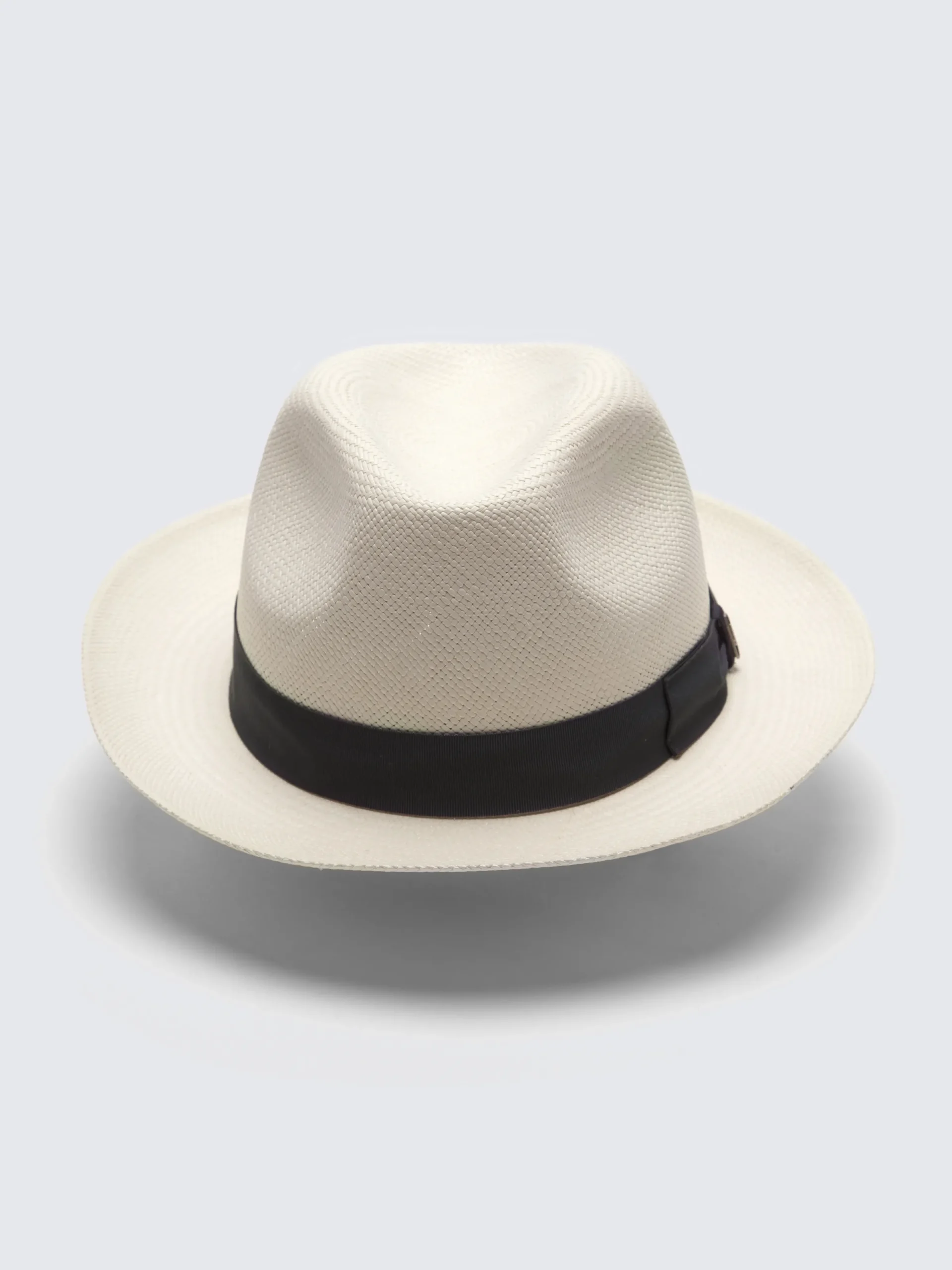 Classic white Panama hat featuring a midnight blue ribbon in cotton grosgrain. This Brioni summer staple is crafted in natural fibers from Ecuadorian artisans and completely hand-made in Italy. Style it as a timeless yet uplifting fashion statement with our black beach shorts and linen shirt for the perfect look.