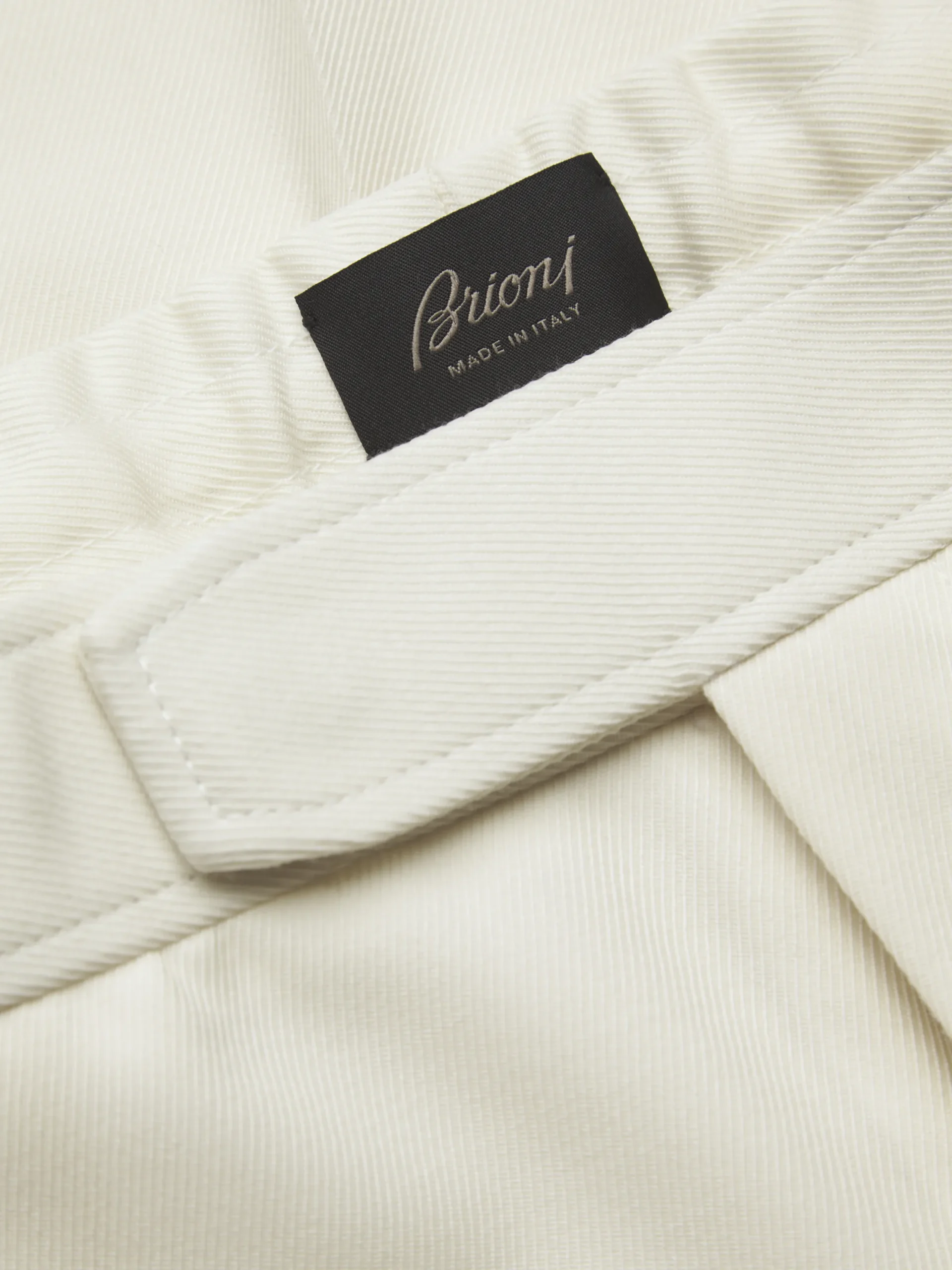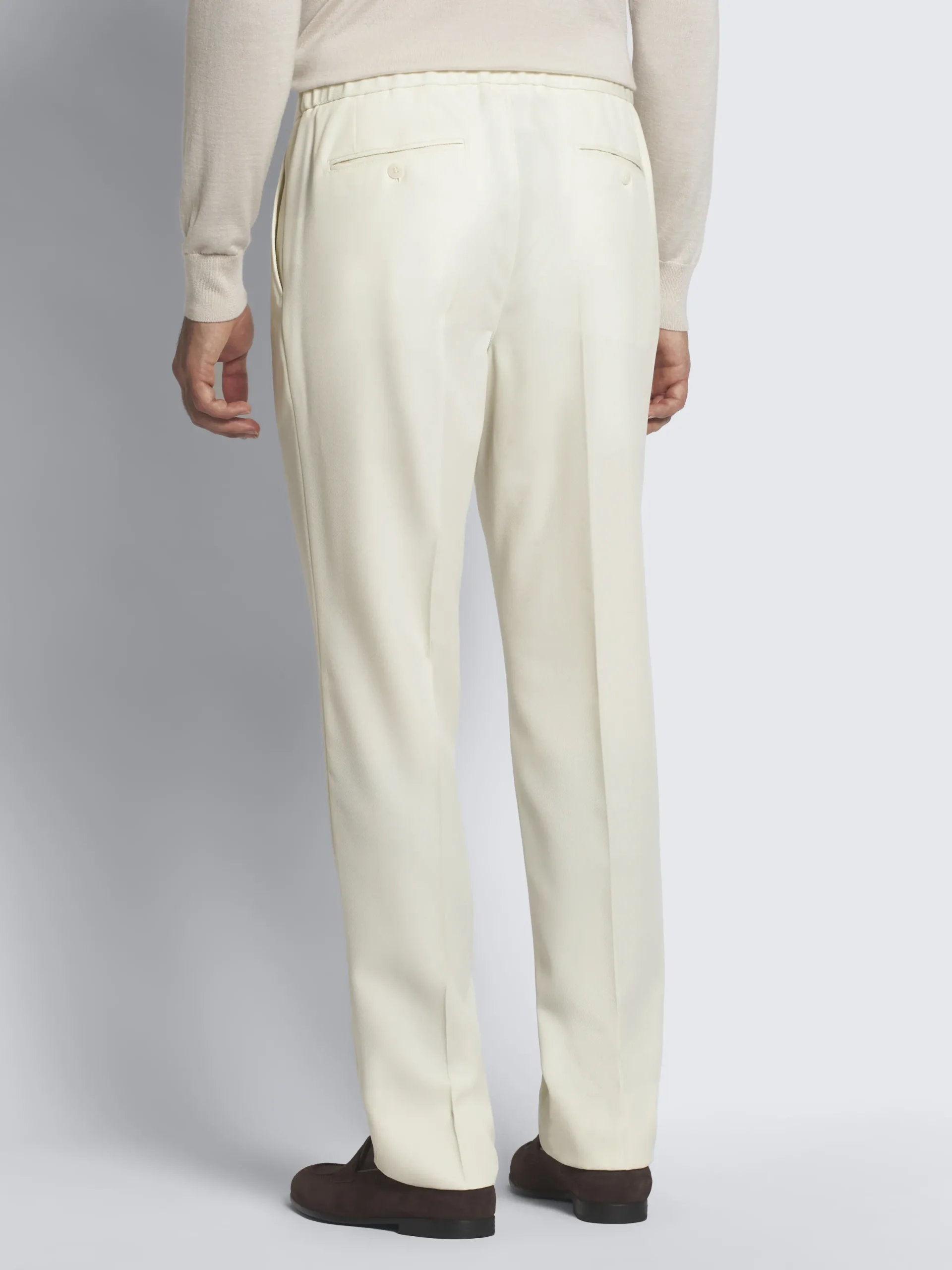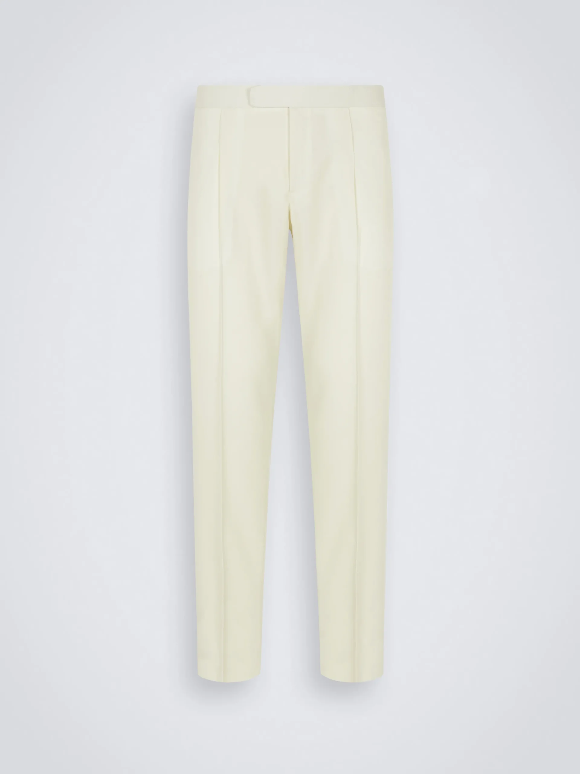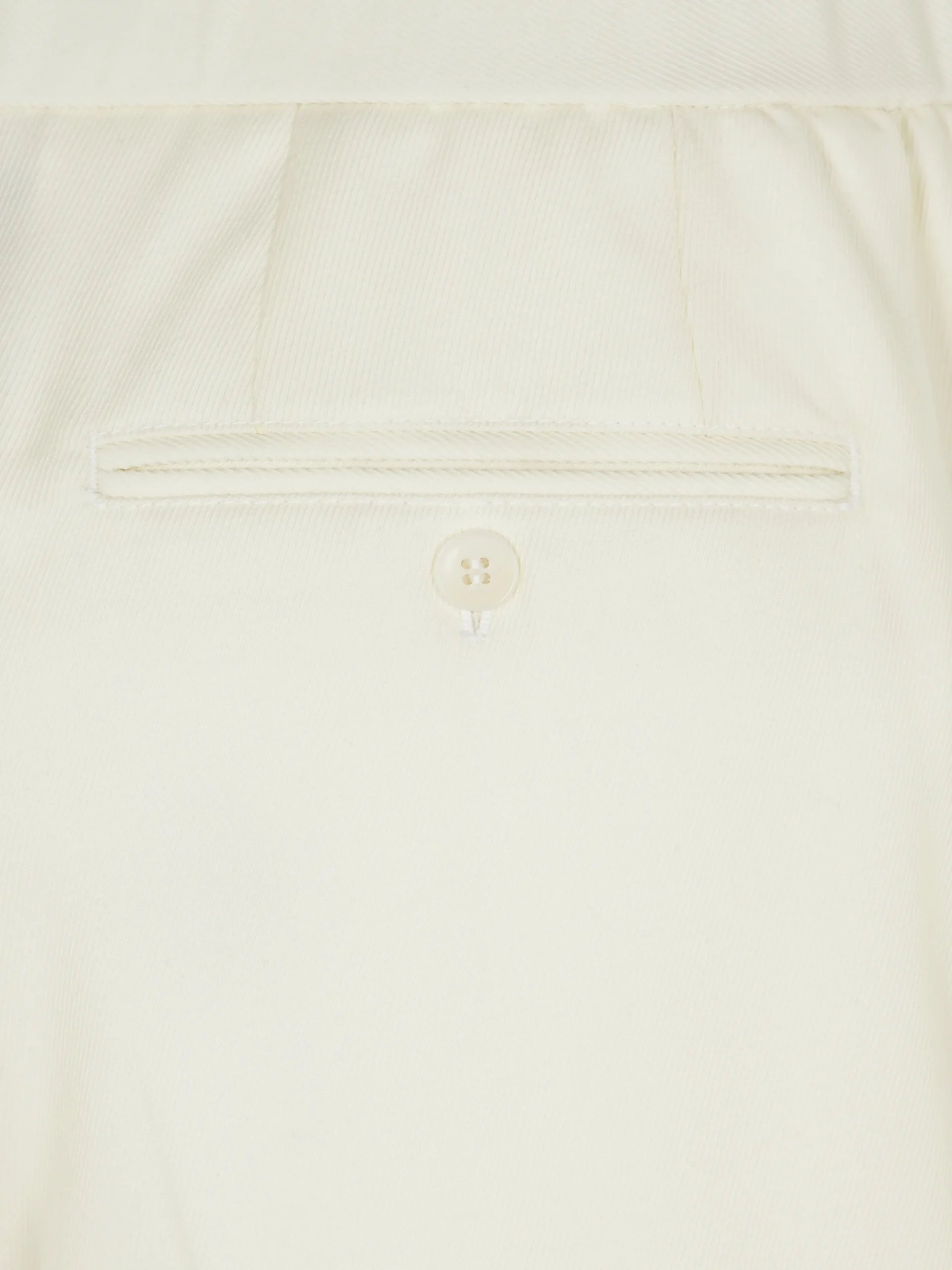 Ivory white responsible wool cavalry twill Melbourne trousers. Featuring a zip fly and extended waistband with metal hook closure, and internal drawstring waistband with leather cord stoppers with « B »logo for additional practicality. Enriched by topstitched pleats, two side pockets and two back jet pockets with button closure, these trousers result in a refined garment with extremely comfortable fit.nThis garment contains RWS wool. The Responsible Wool Standard (RWS) is a voluntary standard obtained by verification through independent third-parties. RWS farmers and ranchers are evaluated against animal welfare, land management, and social requirements set in the standard.