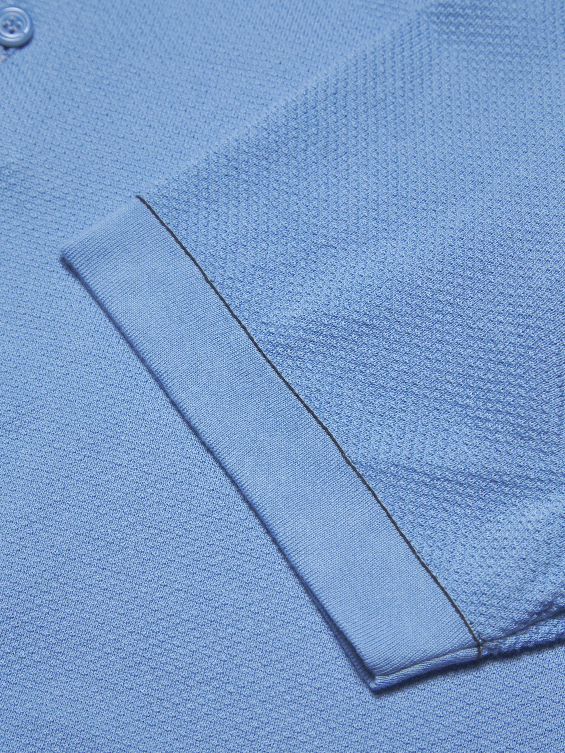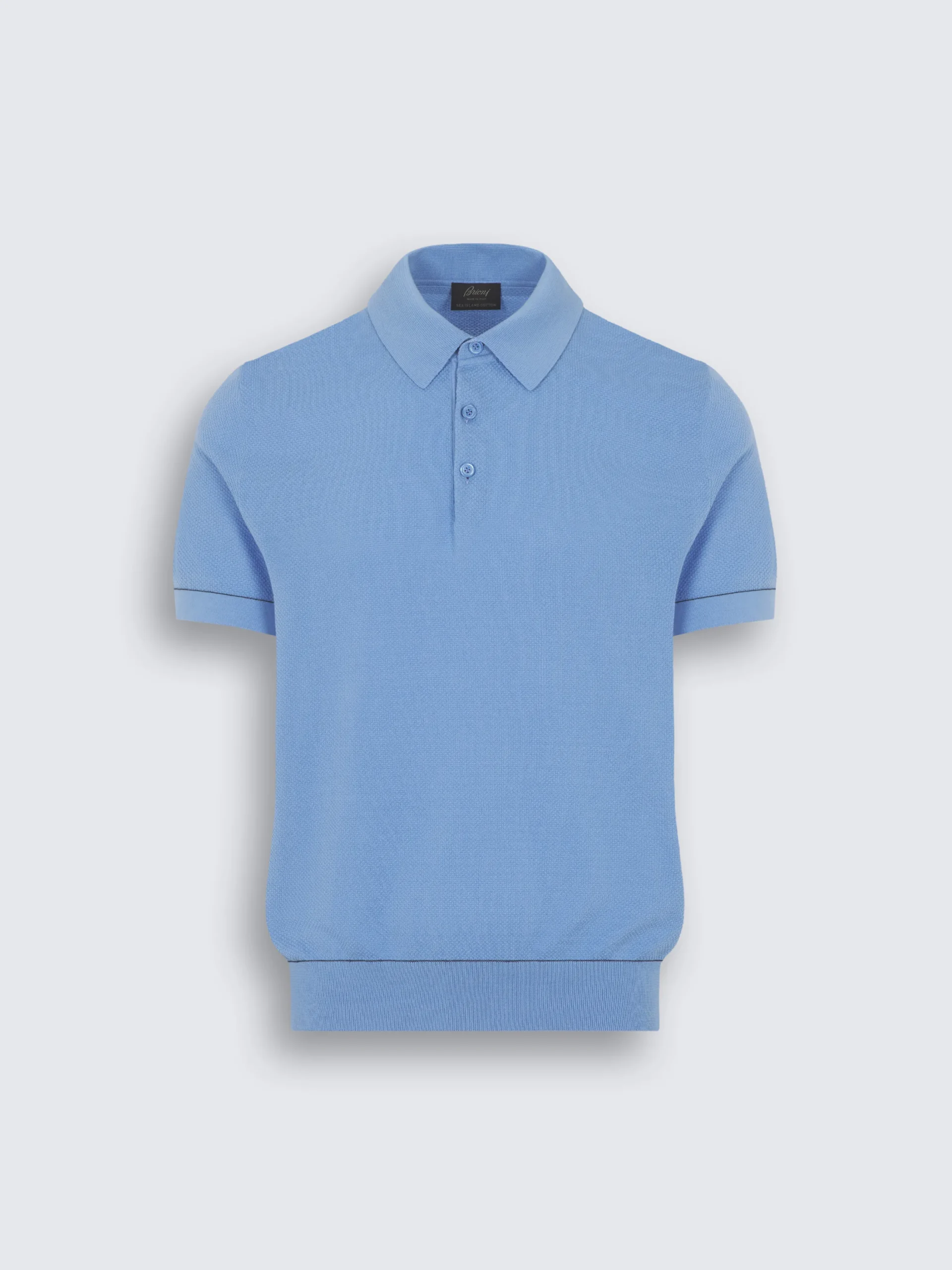 Sky blue Sea Island cotton piqué polo. Featuring a regular fit, mother of pearl buttons, and contrasting colour detail on hem and sleeves. The perfectly detailed piece to layer up for a relaxed yet contemporary look.nSea Island is one of the finest and most sought-after cottons in the world. Grown in limited quantities in the Caribbean, it is renowned for its long staple fibres which allow for a stronger, more resilient yarn, and result in an incredible hand feel, silky to the touch and smooth on the skin.