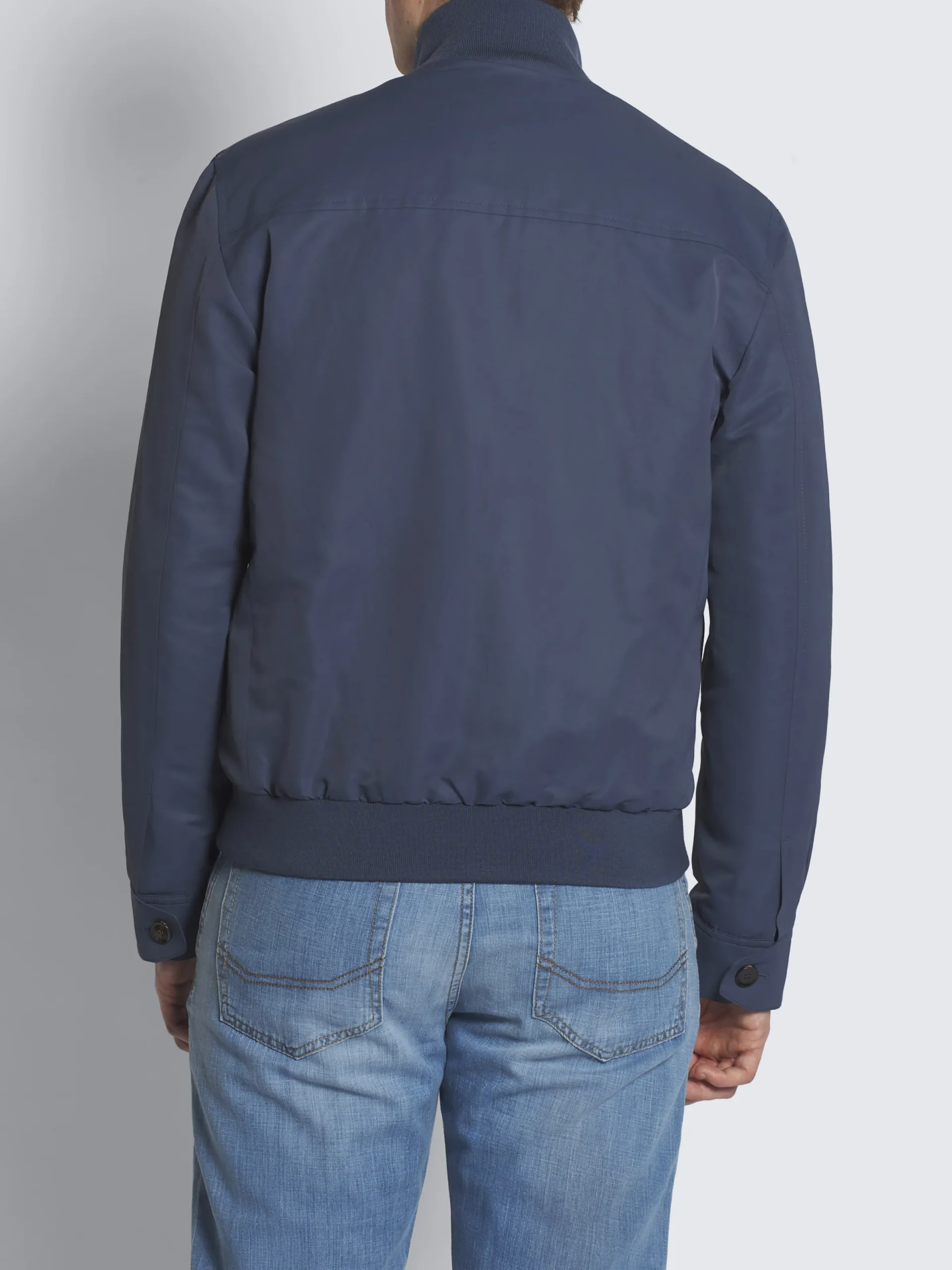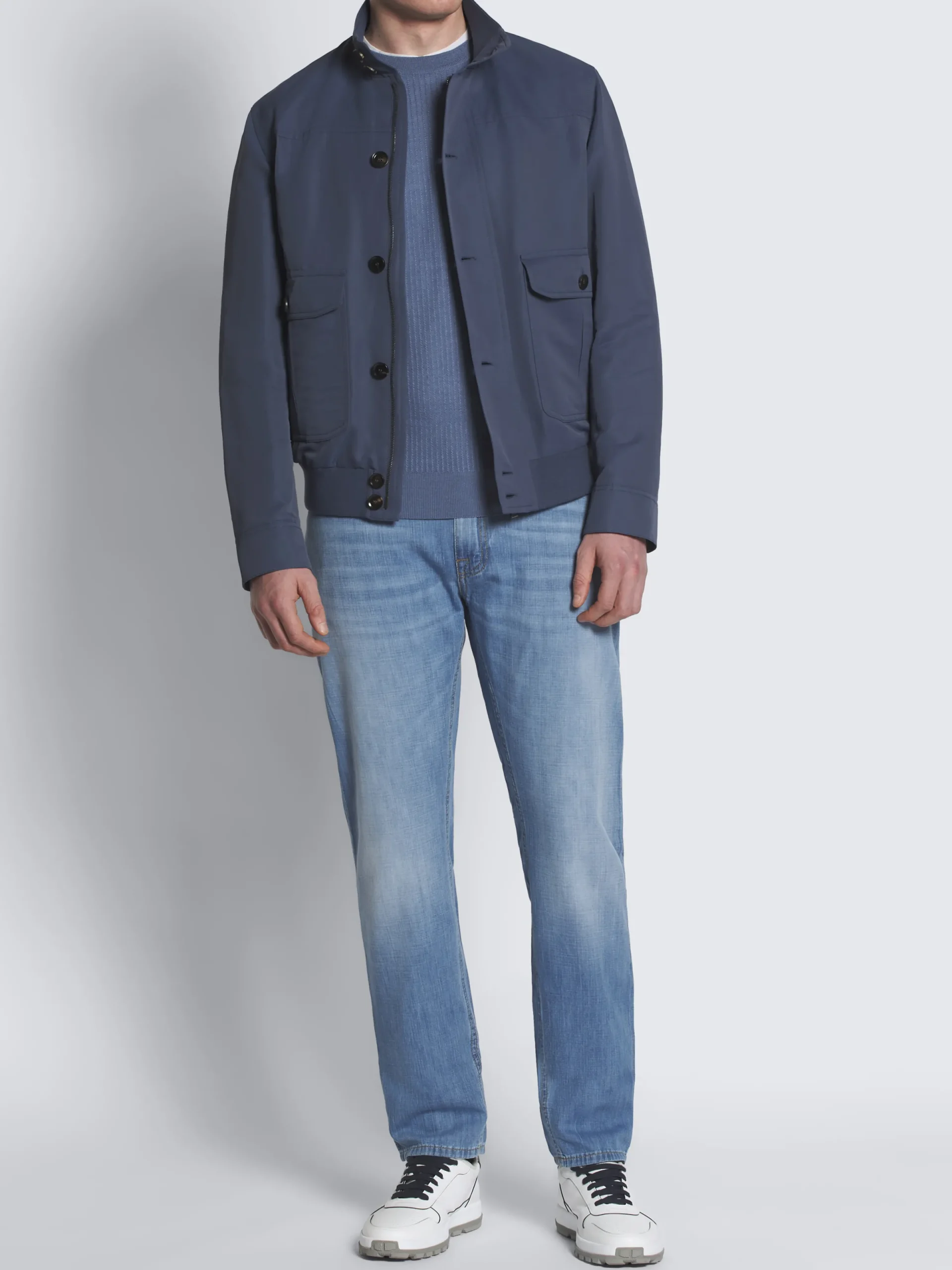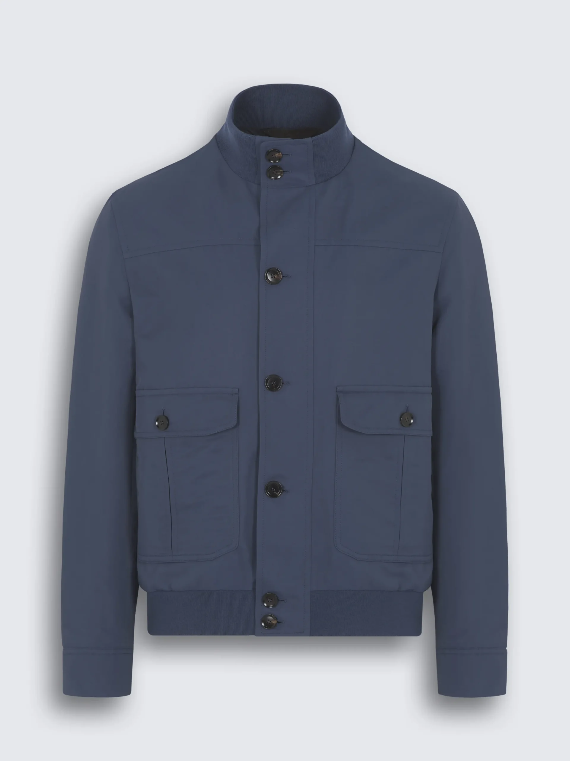 Steel blue technical linen 75 blouson. Featuring a standing ribbed cotton collar, dual zip with metal pullers and horn buttons front closure, bevelled cuffs with button closure and elasticated ribbed hem in cotton. It also presents two front patch pockets with flaps, functional double entry and horn button closure, one internal vertical pocket along the lining and one internal zip pocket. This iconic design is the ideal top layer to add effortless sophistication to your relaxed styles.