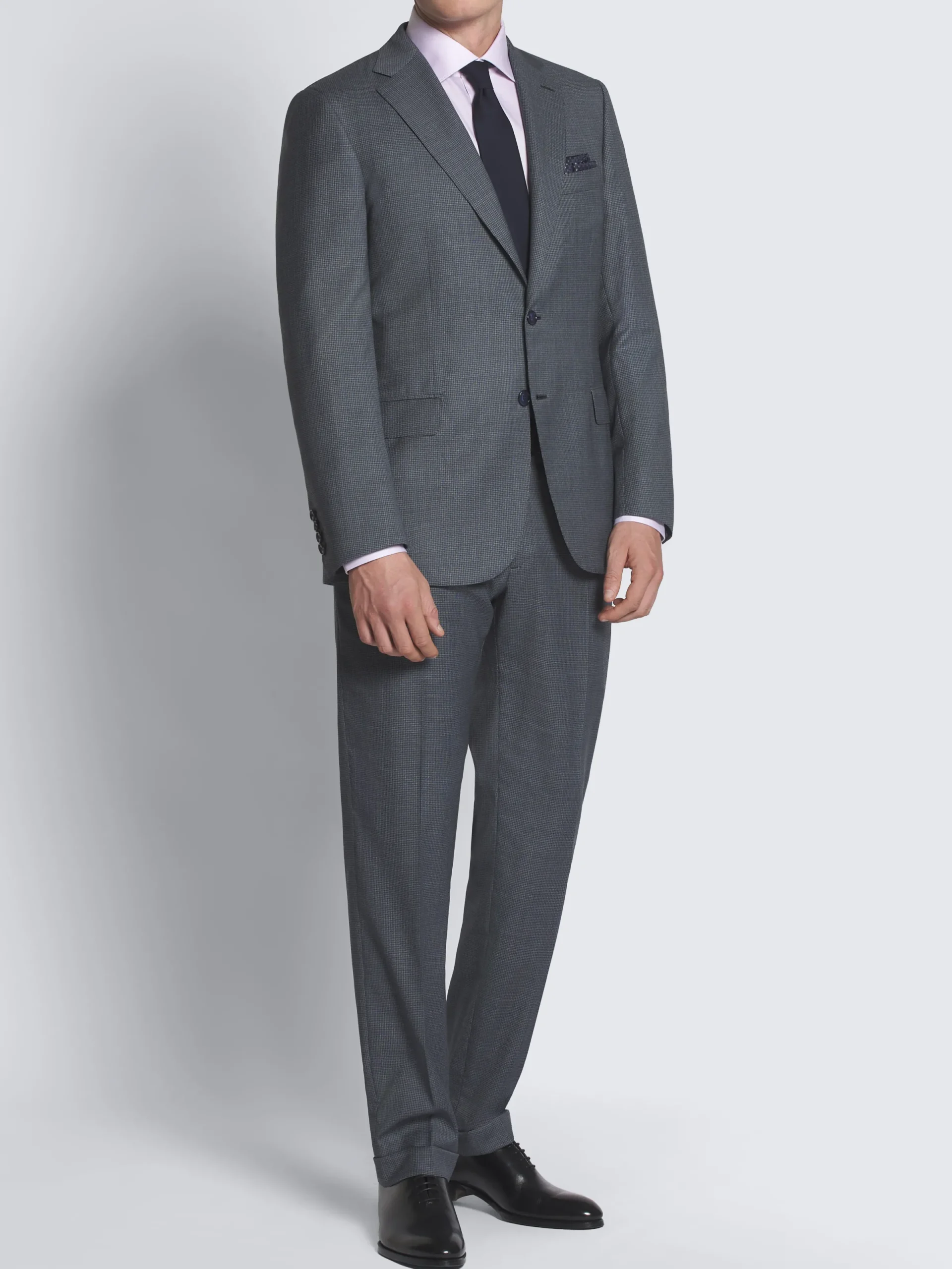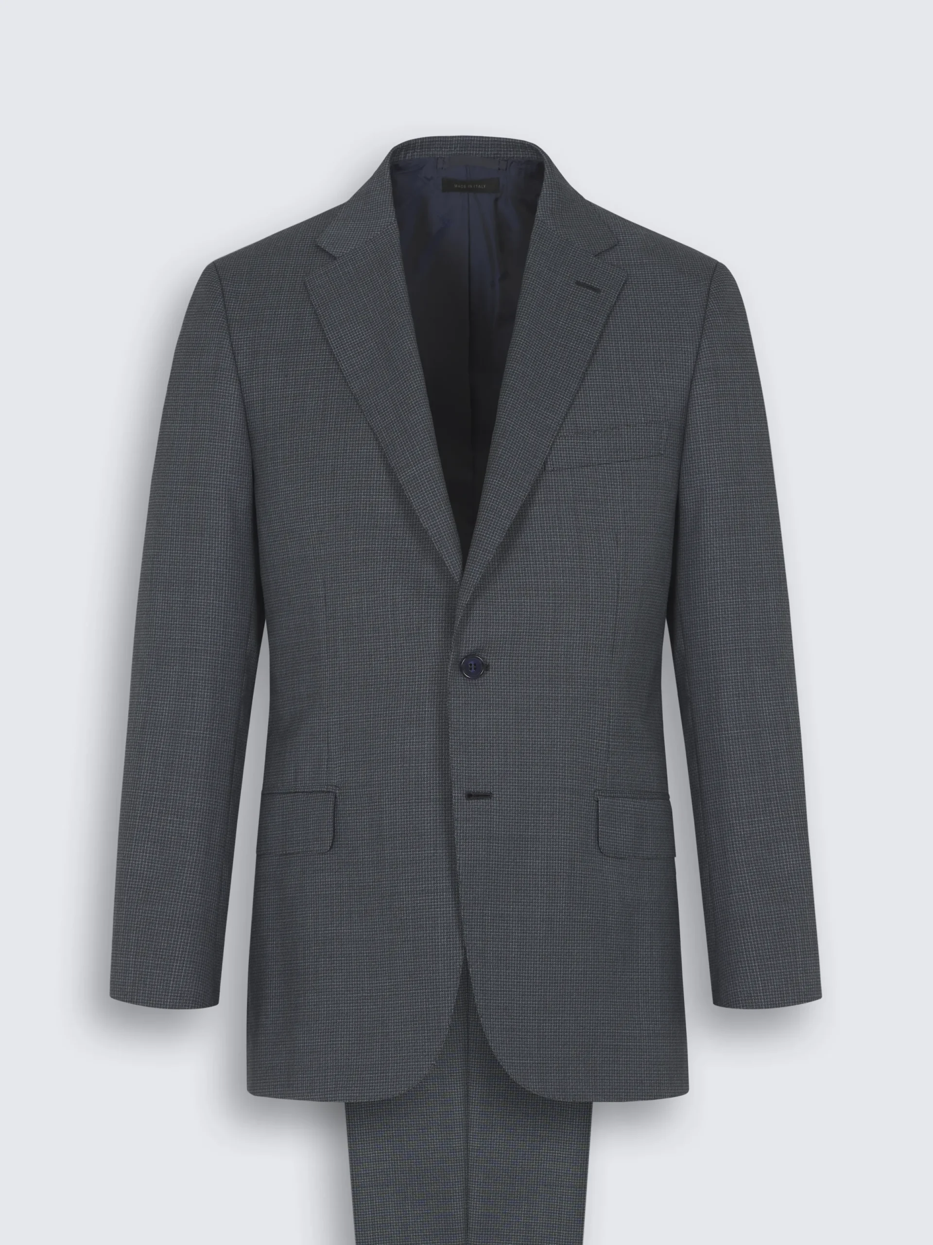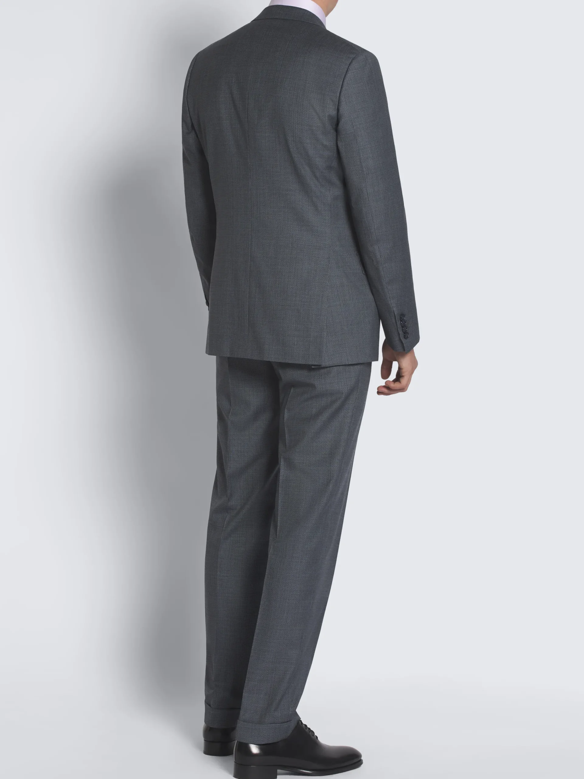 Grey and blue micro-checked Ventiquattro Plus wool Brunico suit. Fully lined, featuring a regular fit with eased armhole construction, notch lapels, two back vents, one chest pocket, two flap pockets, two internal jet pockets and one internal pocket with button closure. The trousers feature two side slant pockets, two back pockets with button closure and belt loops. Since its launch in 2010, the Brunico suit has become a staple. With its classic fit and handmade construction, it’s the expression of Brioni tailoring excellence.