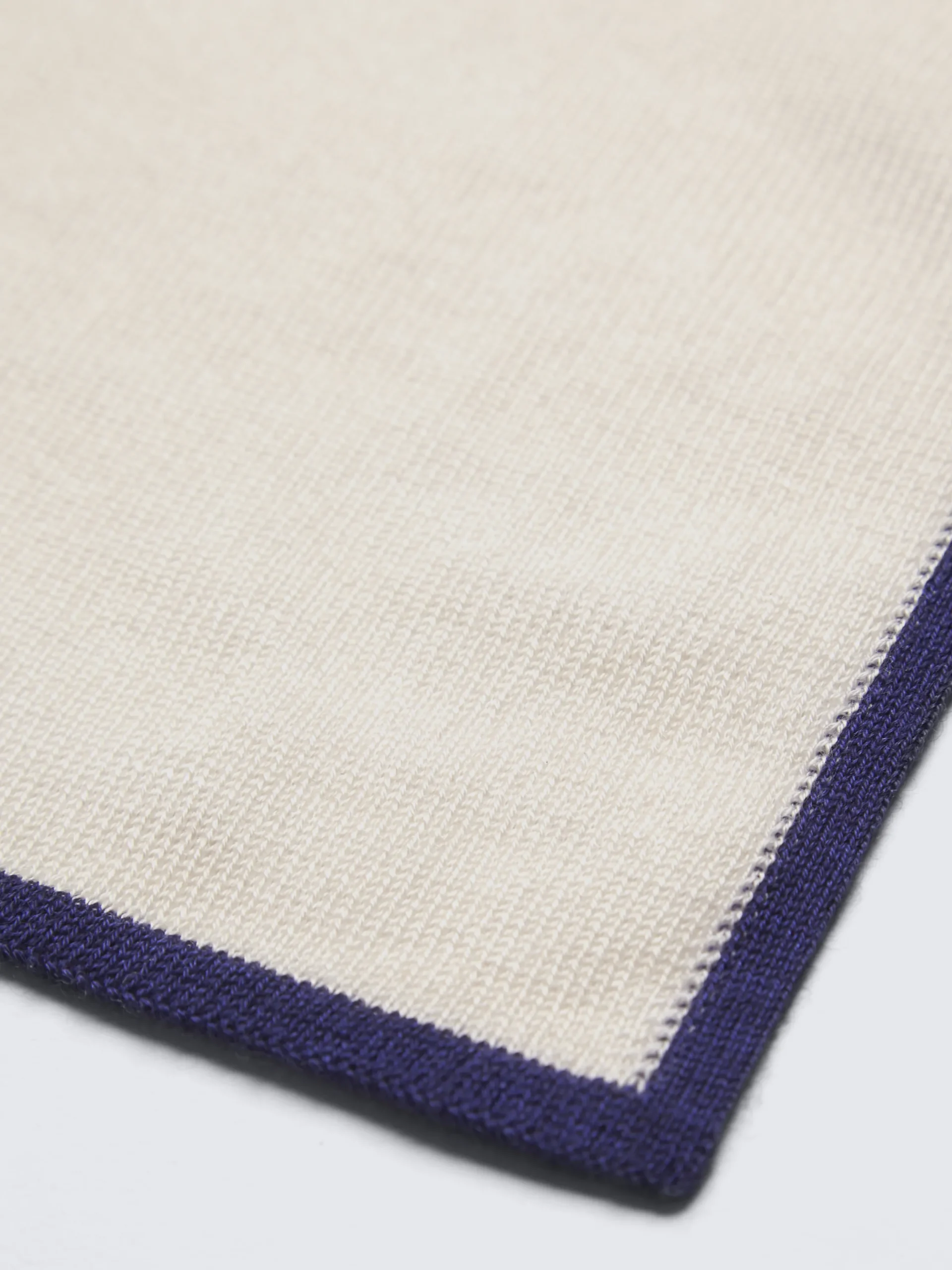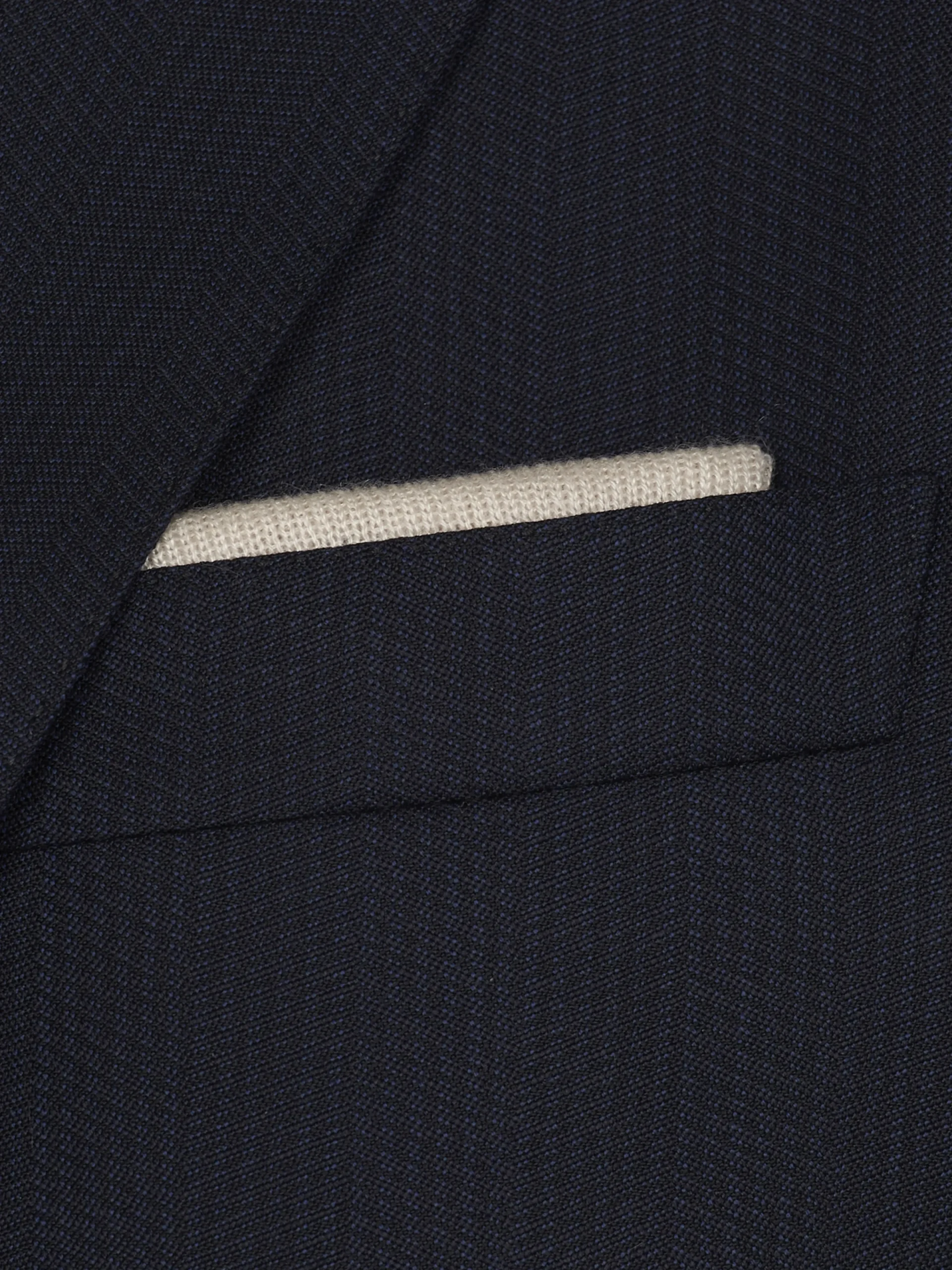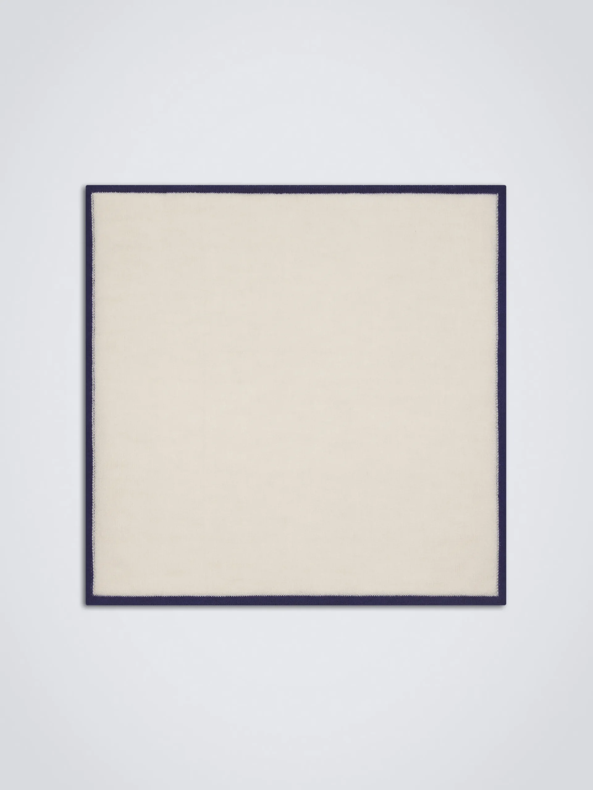 Inspired by our famous tie world, this ivory white and royal blue pocket square is made in a super fine and soft cashmere and silk blend. Its particular texture is obtained thanks to a tubular machine, which allows the silk threads to maintain extreme softness and vivid colours. Considered as an ‘out-of-the-box’ accessory, this special piece, will add an original and modern touch to your formal suit or jacket.