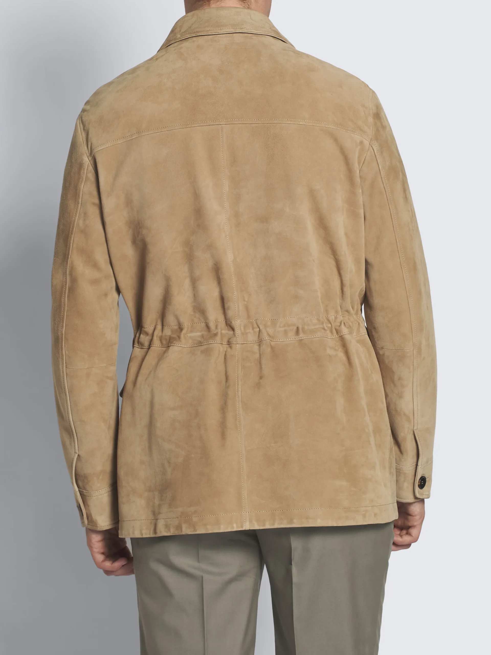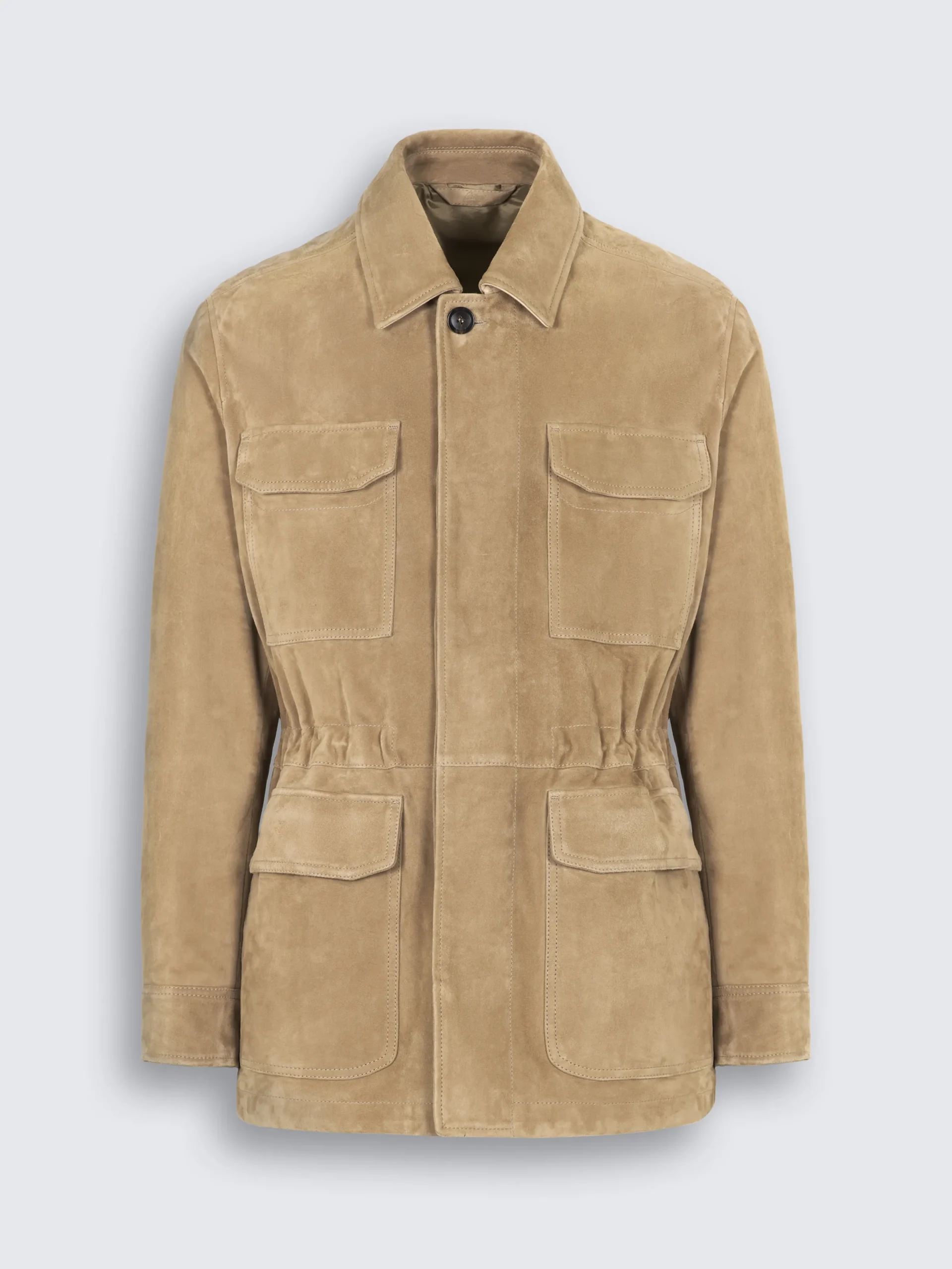 Beige suede sahariana jacket. Featuring a shirt collar, zip with metal pullers and hidden horn buttons front closure, four patch pockets with bevelled shape flaps and hidden button closure, one internal zip pocket and bevelled shape cuffs with horn buttons. The details of this piece render it a true staple: a visible top horn button, backing buttons along the closure to secure the front ones and hide the seams, double entry on the low pockets, and nappa leather undercollar with bevelled shape logo patch. An internal adjustable waist drawcord will allow you to adapt the fitting to your body. The Pieno Fiore construction enhances the inner side of this garment with a lambskin layer that has not undergone any treatments altering its surface, preserving its full-grain texture and natural marks, and delivering a pristine and impeccable finish. Half lined for a smoother wearability, it is the perfect final layer to elevate any leisure look.